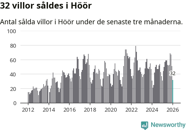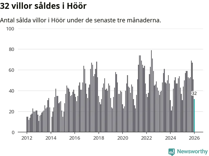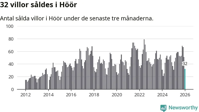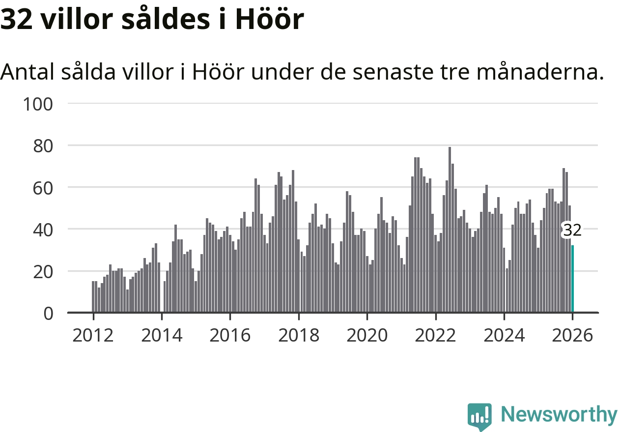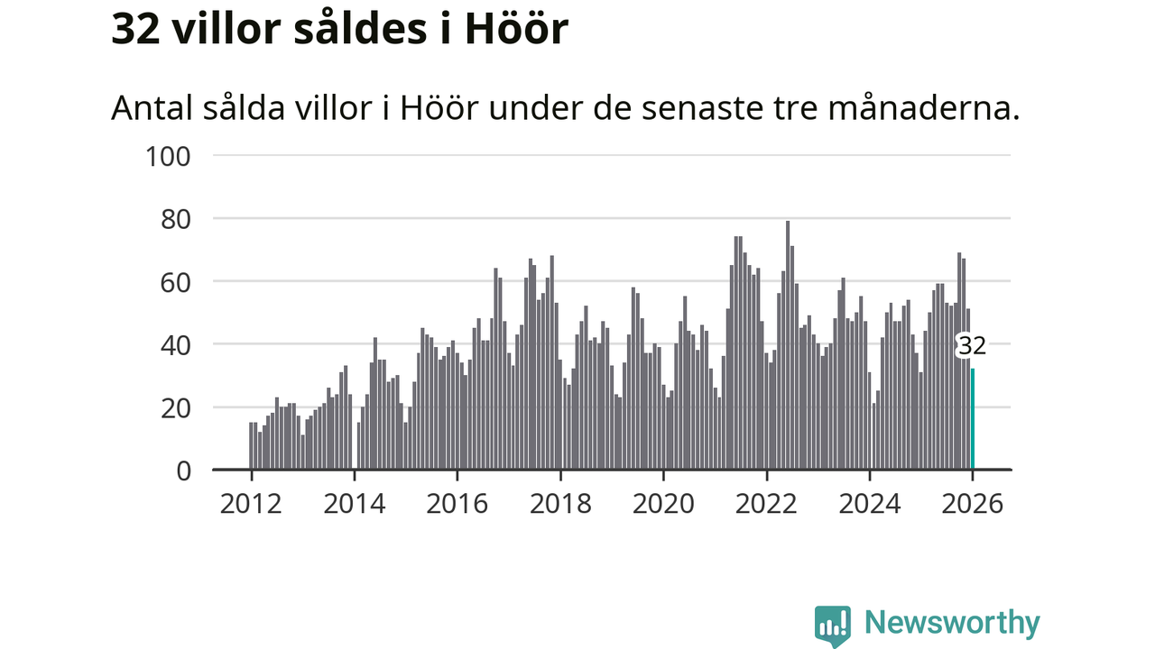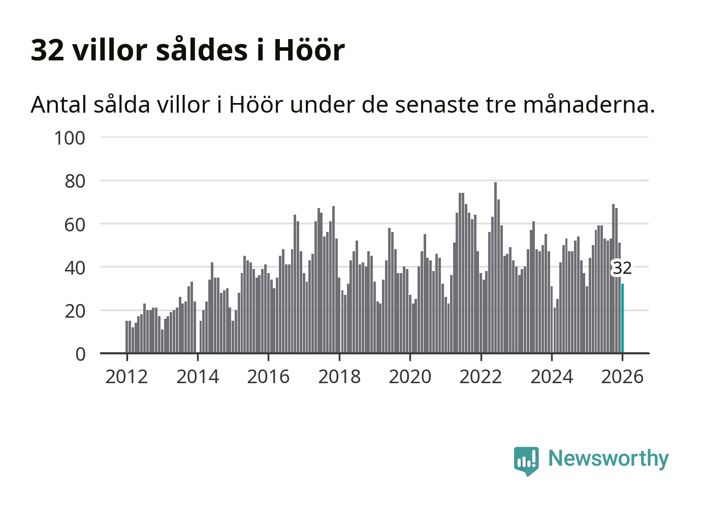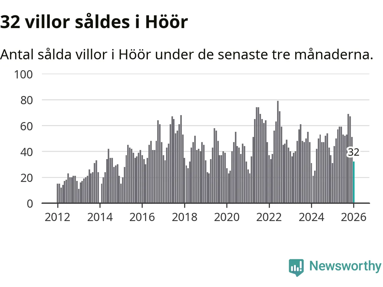 Sammanlagt såldes 32 villor i Höörs kommun mellan november och januari till ett genomsnittligt pris på 2,6 miljoner kronor. I fjol gjordes 31 affärer vid den här tiden på året.