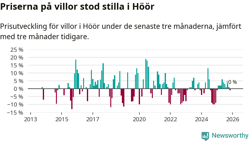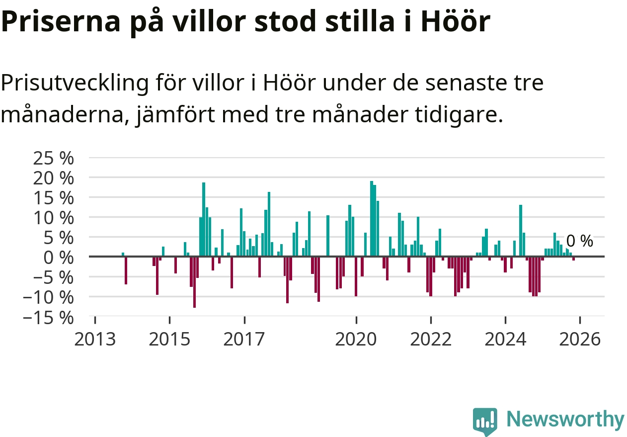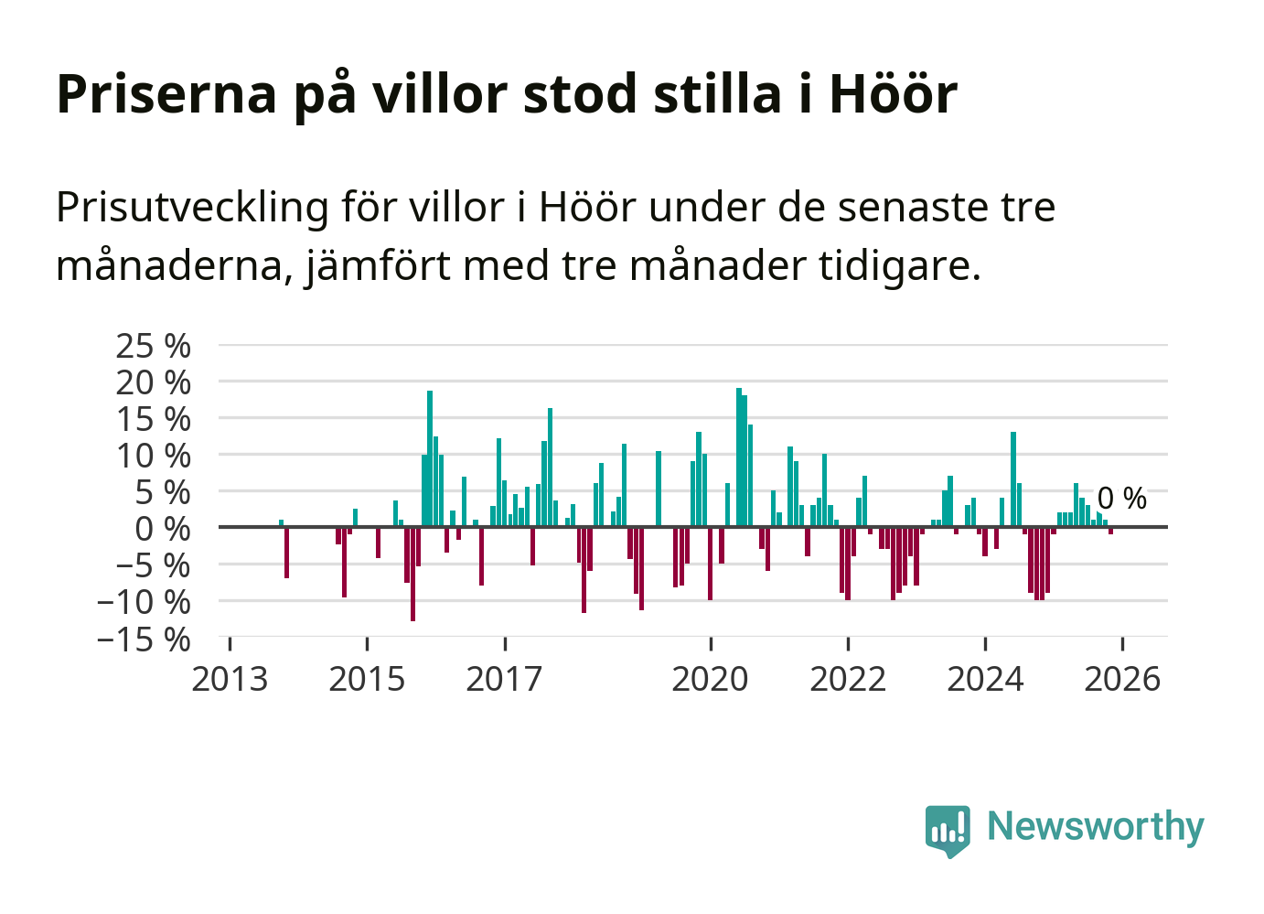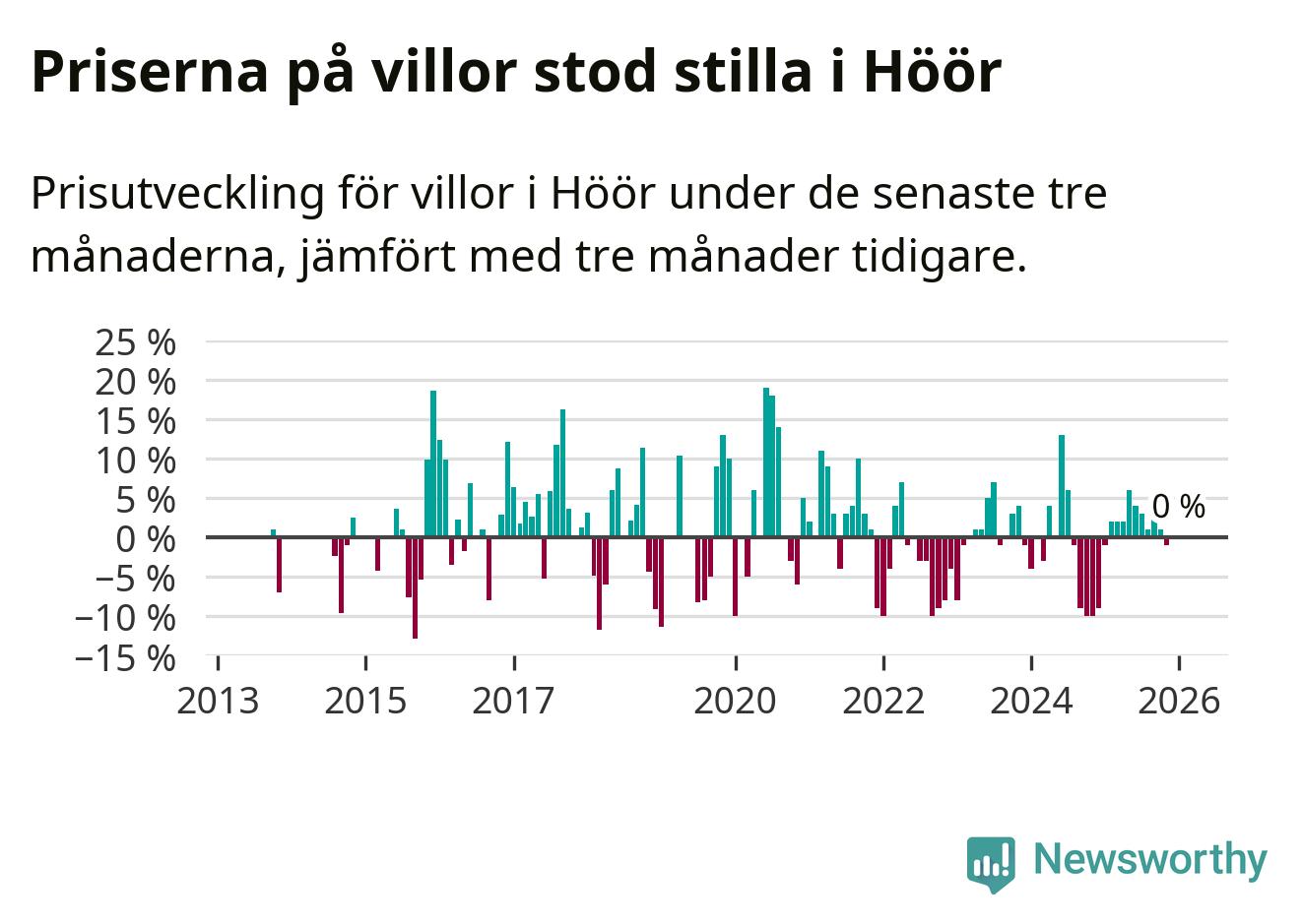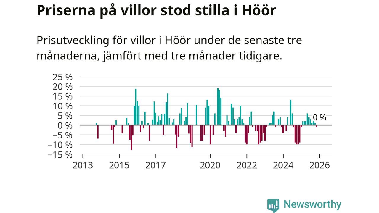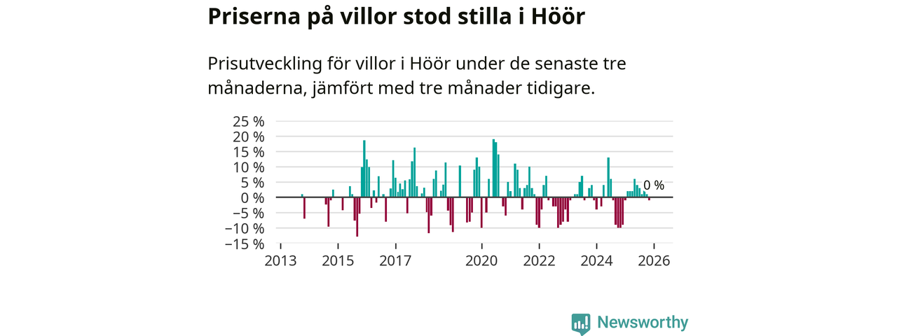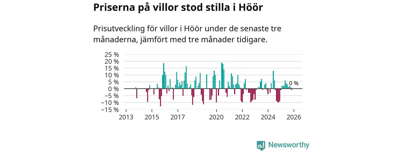 Villapriserna står i stort sett stilla i Höörs kommun. Medelpriset på de på försäljningarna under de senaste tre månaderna låg på samma nivå som för tre månader sedan.