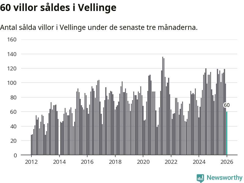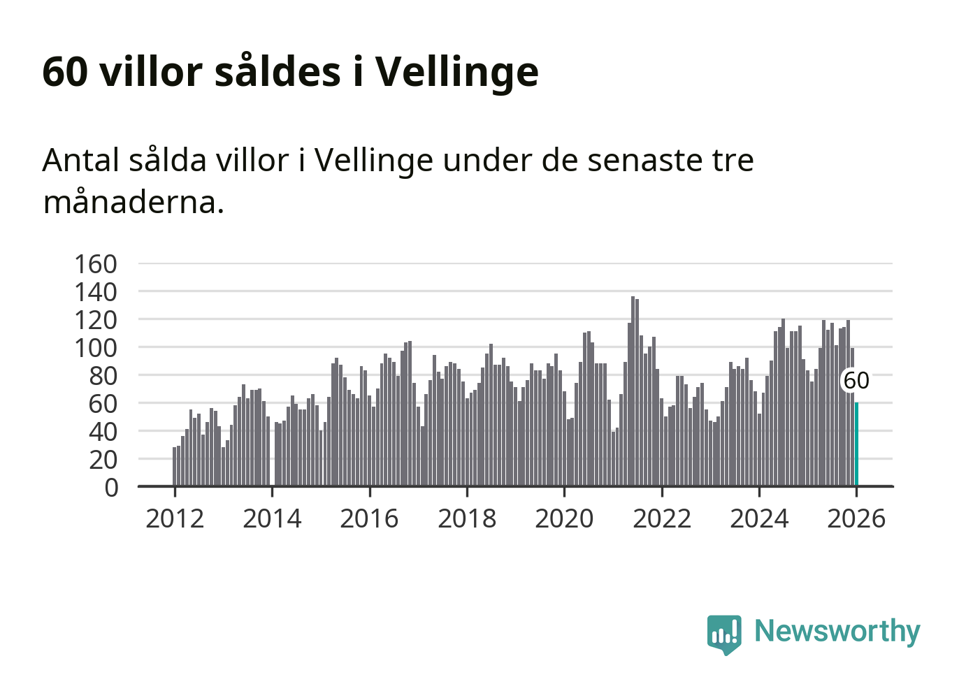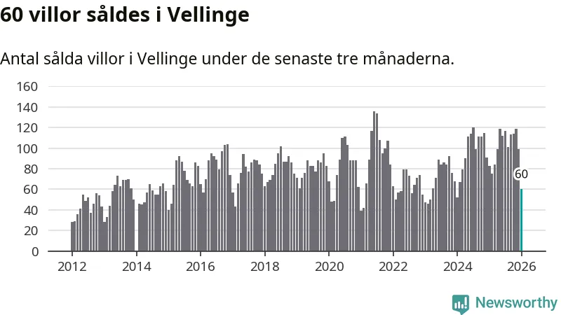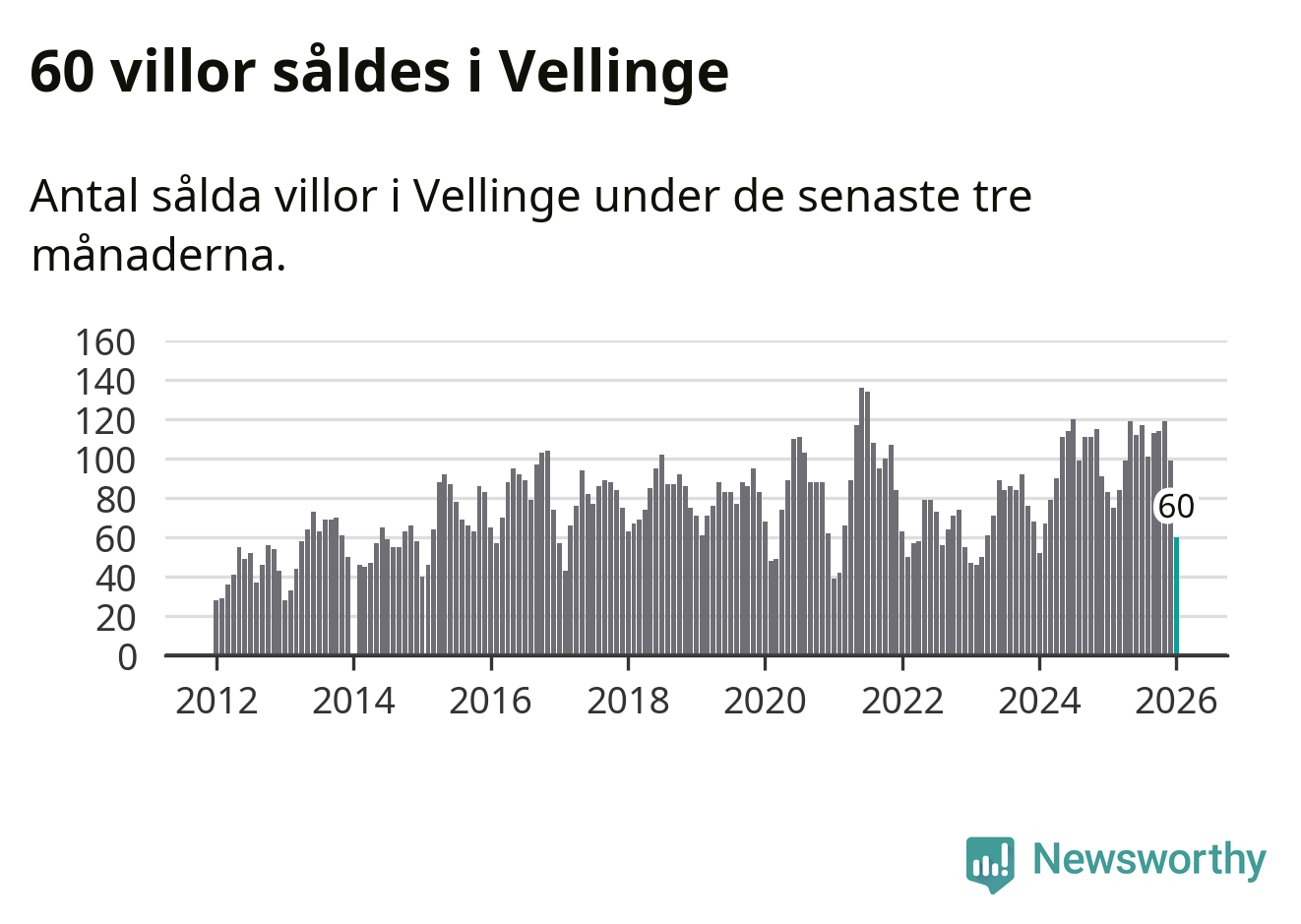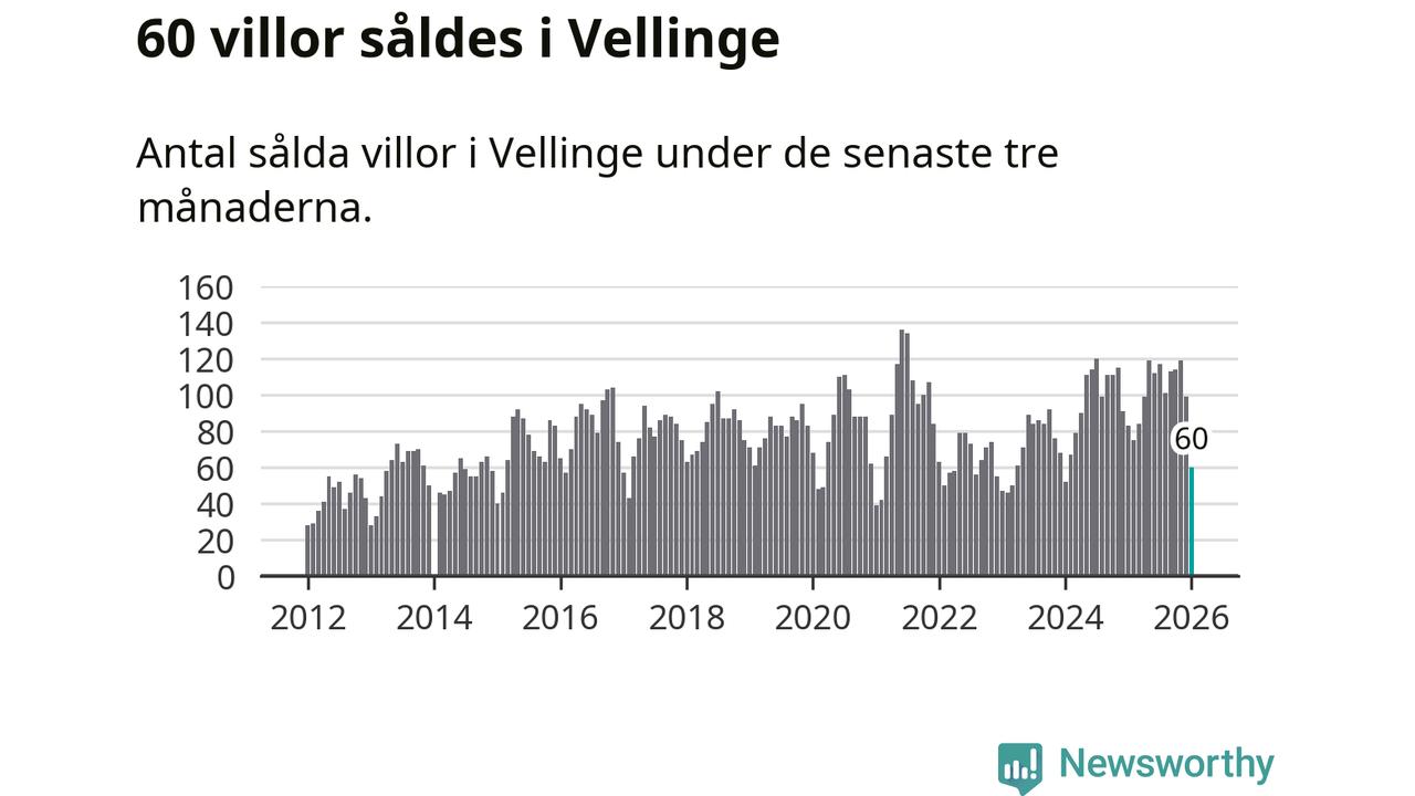 Sammanlagt såldes 60 villor i Vellinge kommun mellan november och januari till ett genomsnittligt pris på 8,4 miljoner kronor. I fjol gjordes 83 affärer vid den här tiden på året.