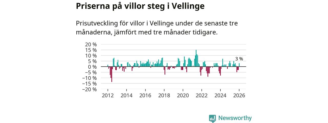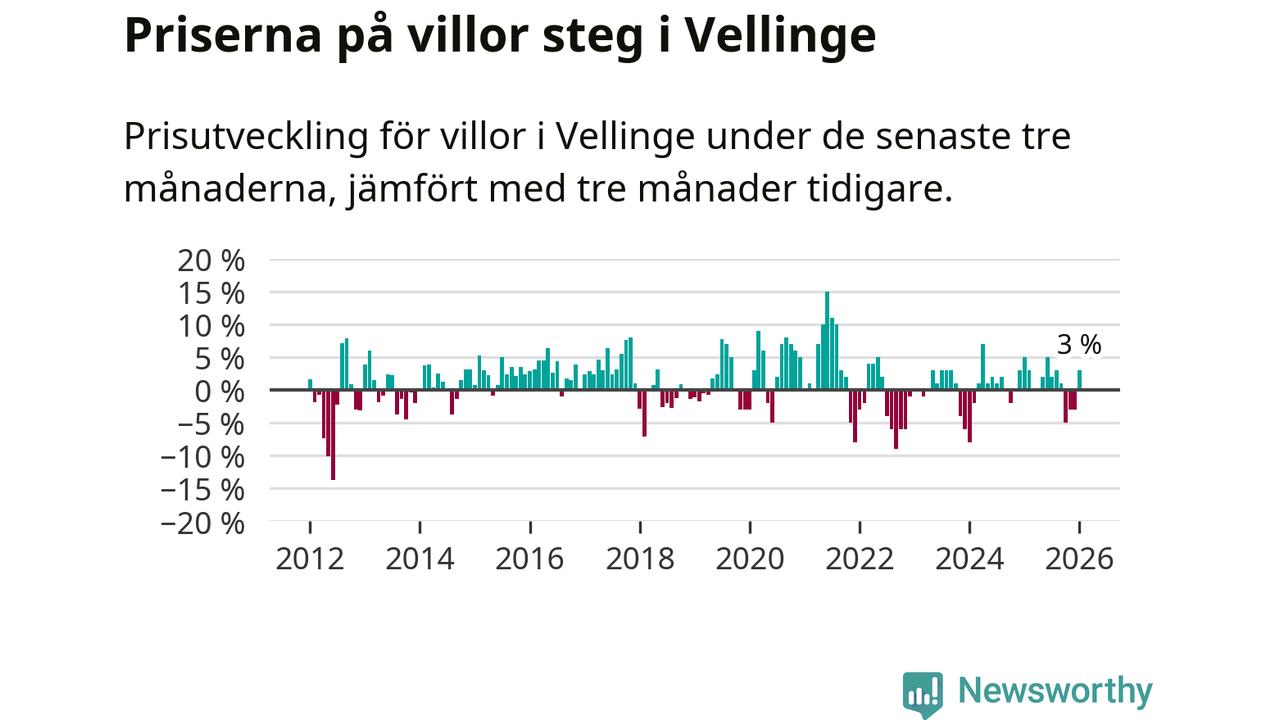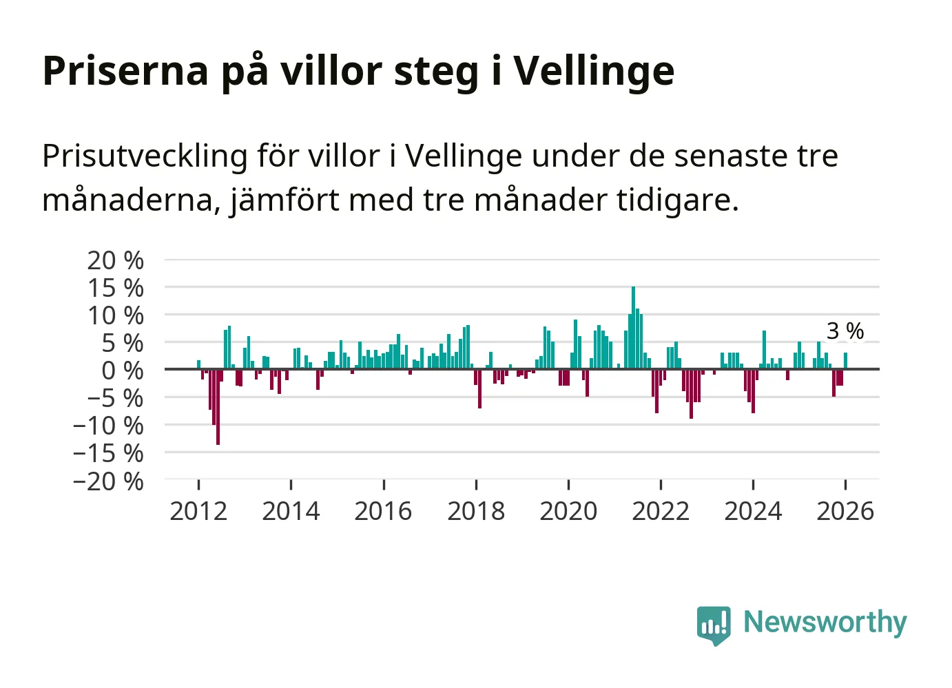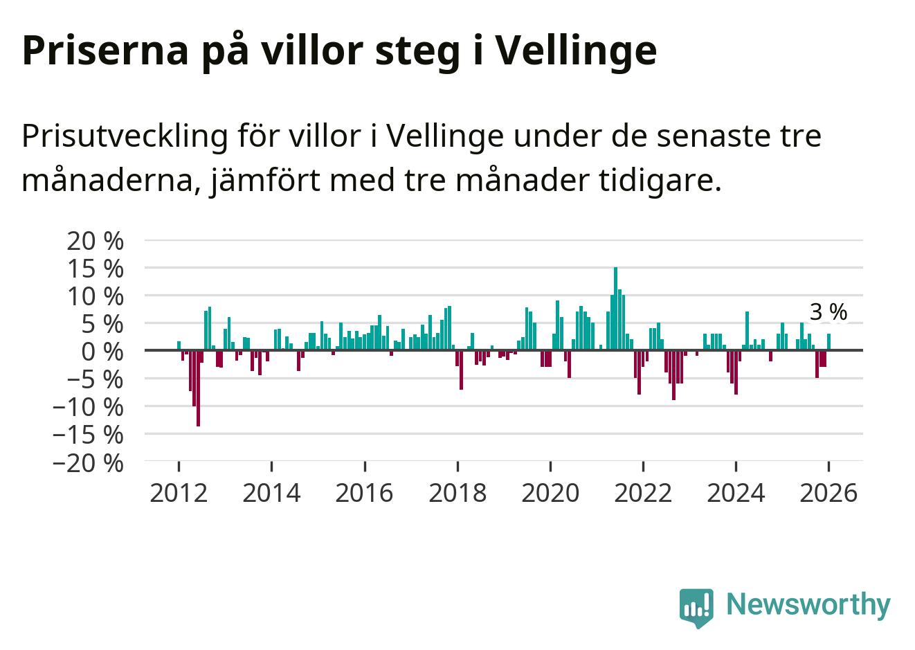 Villapriserna har gått upp i Vellinge kommun. Medelpriset på försäljningarna under de senaste tre månaderna visar på en uppgång med 3 procent.