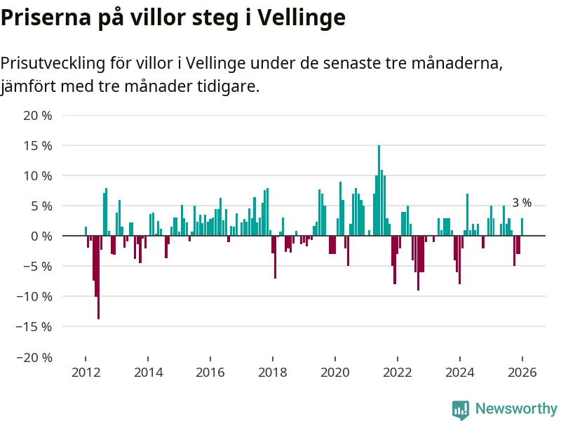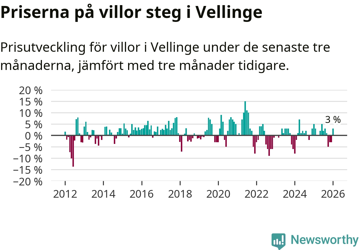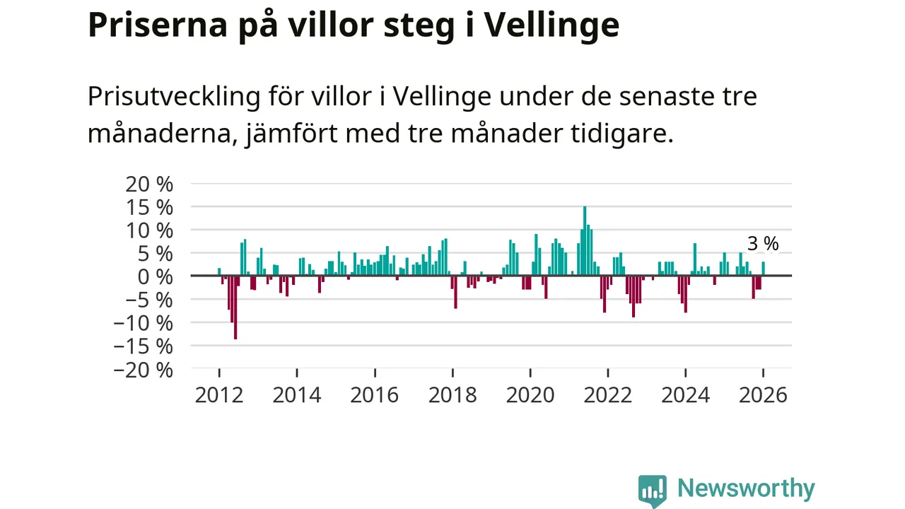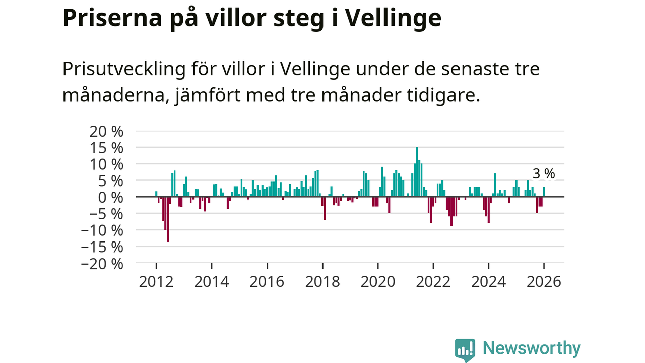 Villapriserna har gått upp i Vellinge kommun. Medelpriset på försäljningarna under de senaste tre månaderna visar på en uppgång med 3 procent.