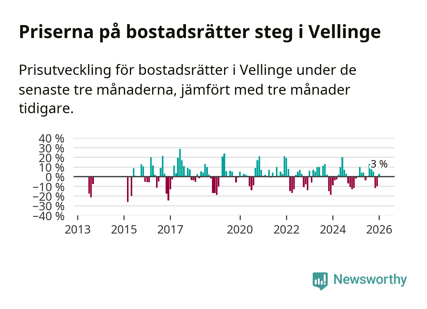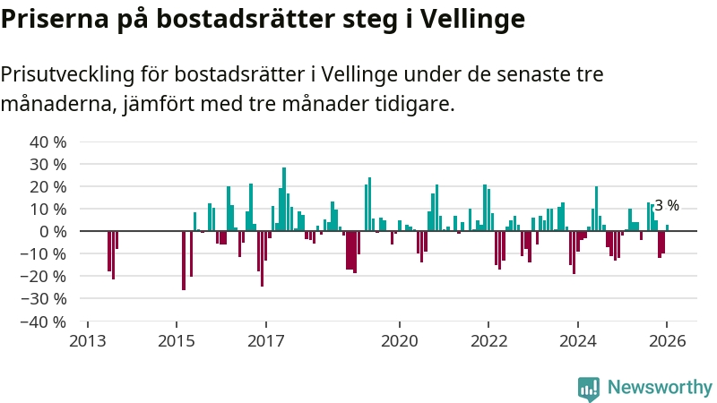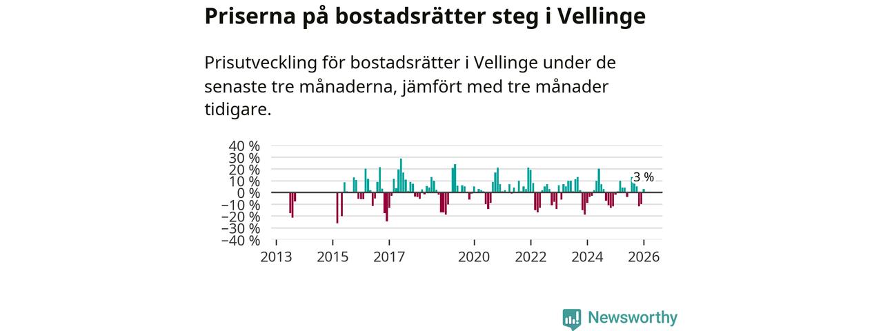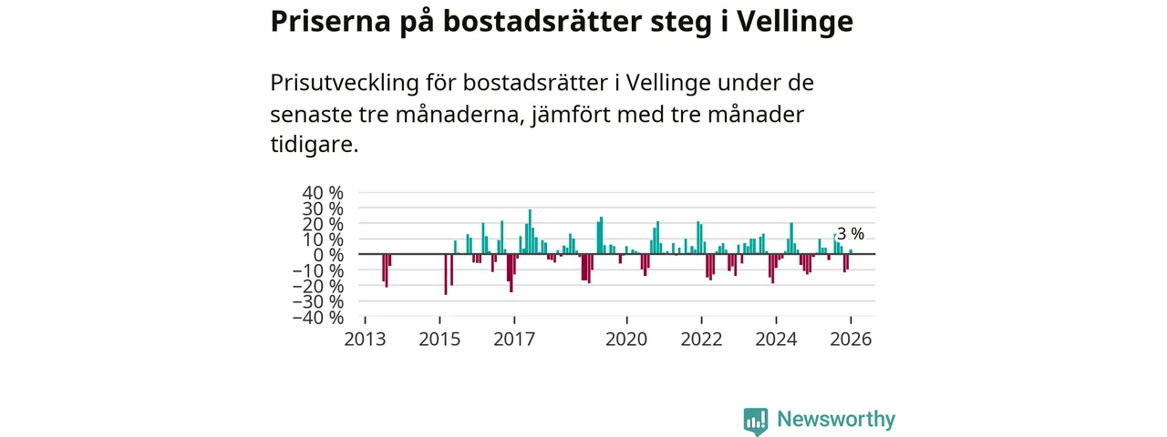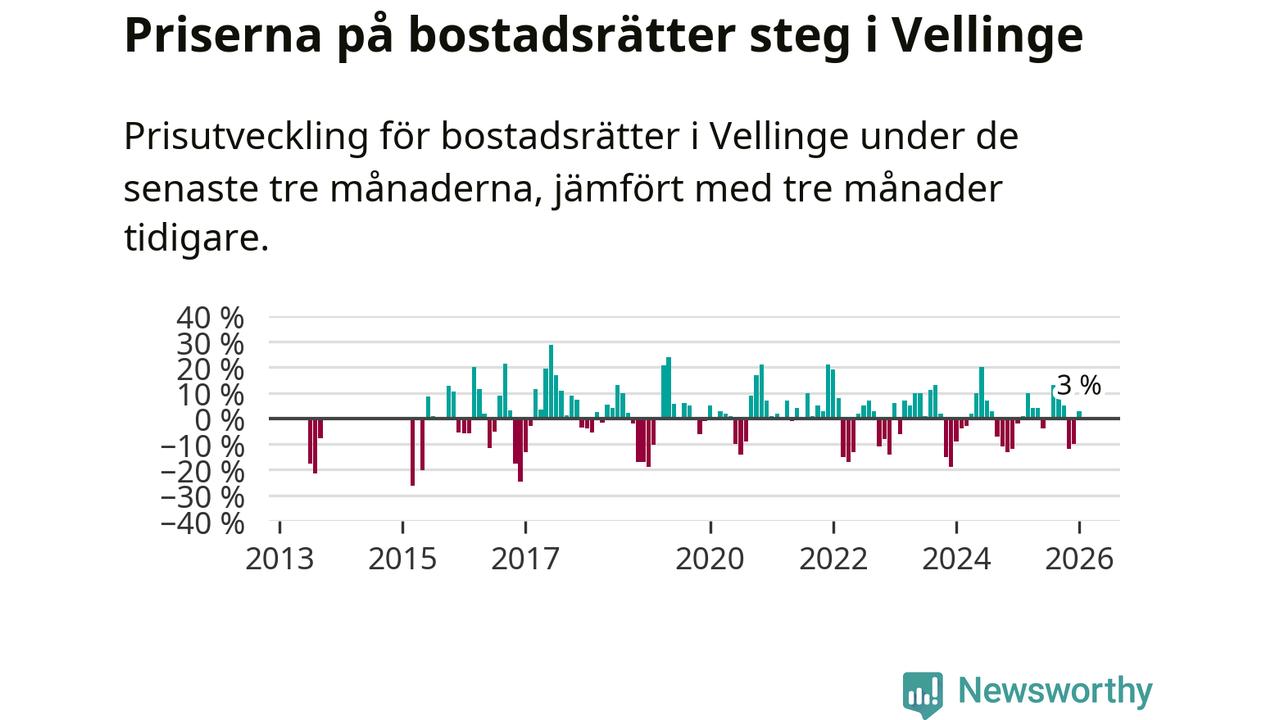 Priserna på bostadsrätter har gått upp i Vellinge kommun. Medelpriset på försäljningarna under de senaste tre månaderna visar på en uppgång med 3 procent.