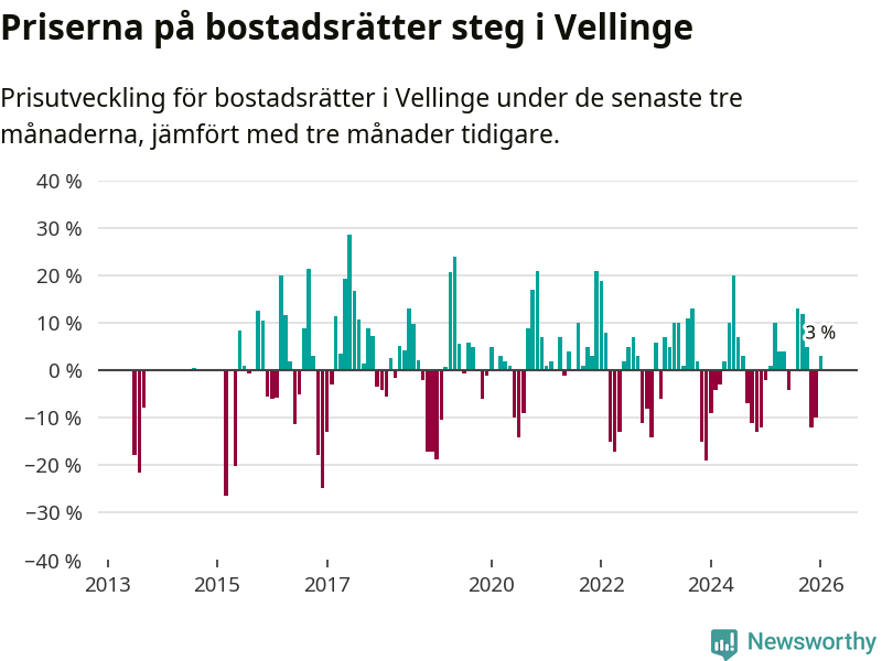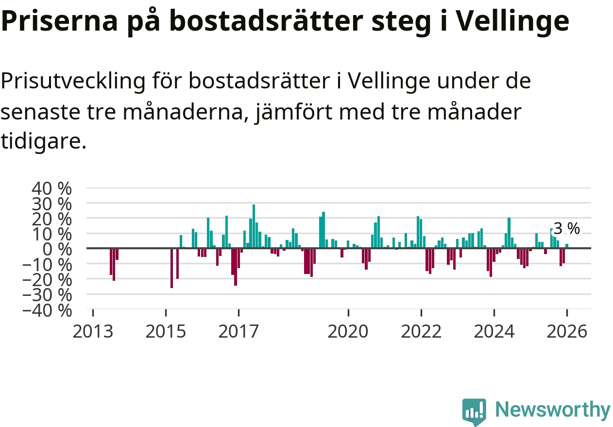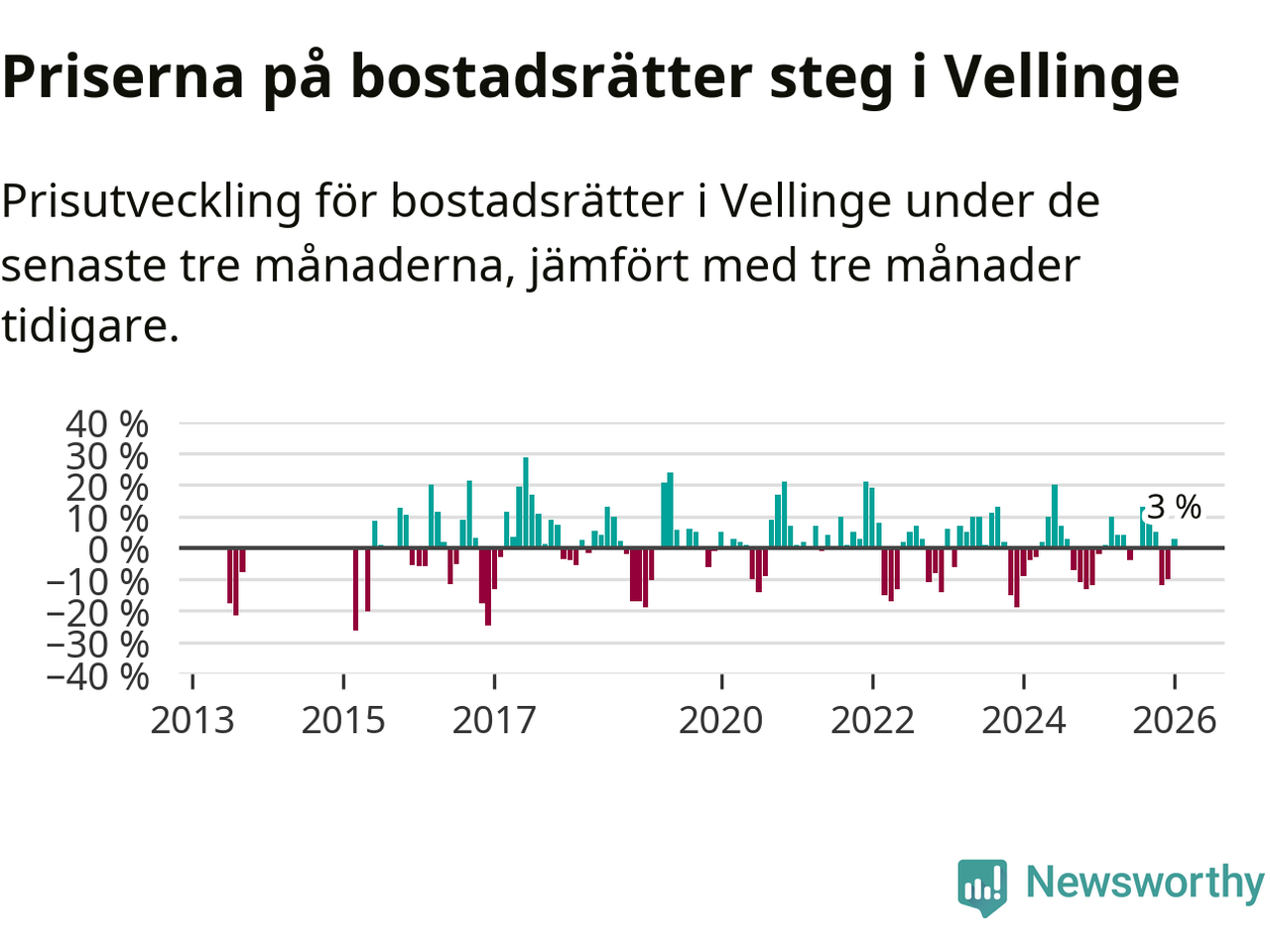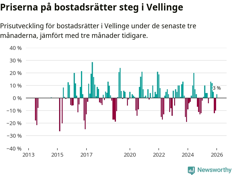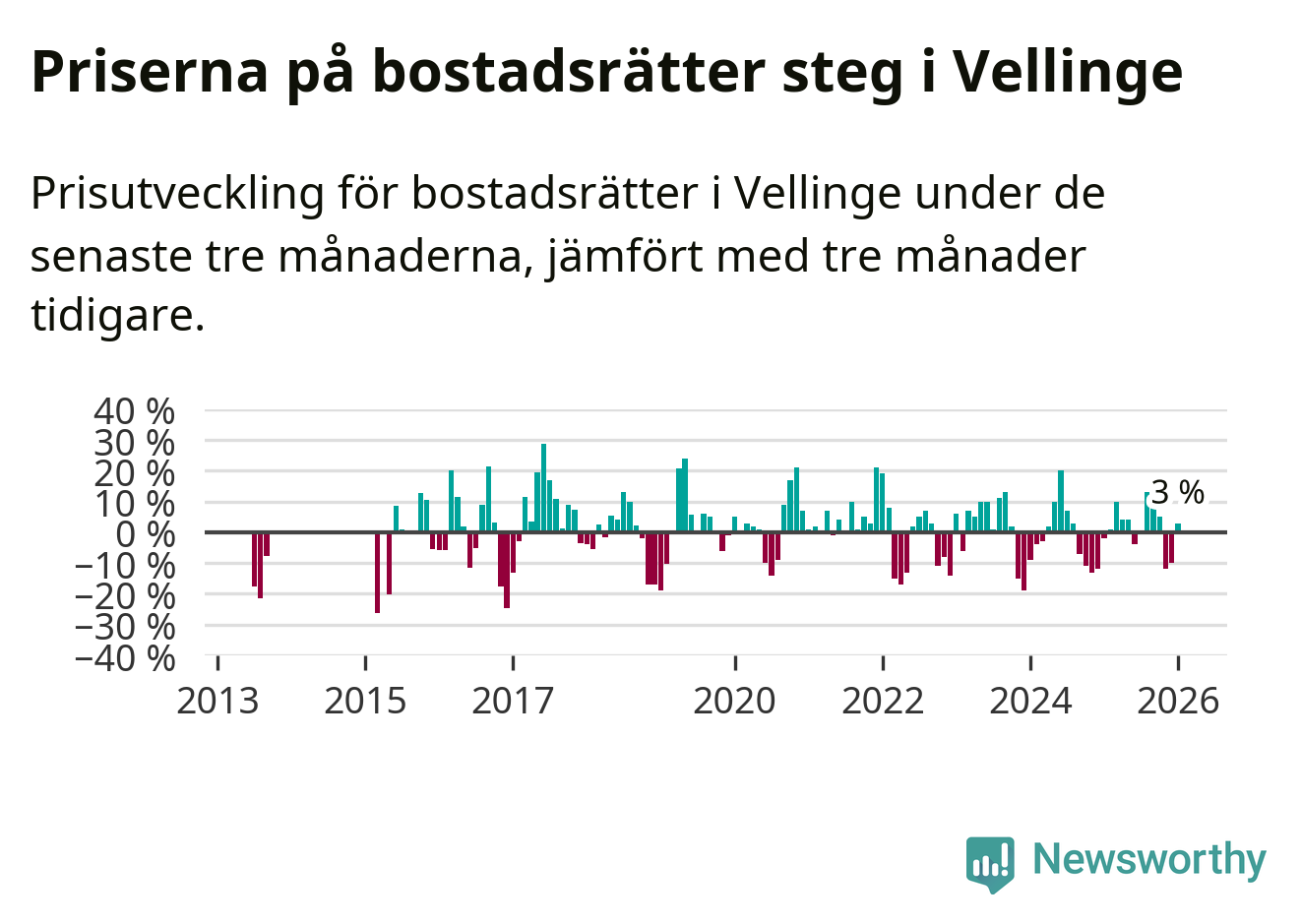 Priserna på bostadsrätter har gått upp i Vellinge kommun. Medelpriset på försäljningarna under de senaste tre månaderna visar på en uppgång med 3 procent.