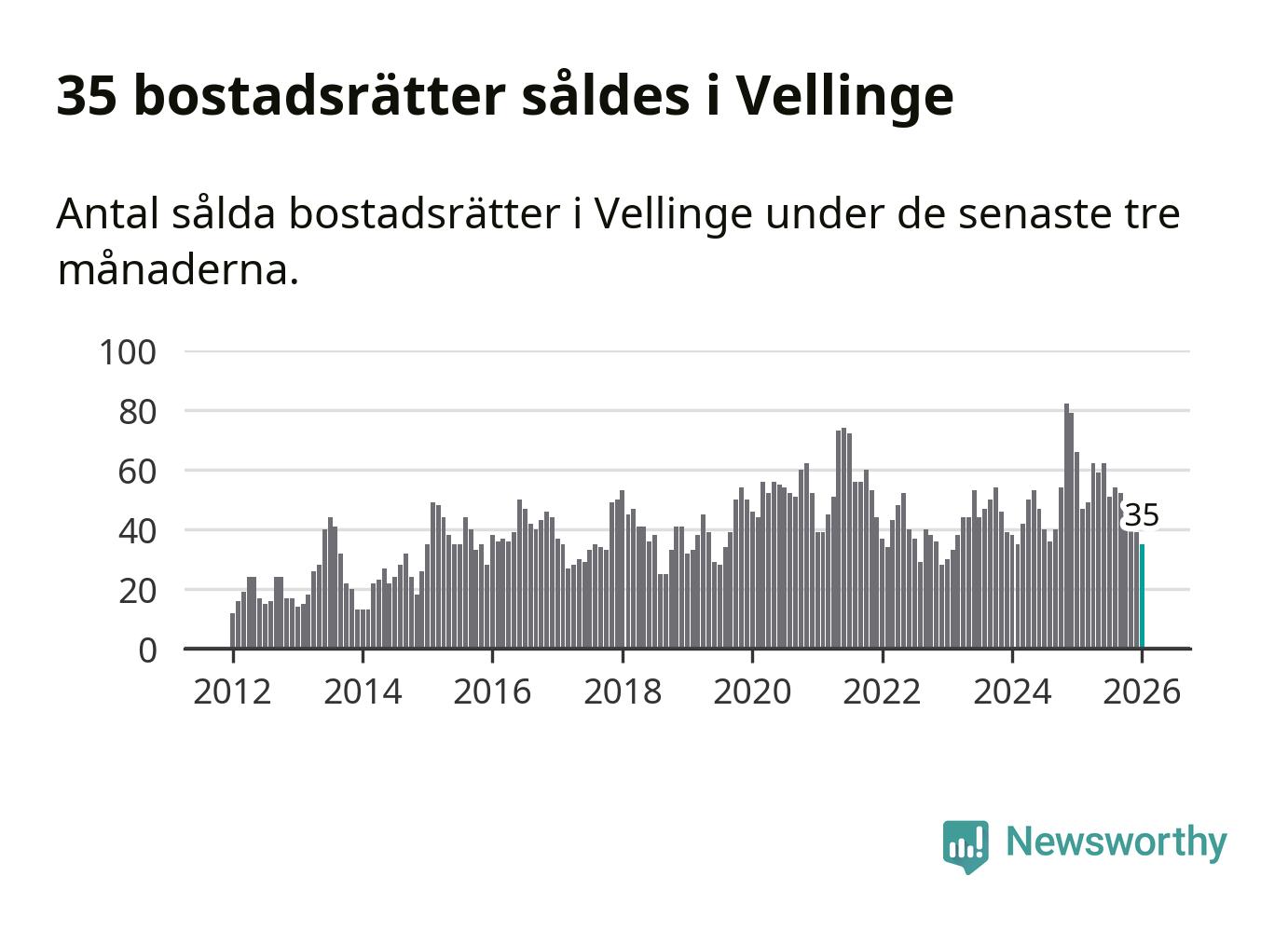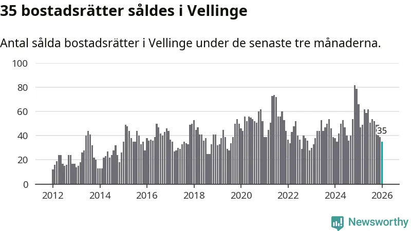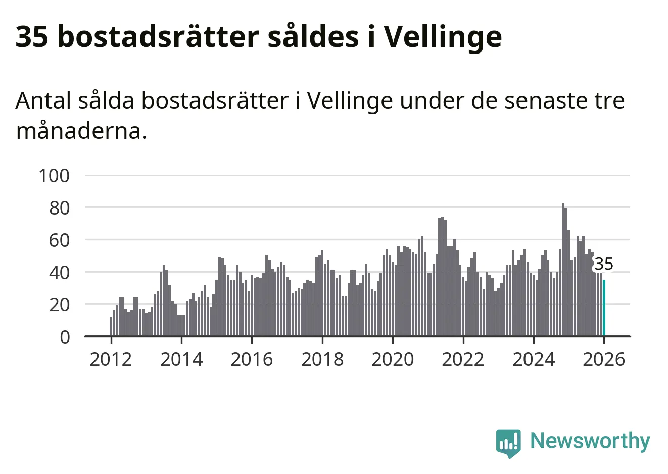 Sammanlagt såldes 35 bostadsrätter i Vellinge kommun mellan november och januari till ett genomsnittligt pris på 3,5 miljoner kronor. I fjol gjordes 66 affärer vid den här tiden på året.