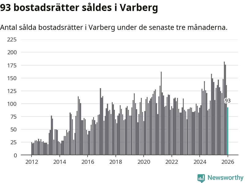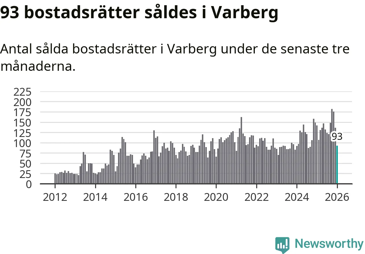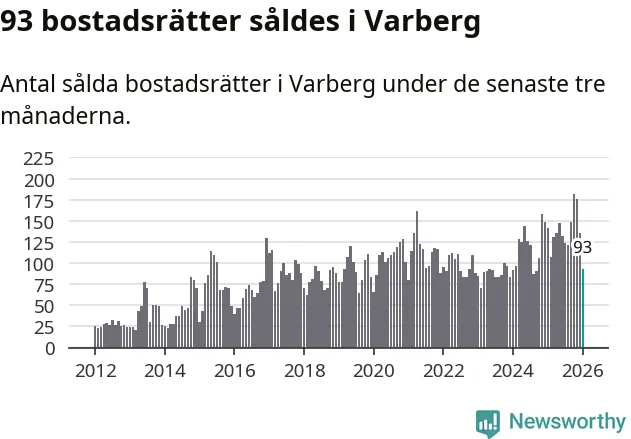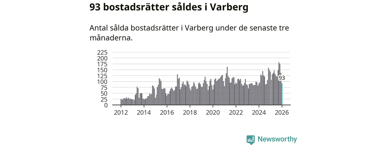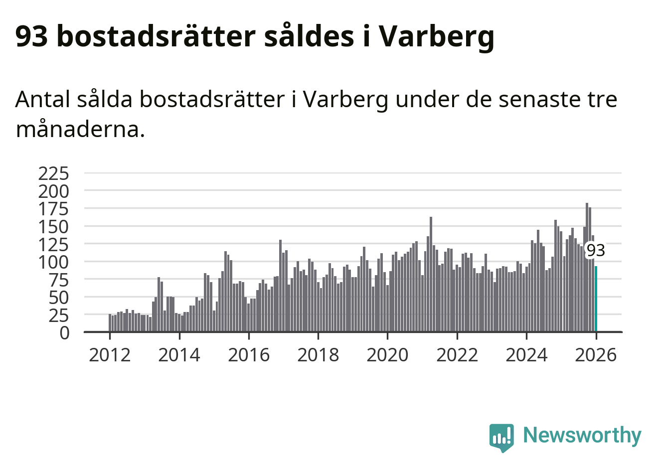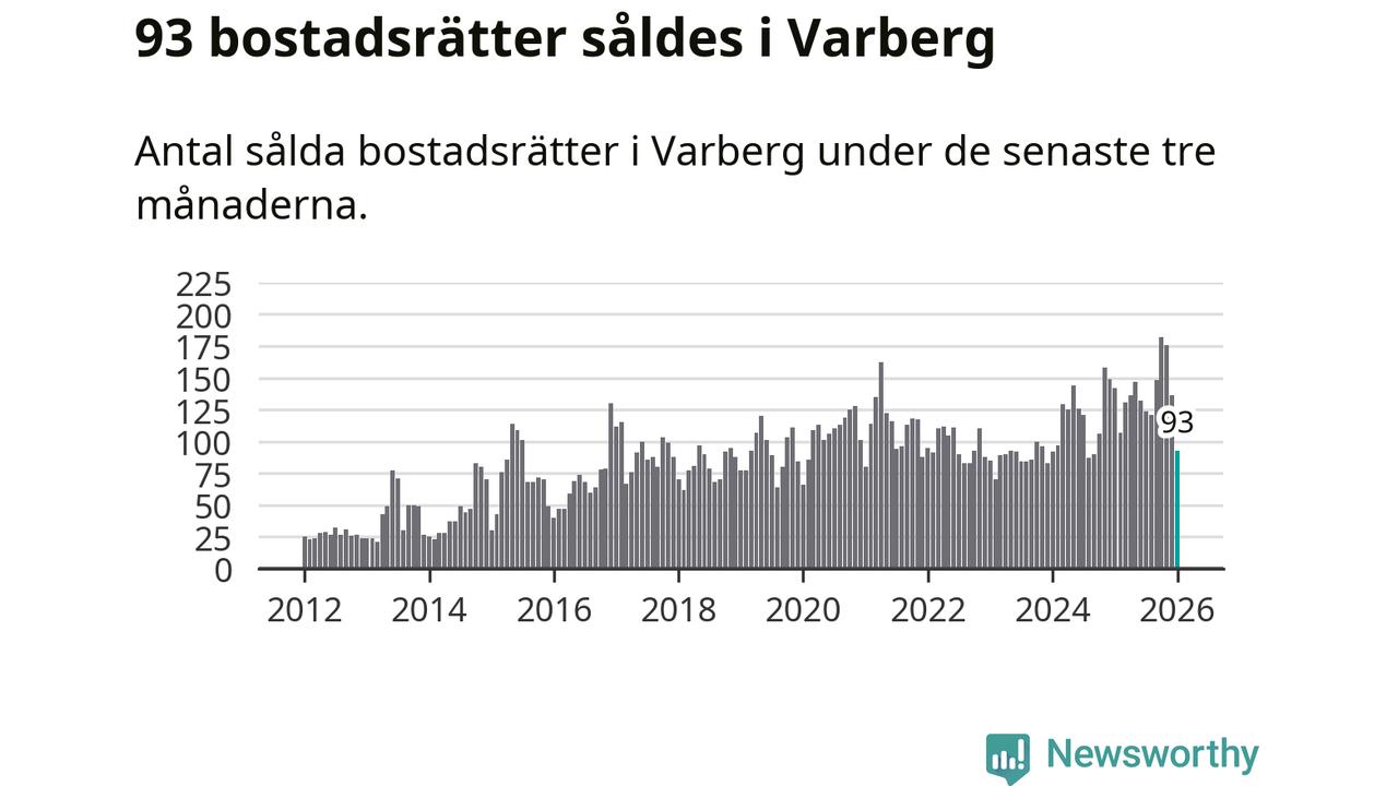 Sammanlagt såldes 93 bostadsrätter i Varbergs kommun mellan november och januari till ett genomsnittligt pris på 3,0 miljoner kronor. I fjol gjordes 142 affärer vid den här tiden på året.