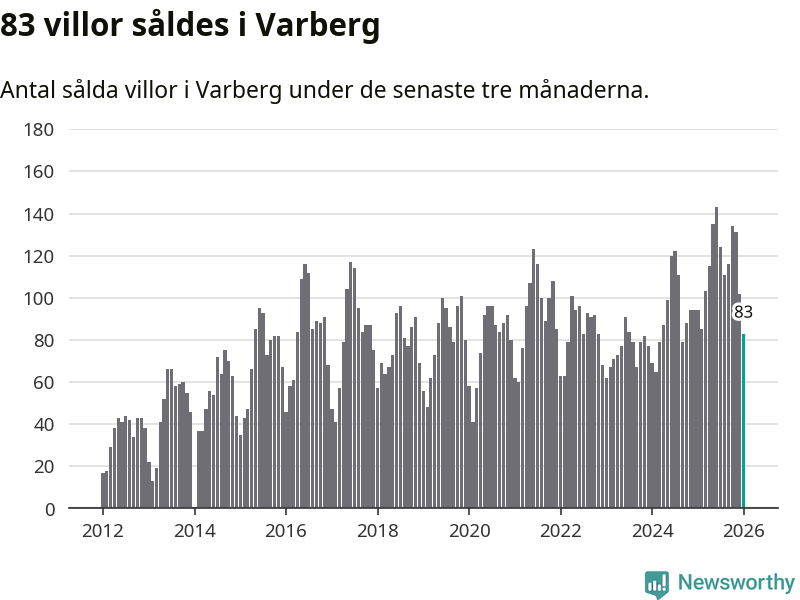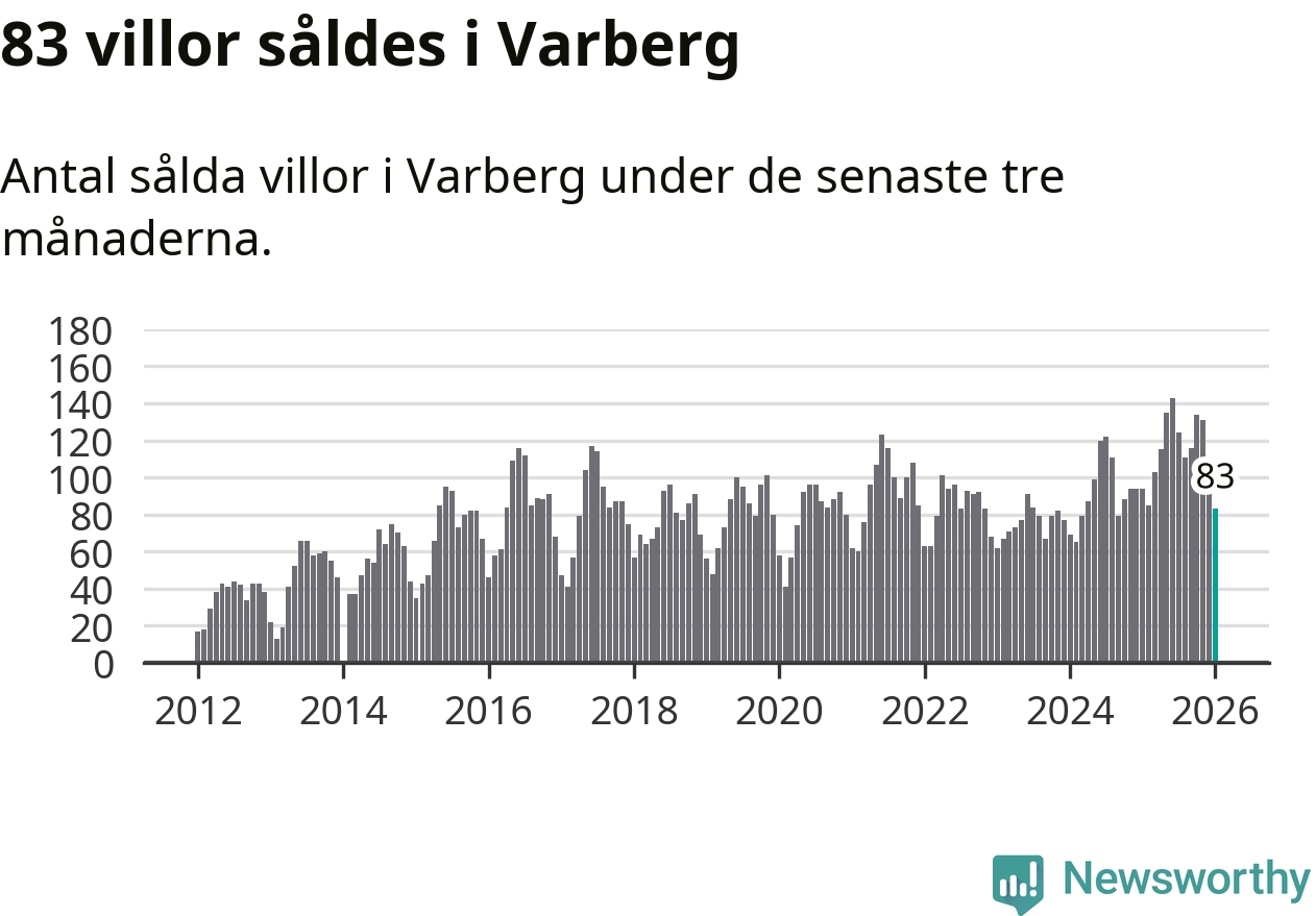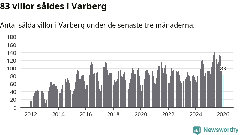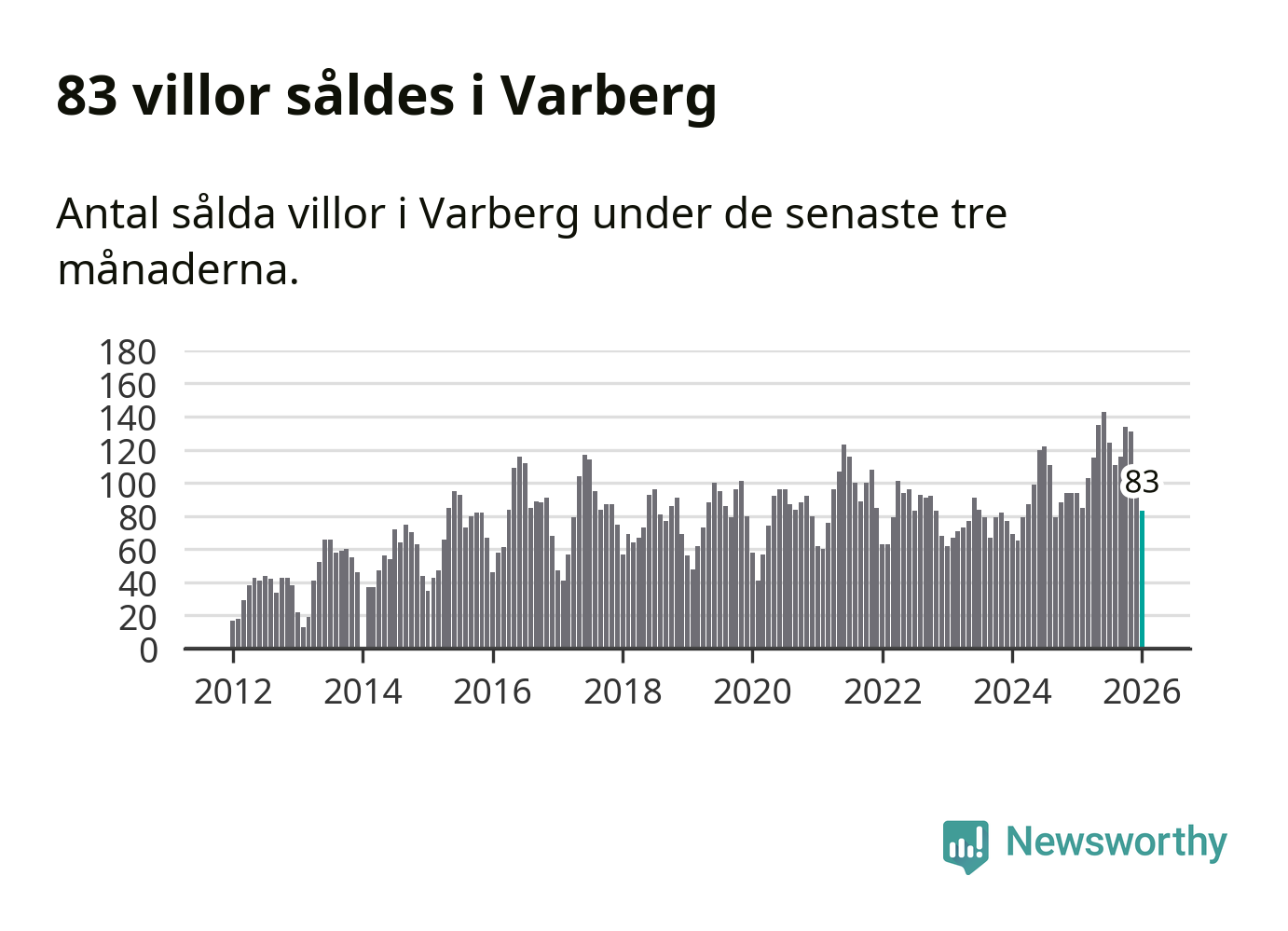 Sammanlagt såldes 83 villor i Varbergs kommun mellan november och januari till ett genomsnittligt pris på 4,6 miljoner kronor. I fjol gjordes 94 affärer vid den här tiden på året.
