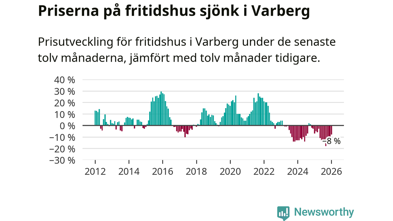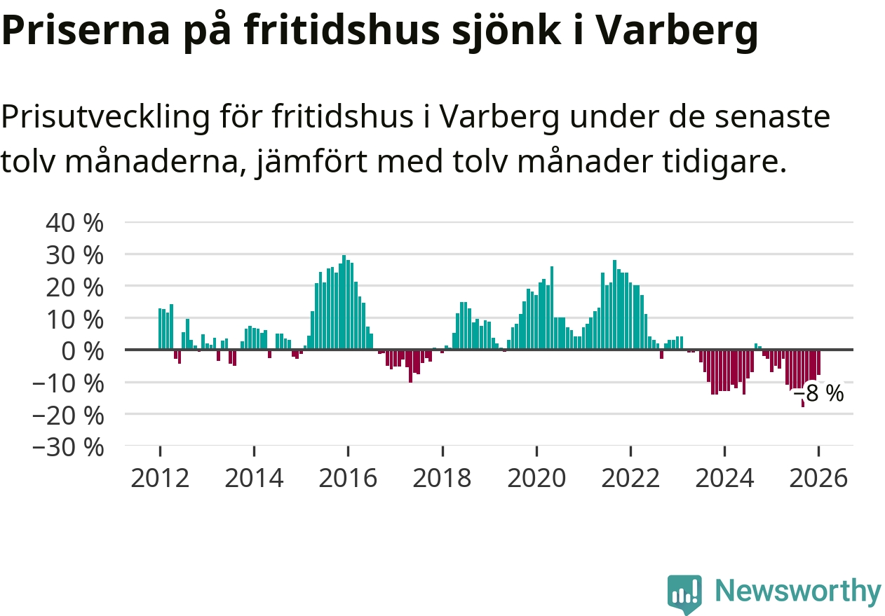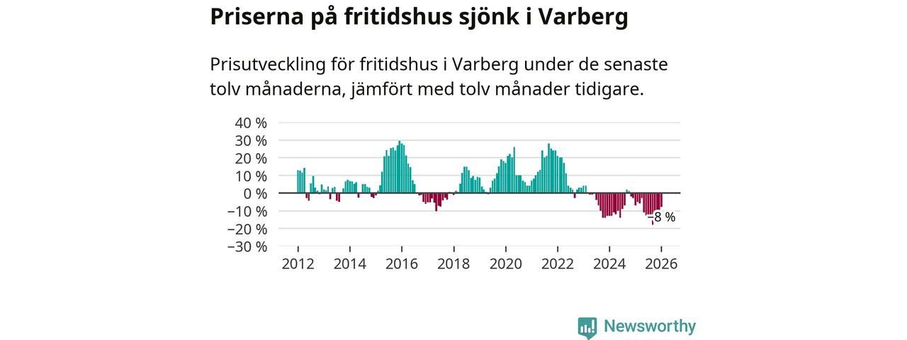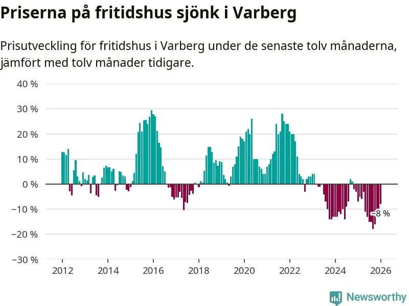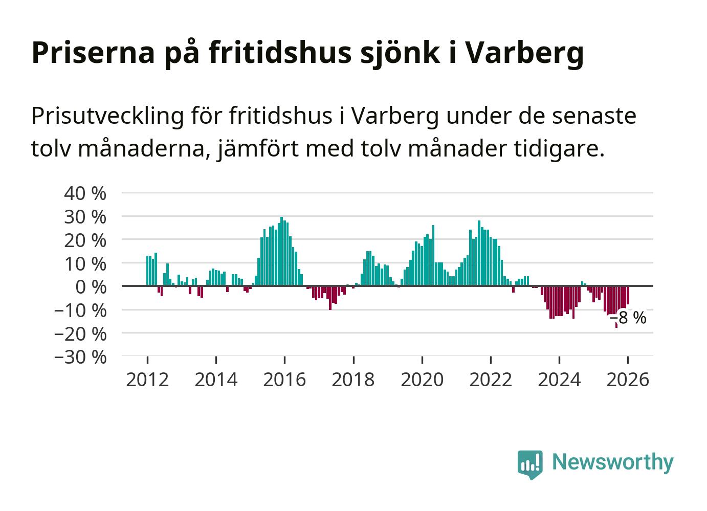Priserna på fritidshus har gått ner i Varbergs kommun. Medelpriset på försäljningarna under de senaste tolv månaderna visar på en nedgång med 8 procent.