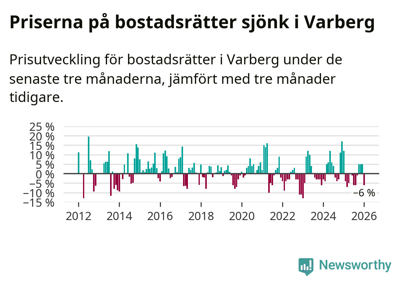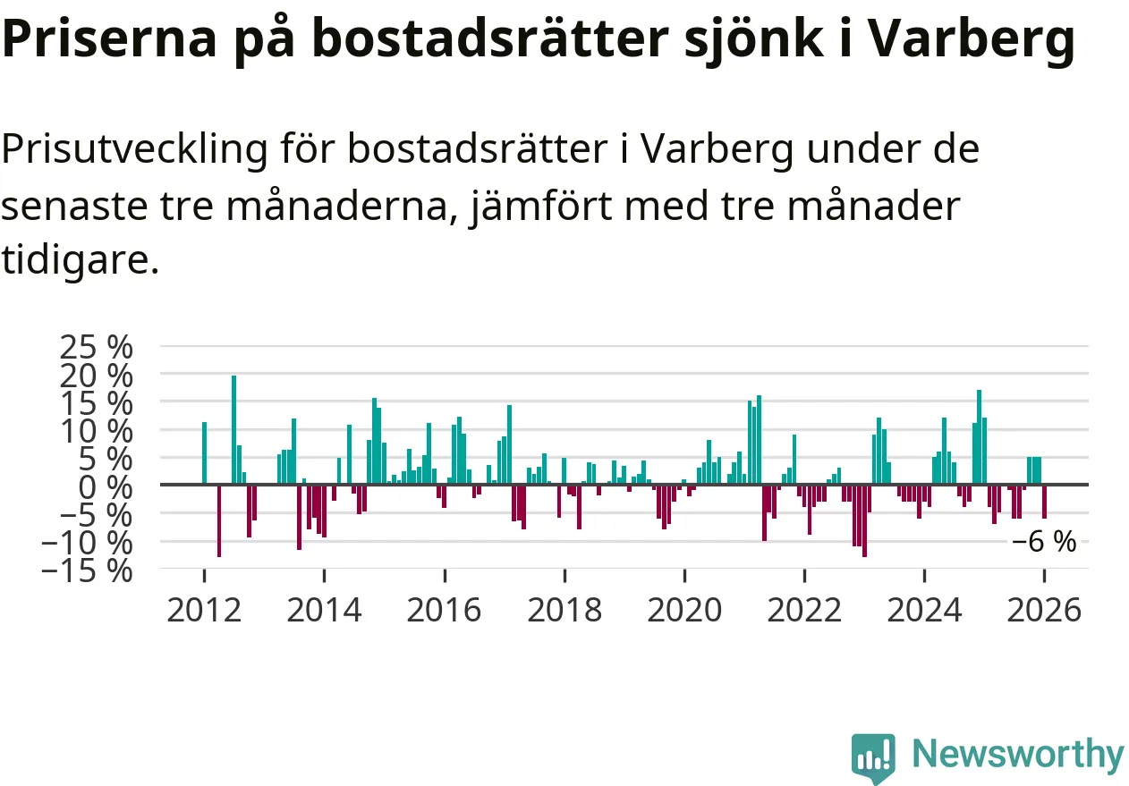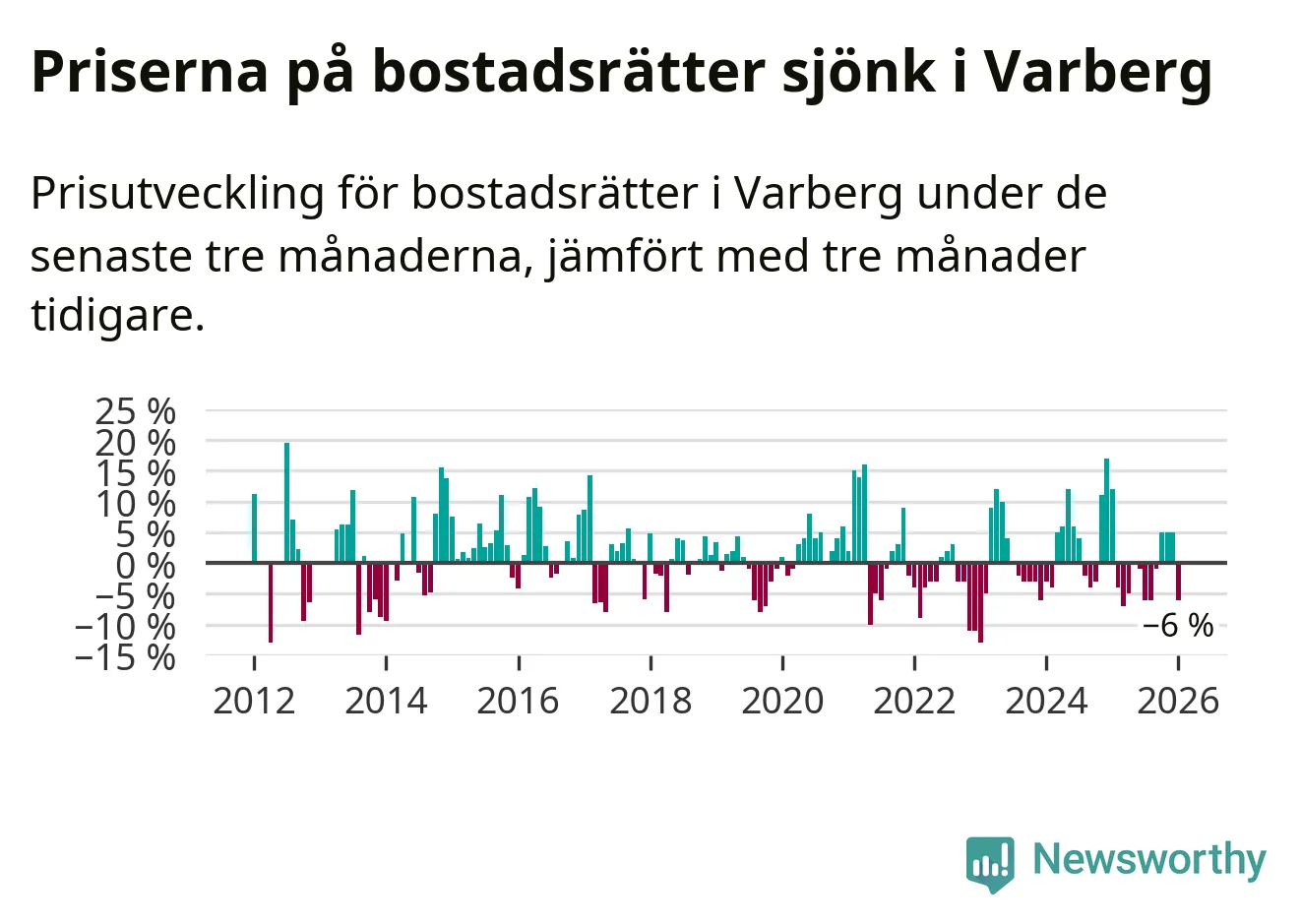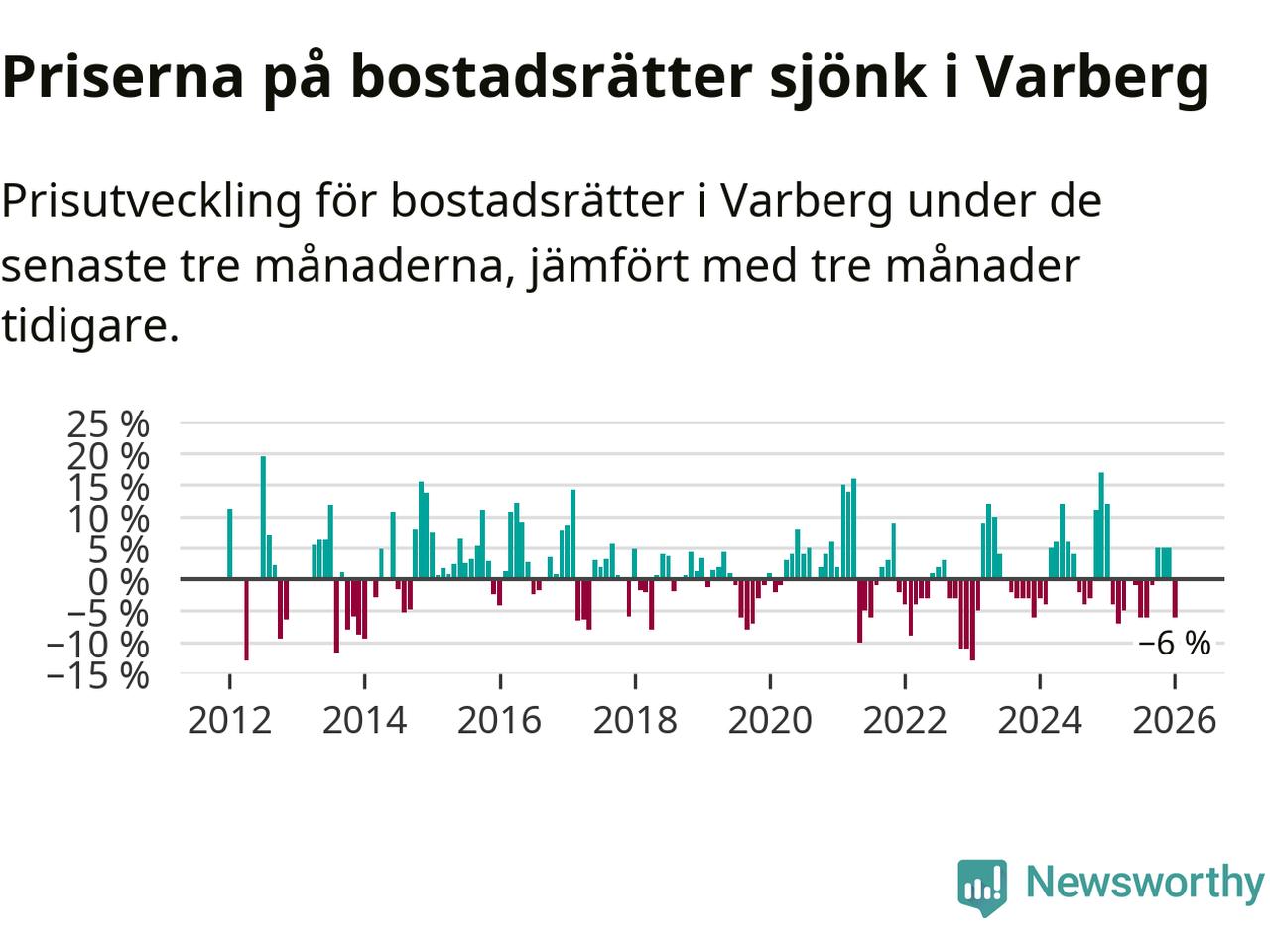 Priserna på bostadsrätter har gått ner i Varbergs kommun. Medelpriset på försäljningarna under de senaste tre månaderna visar på en nedgång med 6 procent.