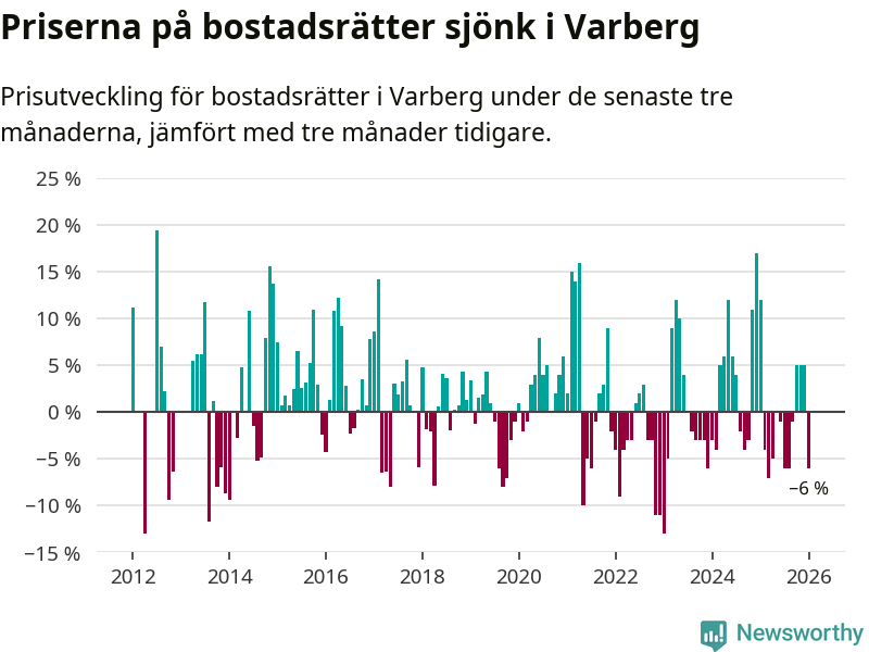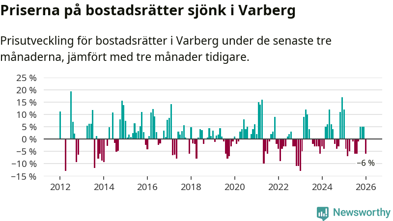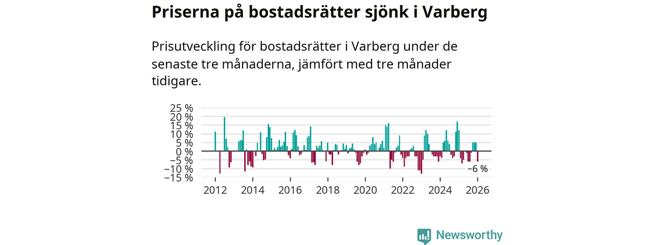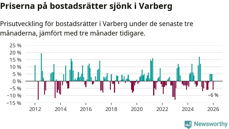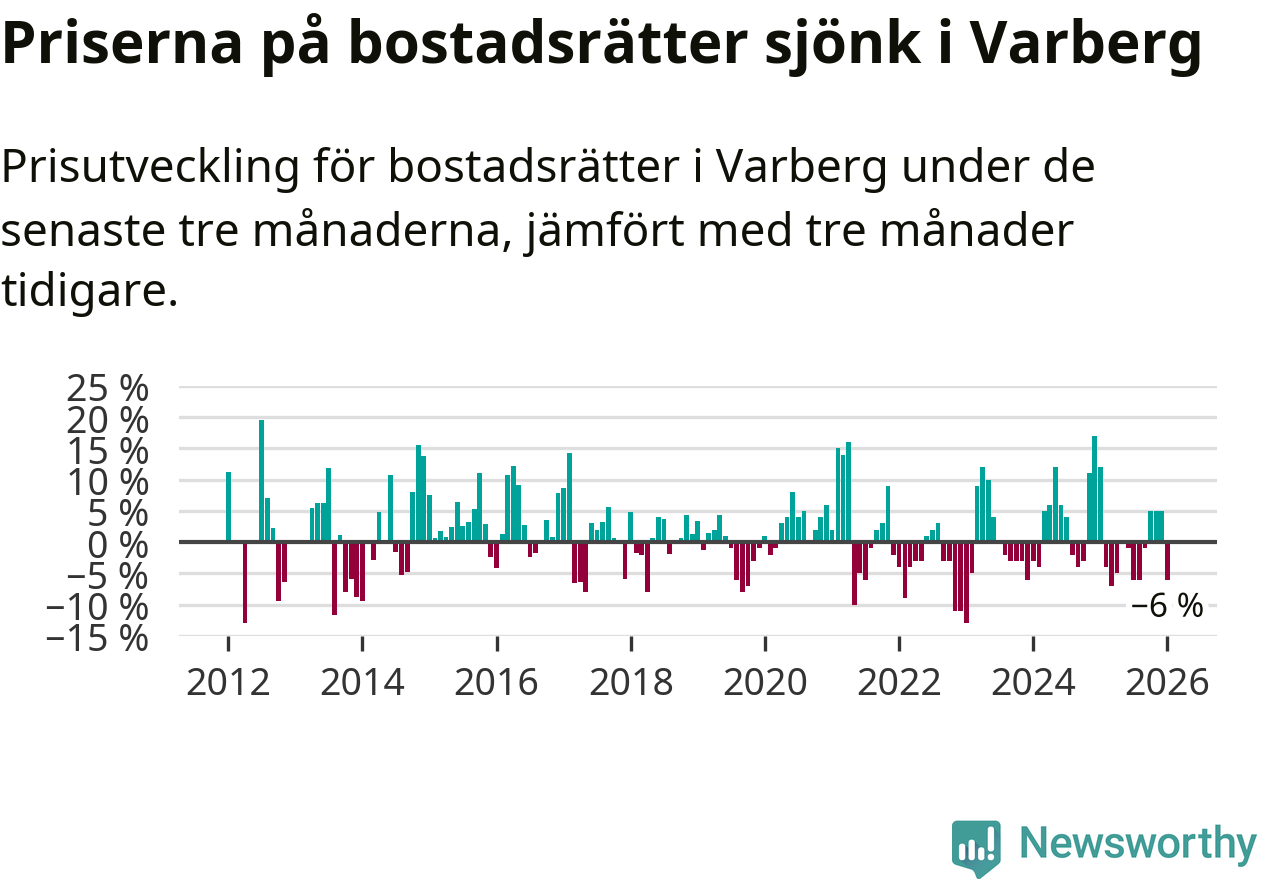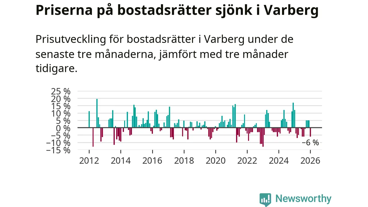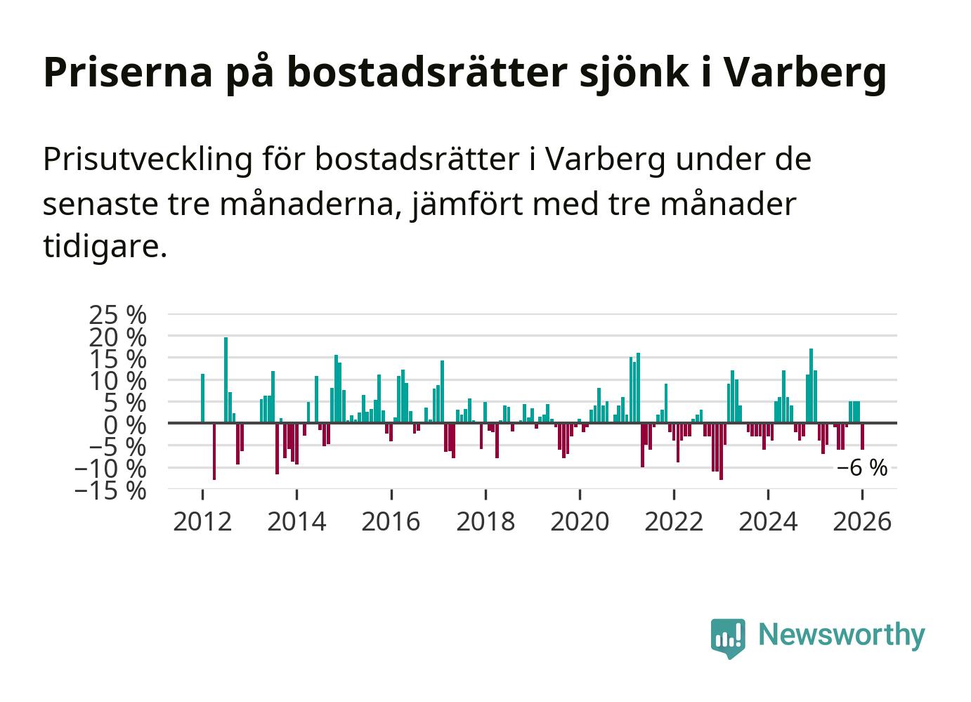 Priserna på bostadsrätter har gått ner i Varbergs kommun. Medelpriset på försäljningarna under de senaste tre månaderna visar på en nedgång med 6 procent.