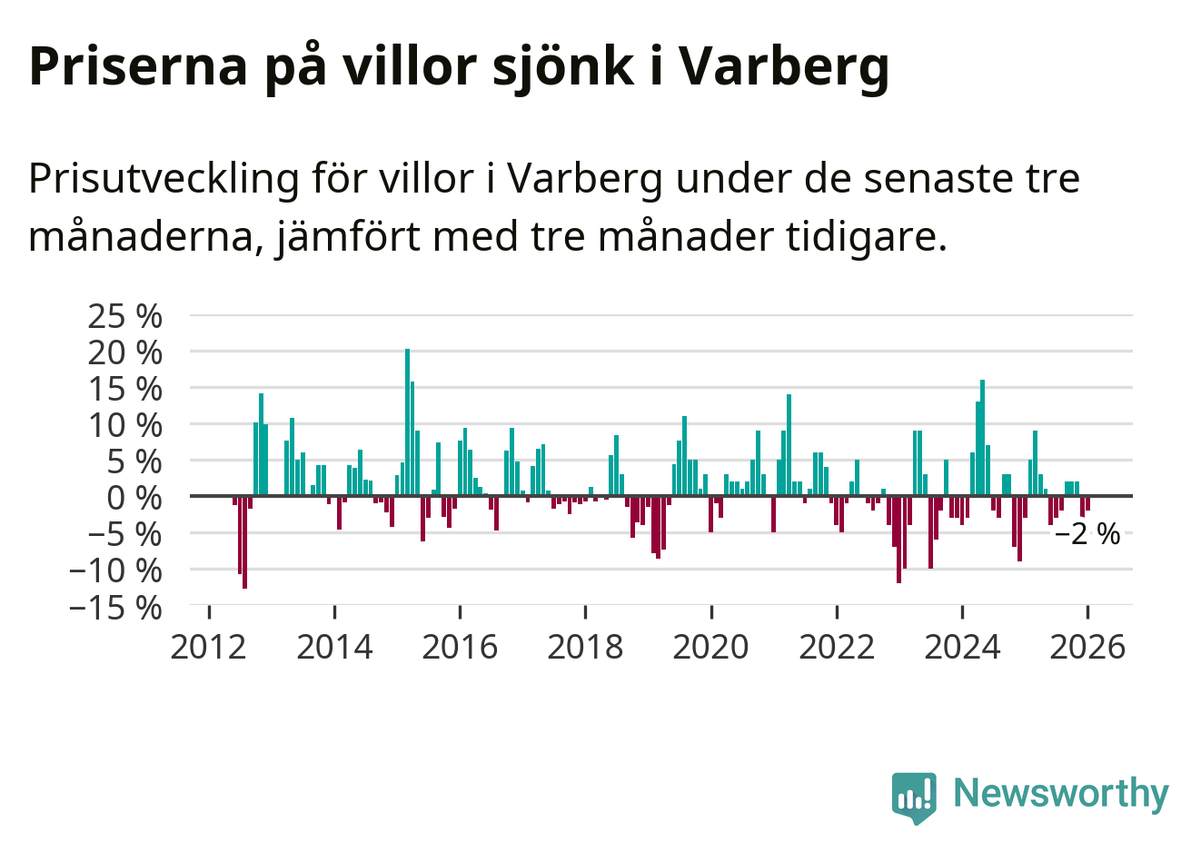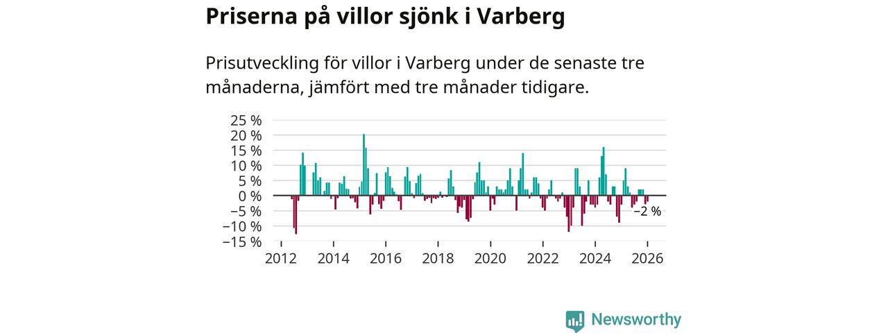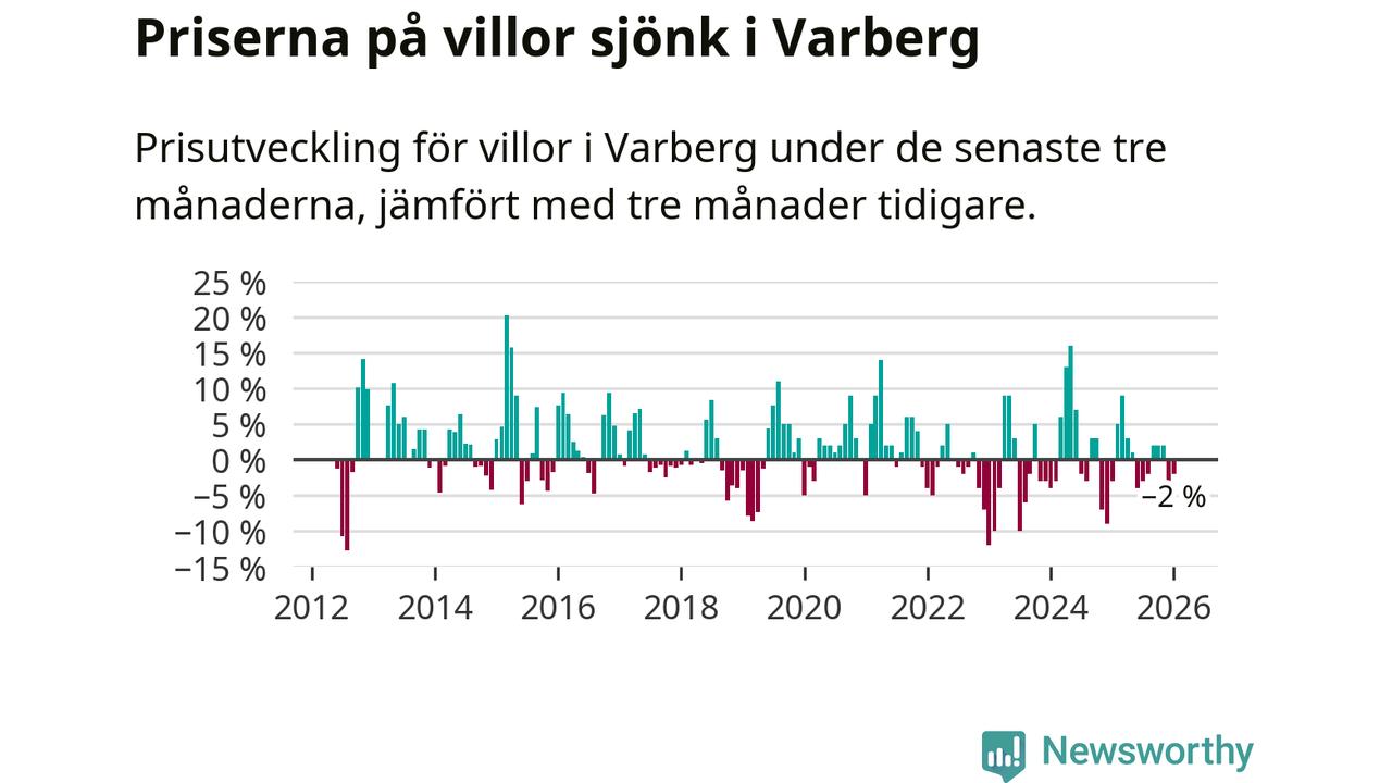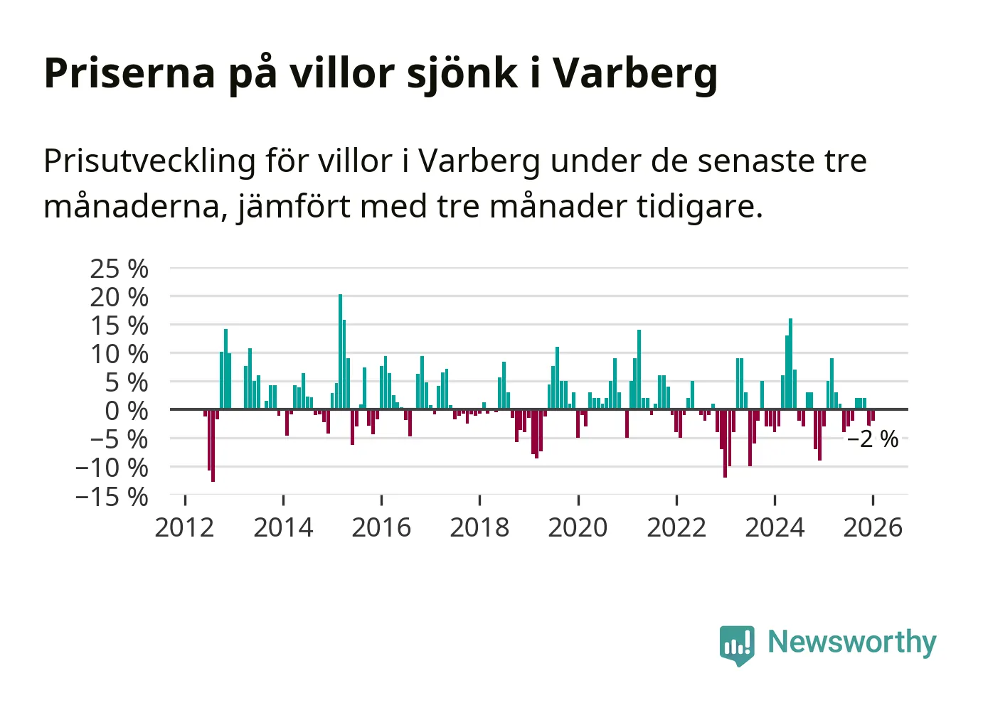 Villapriserna har gått ner i Varbergs kommun. Medelpriset på försäljningarna under de senaste tre månaderna visar på en nedgång med 2 procent.
