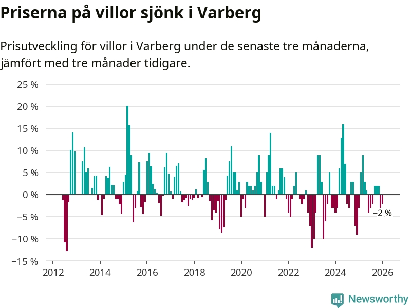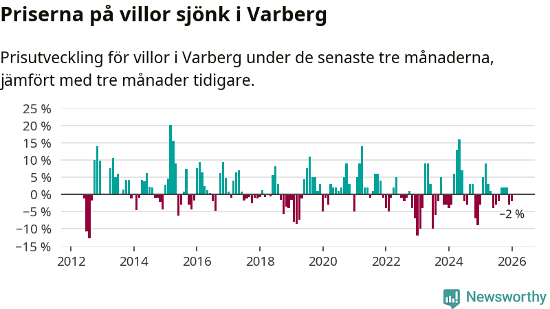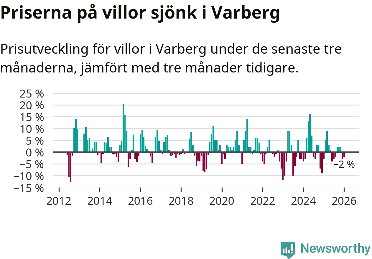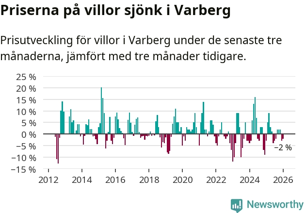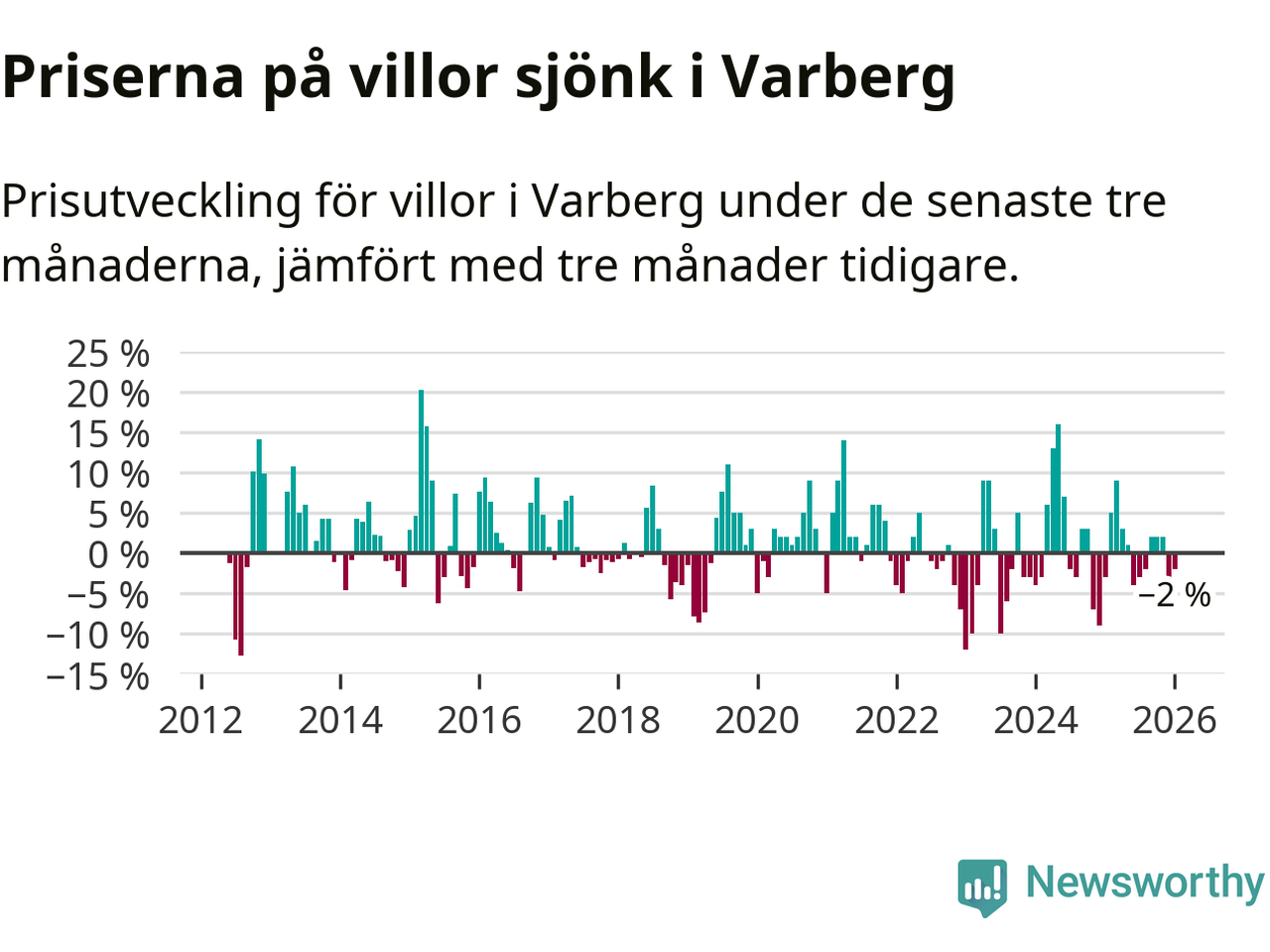 Villapriserna har gått ner i Varbergs kommun. Medelpriset på försäljningarna under de senaste tre månaderna visar på en nedgång med 2 procent.