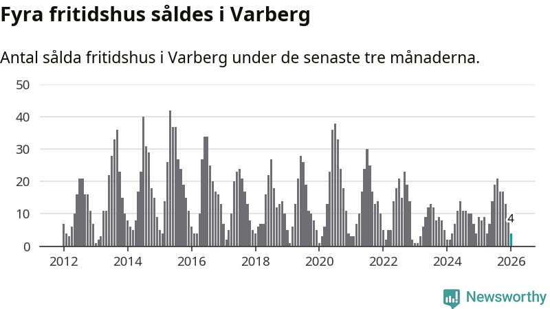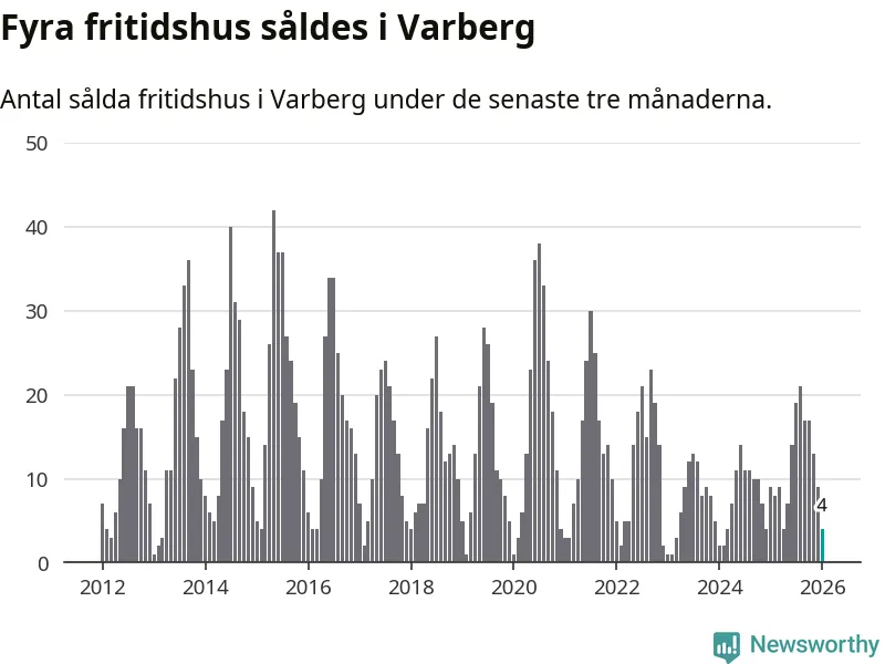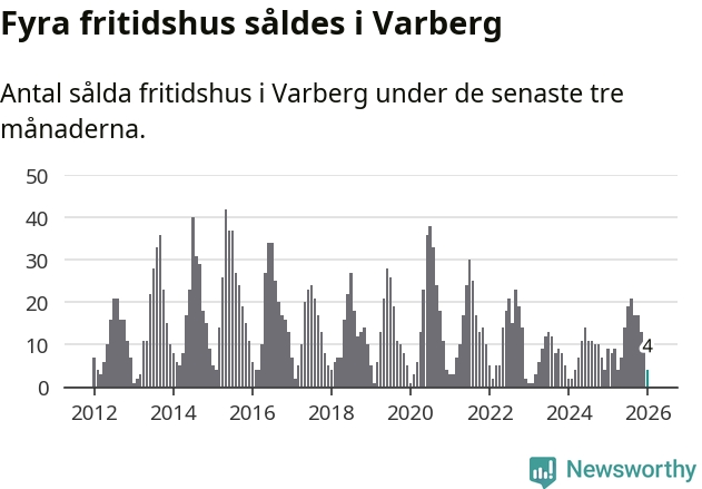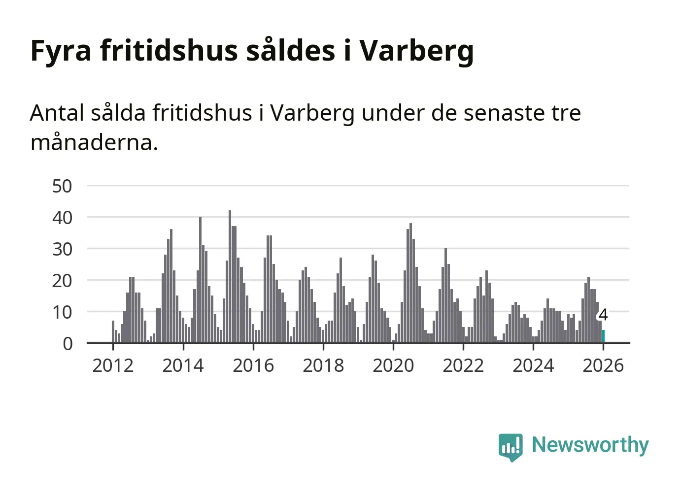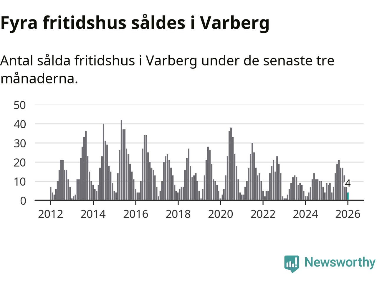 Sammanlagt såldes fyra fritidshus i Varbergs kommun mellan november 2025 och januari till ett genomsnittligt pris på 3,6 miljoner kronor. I fjol gjordes nio affärer vid den här tiden på året.