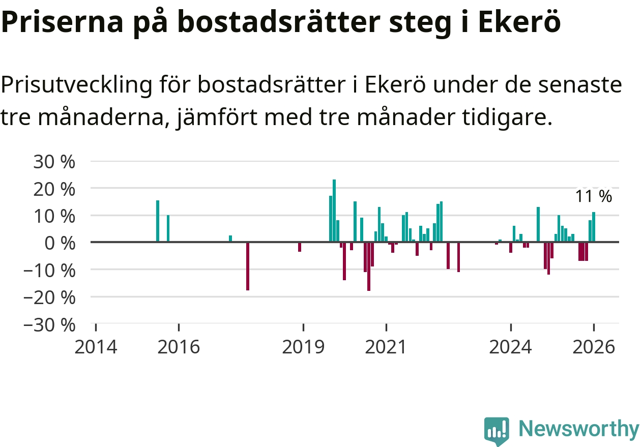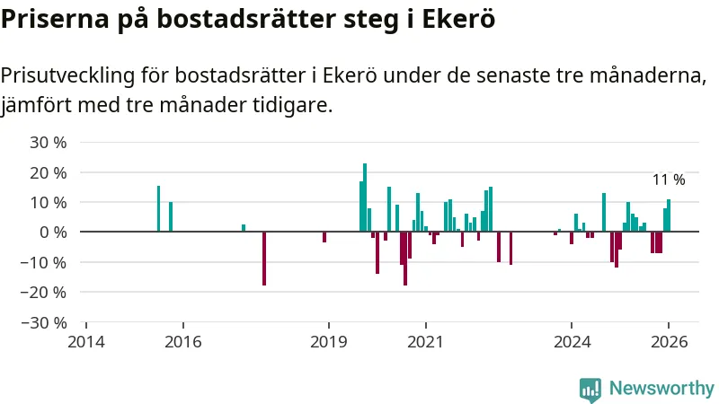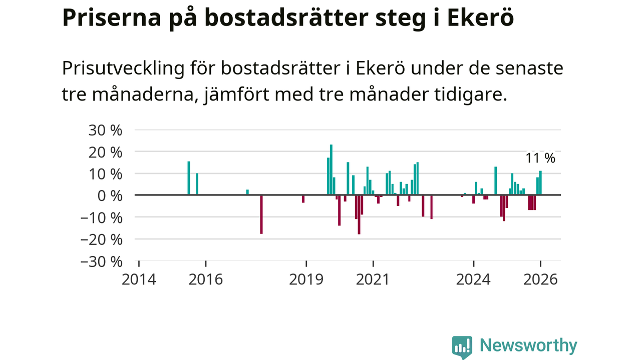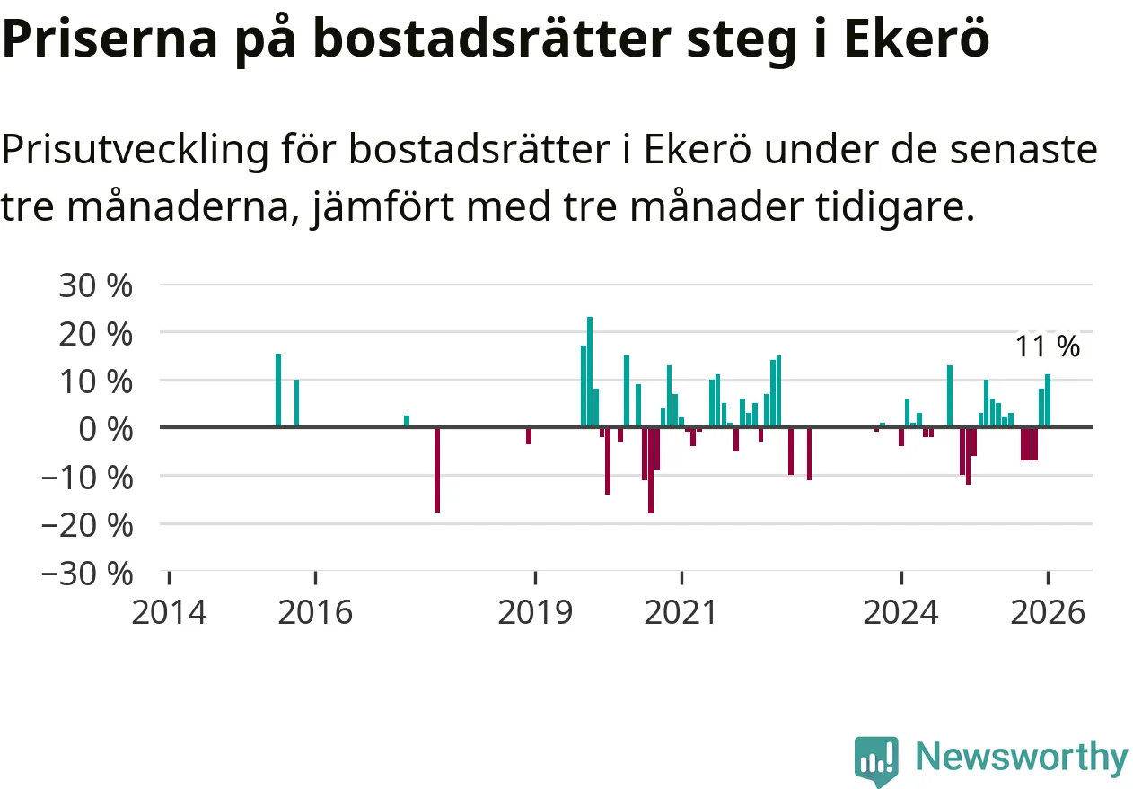 Statistiken visar även på en stor prisuppgång i Ekerö kommun. Medelpriset på försäljningarna av bostadsrätter i kommunen var 11 procent högre än för tre månader sedan. I hela Stockholms län däremot sjunker priserna på bostadsrätter. I hela länet noterades en prisnedgång på 1 procent.