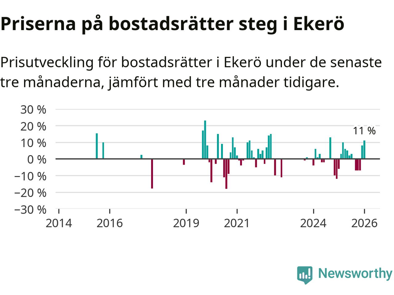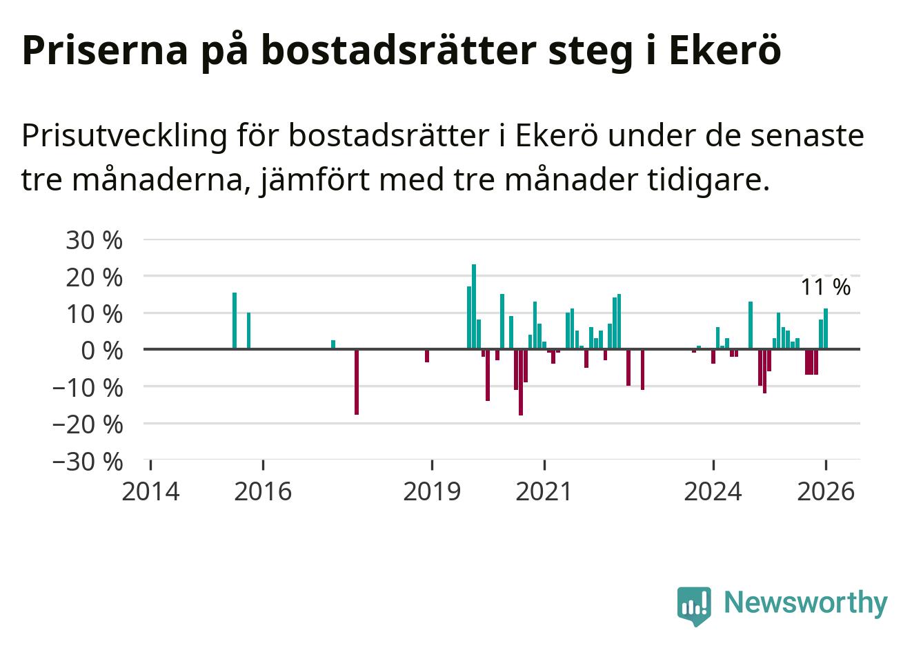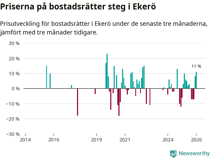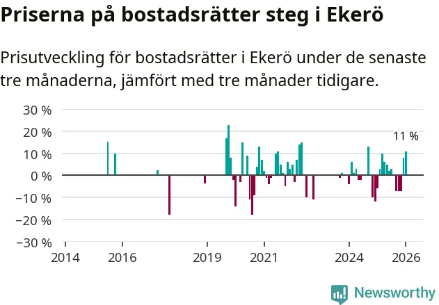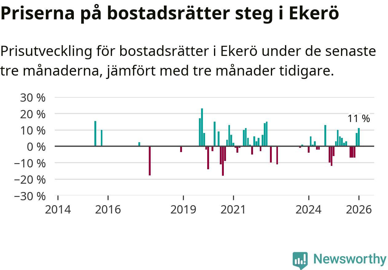 Statistiken visar även på en stor prisuppgång i Ekerö kommun. Medelpriset på försäljningarna av bostadsrätter i kommunen var 11 procent högre än för tre månader sedan. I hela Stockholms län däremot sjunker priserna på bostadsrätter. I hela länet noterades en prisnedgång på 1 procent.