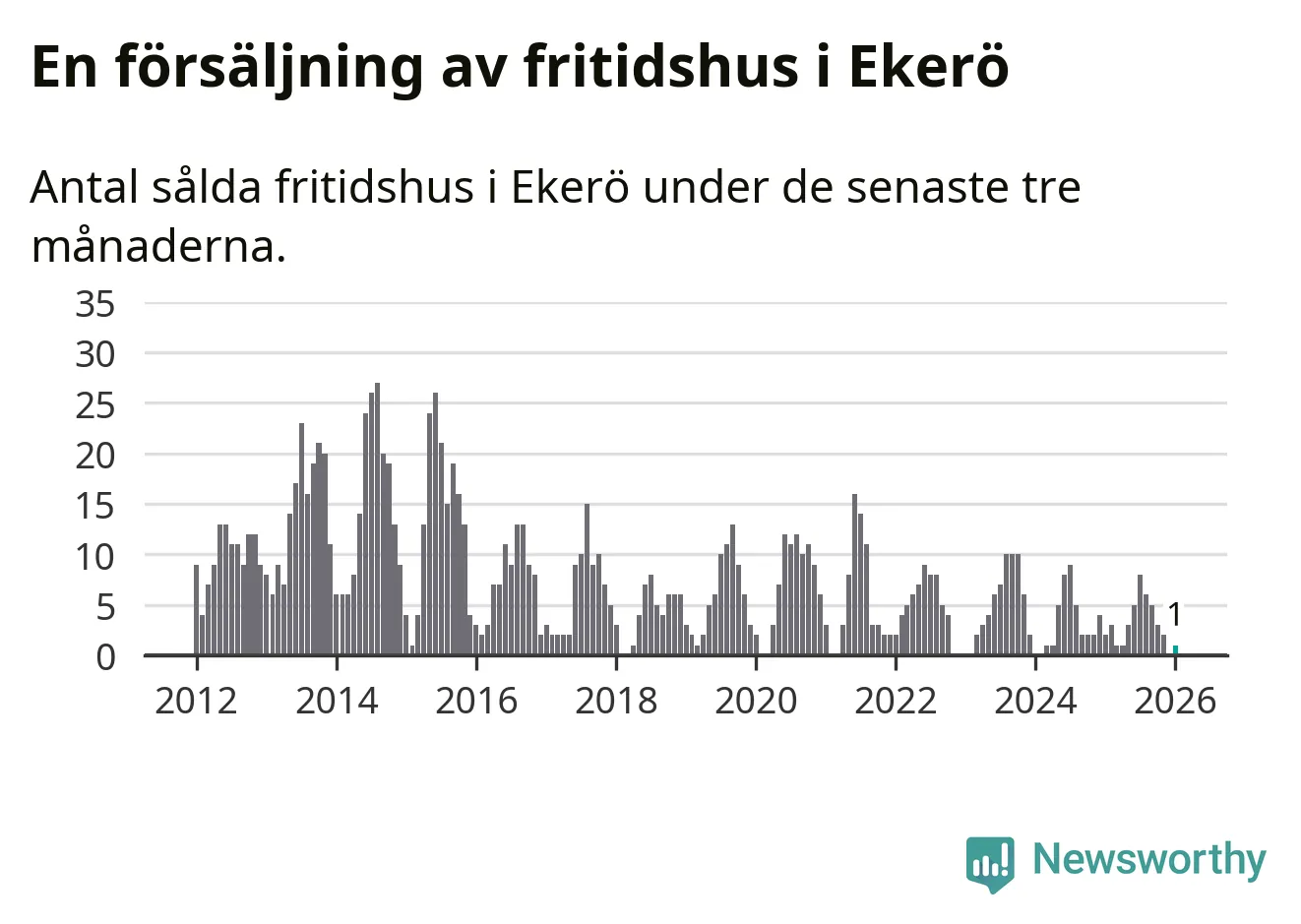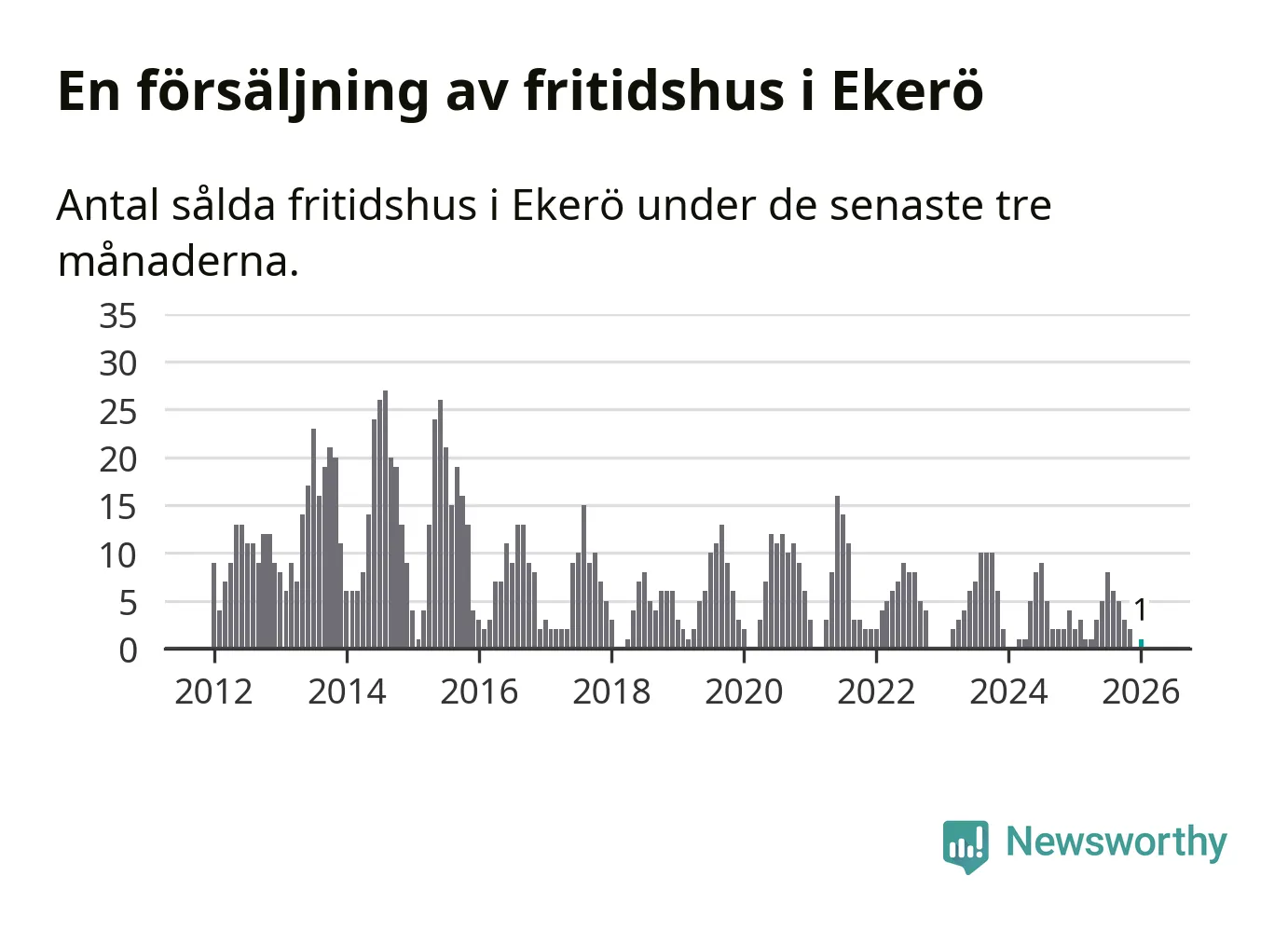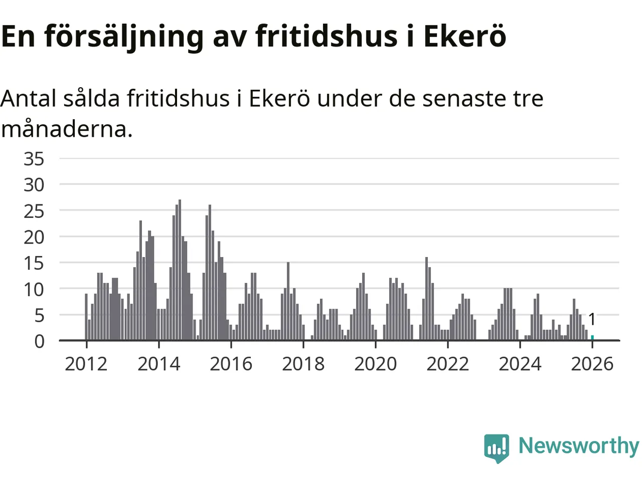 Mellan november och januari gjordes sammanlagt en affär med fritidshus i Ekerö kommun. Det kan jämföras med två vid motsvarande tid i fjol.