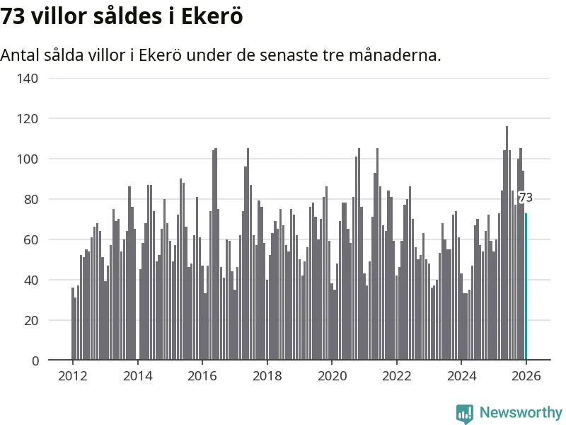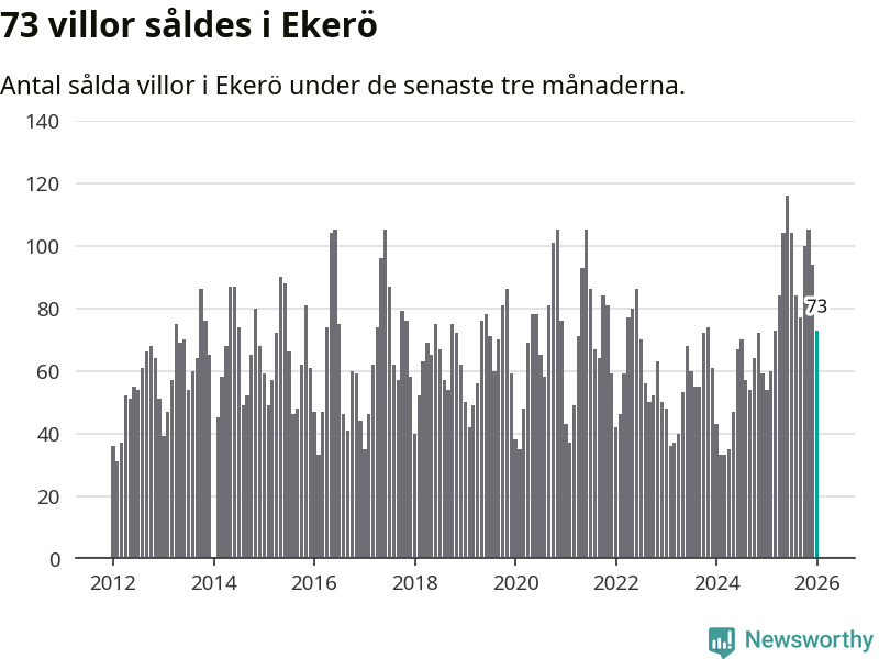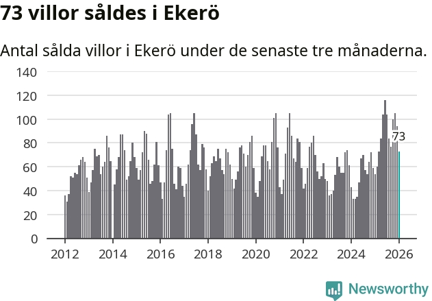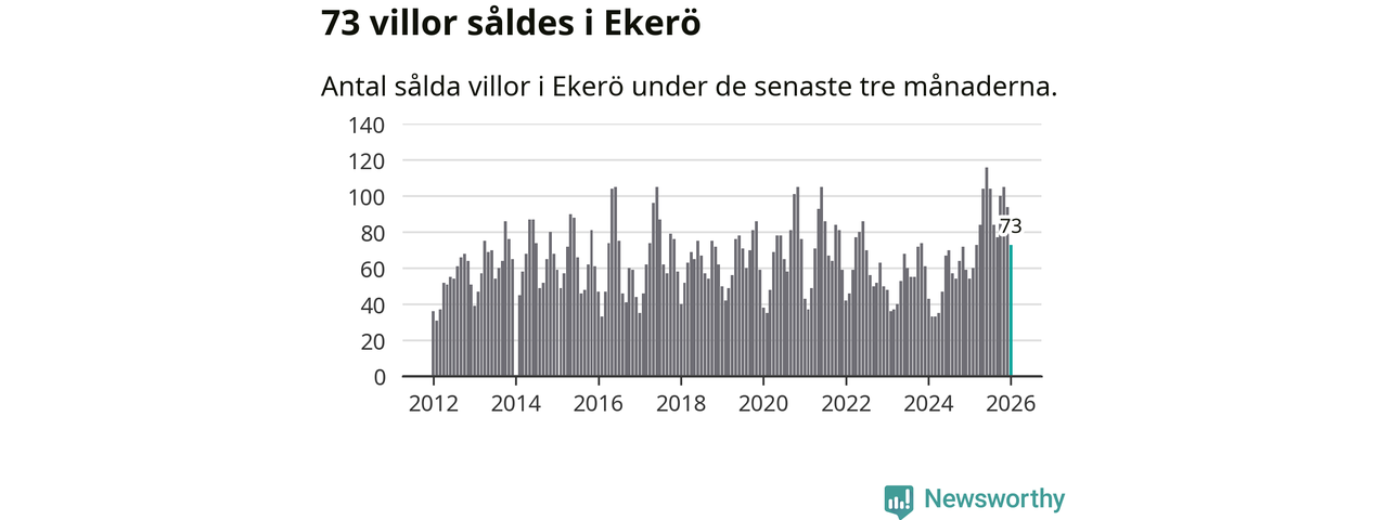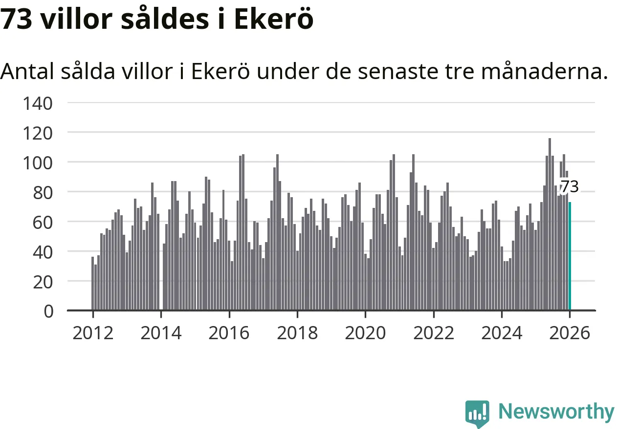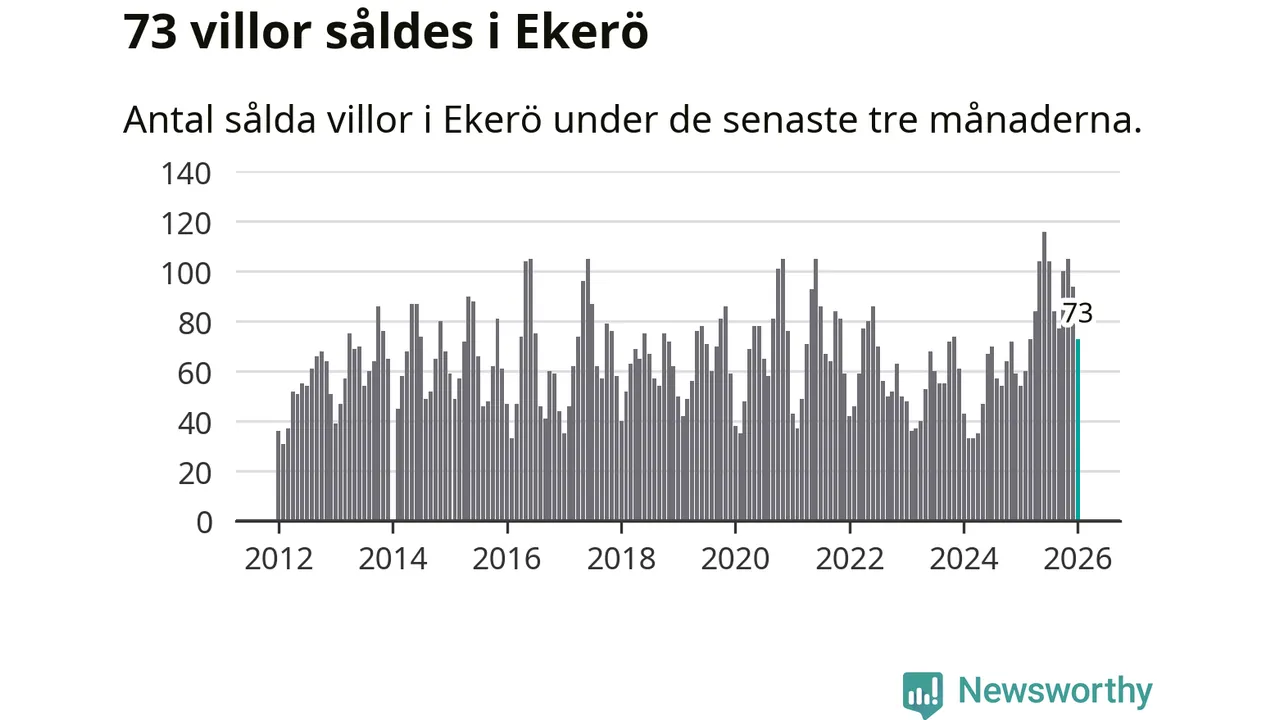 Sammanlagt såldes 73 villor i Ekerö kommun mellan november och januari till ett genomsnittligt pris på 6,8 miljoner kronor. I fjol gjordes 54 affärer vid den här tiden på året.