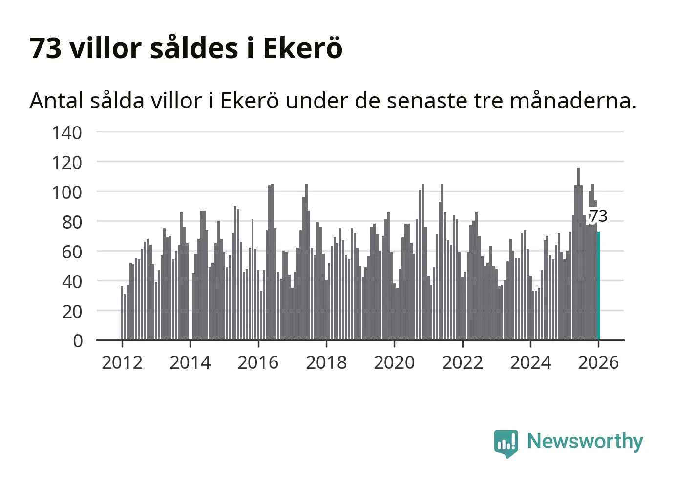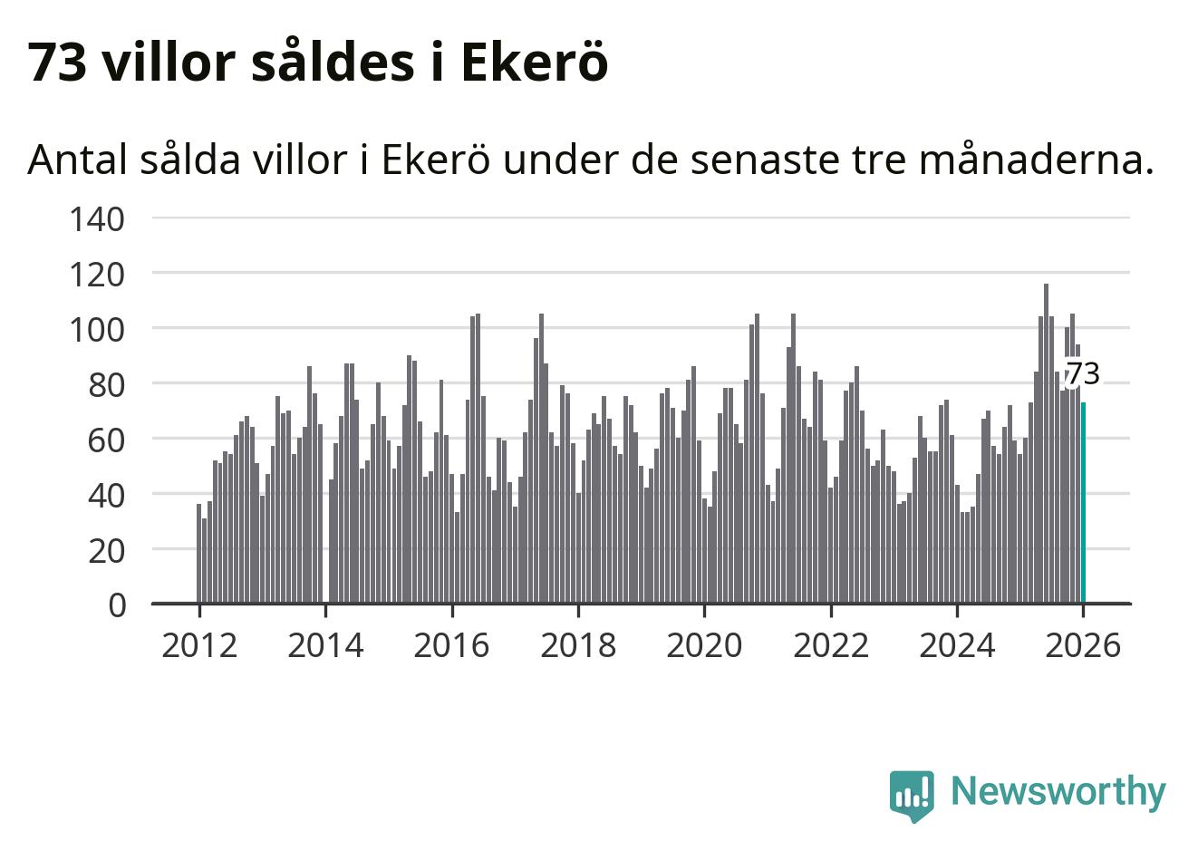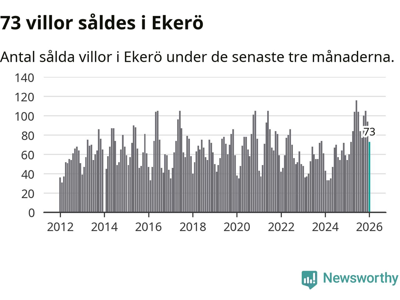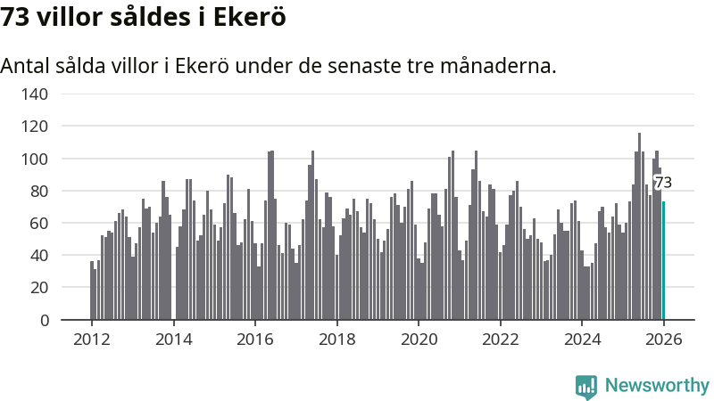 Sammanlagt såldes 73 villor i Ekerö kommun mellan november och januari till ett genomsnittligt pris på 6,8 miljoner kronor. I fjol gjordes 54 affärer vid den här tiden på året.