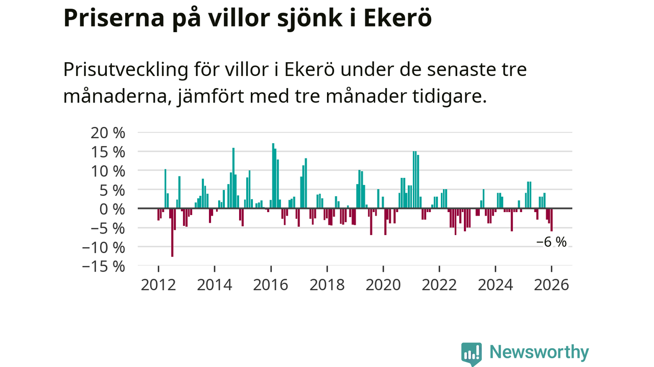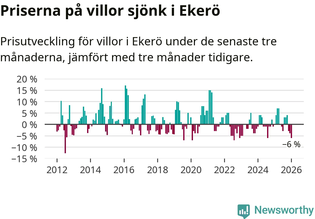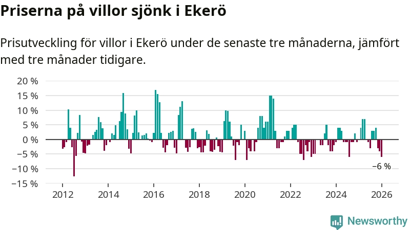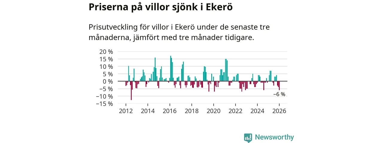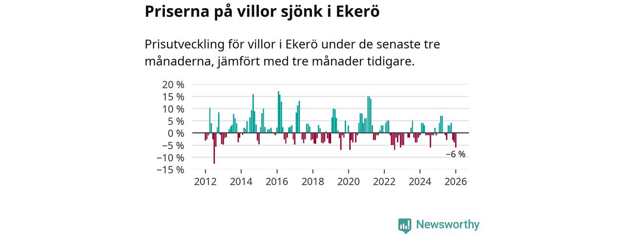 Villapriserna har gått ner i Ekerö kommun. Medelpriset på försäljningarna under de senaste tre månaderna visar på en nedgång med 6 procent.