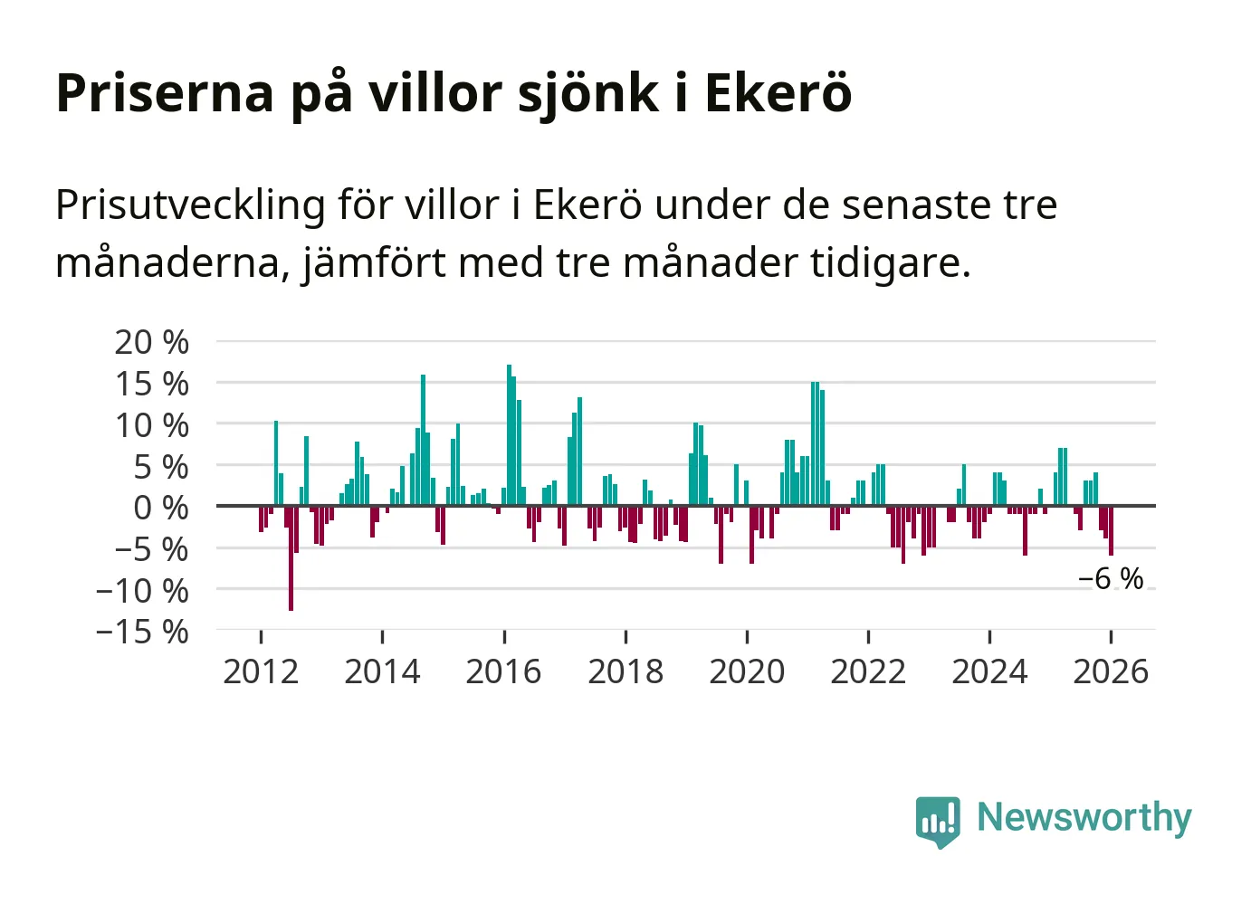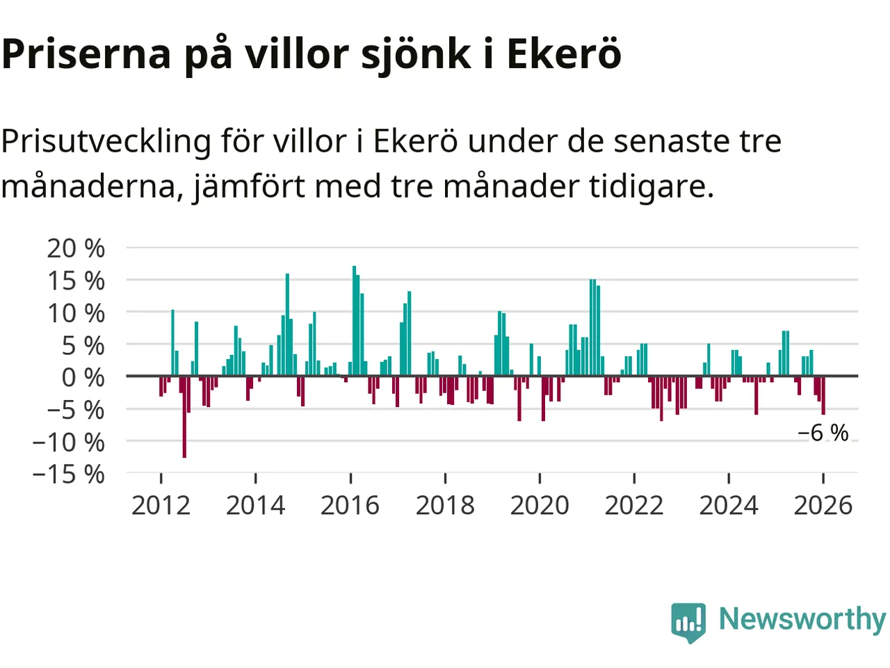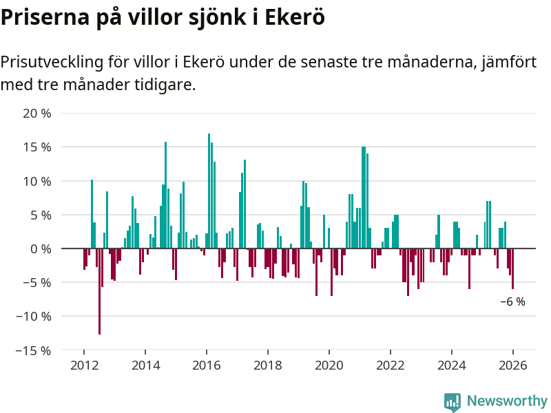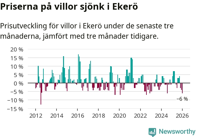 Villapriserna har gått ner i Ekerö kommun. Medelpriset på försäljningarna under de senaste tre månaderna visar på en nedgång med 6 procent.