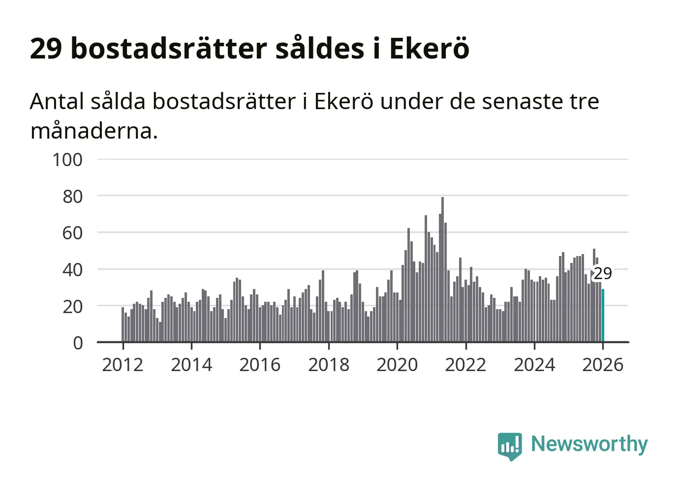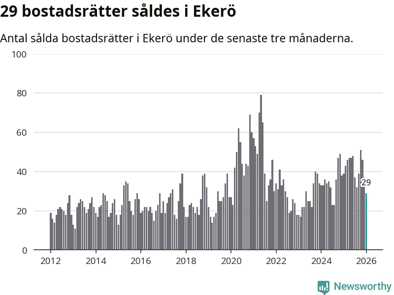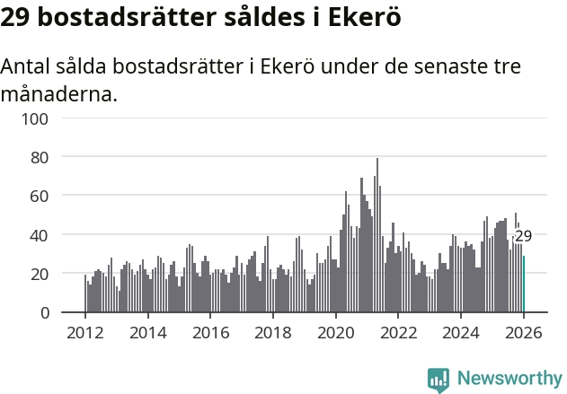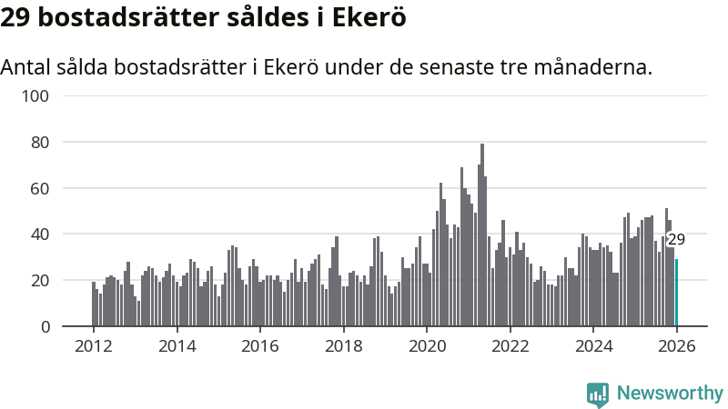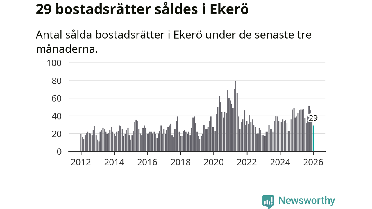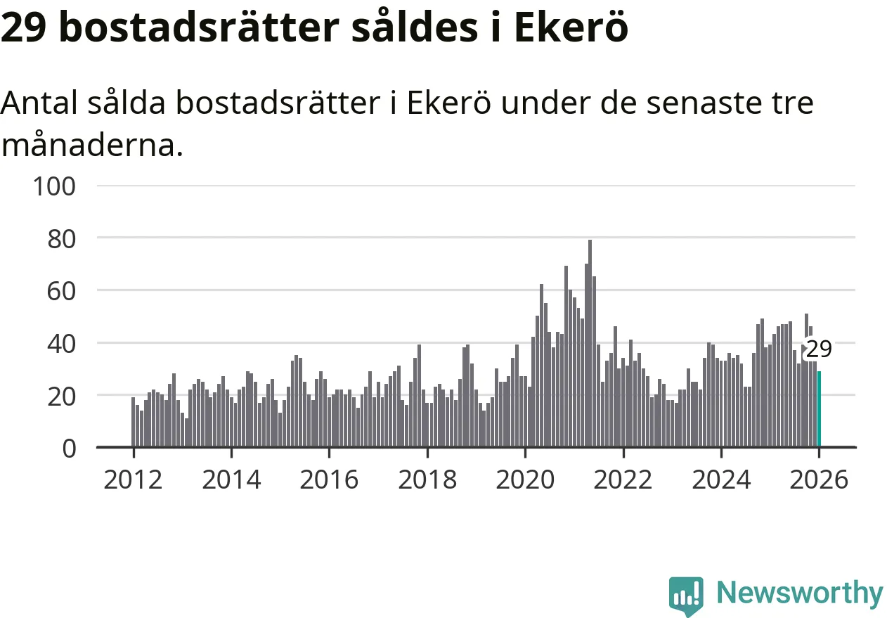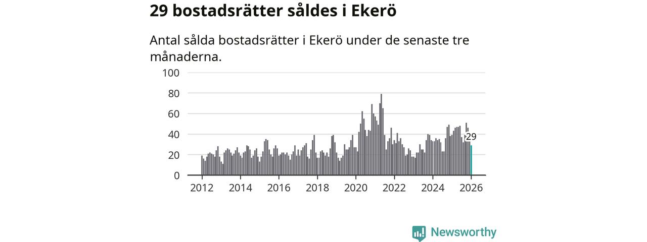 Mellan november och januari gjordes sammanlagt 29 affärer med bostadsrätter i Ekerö kommun. Det kan jämföras med 39 vid motsvarande tid i fjol.