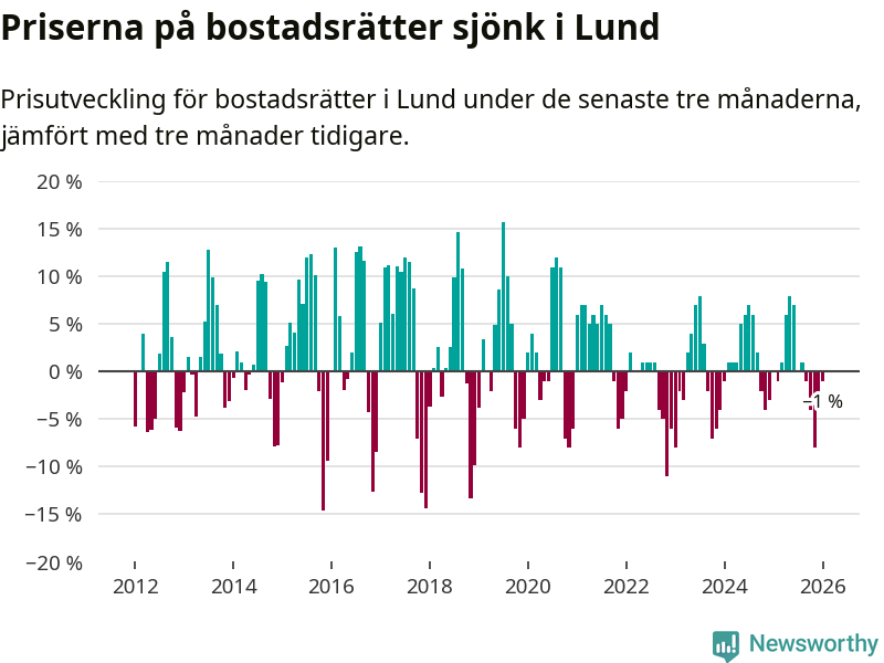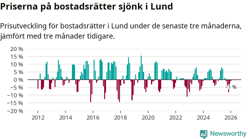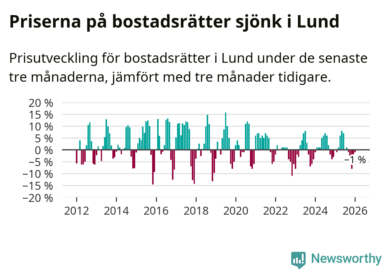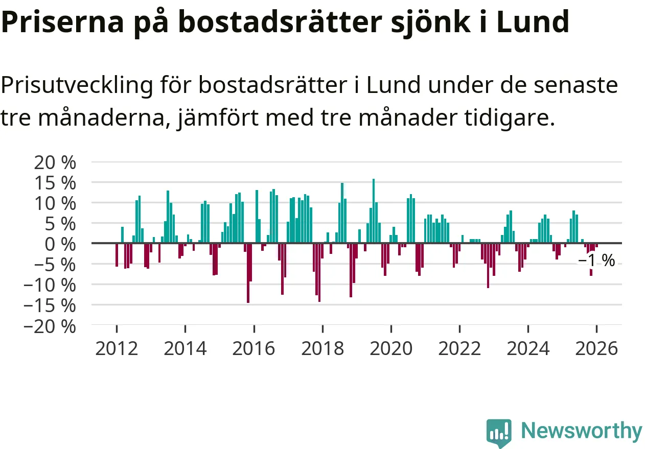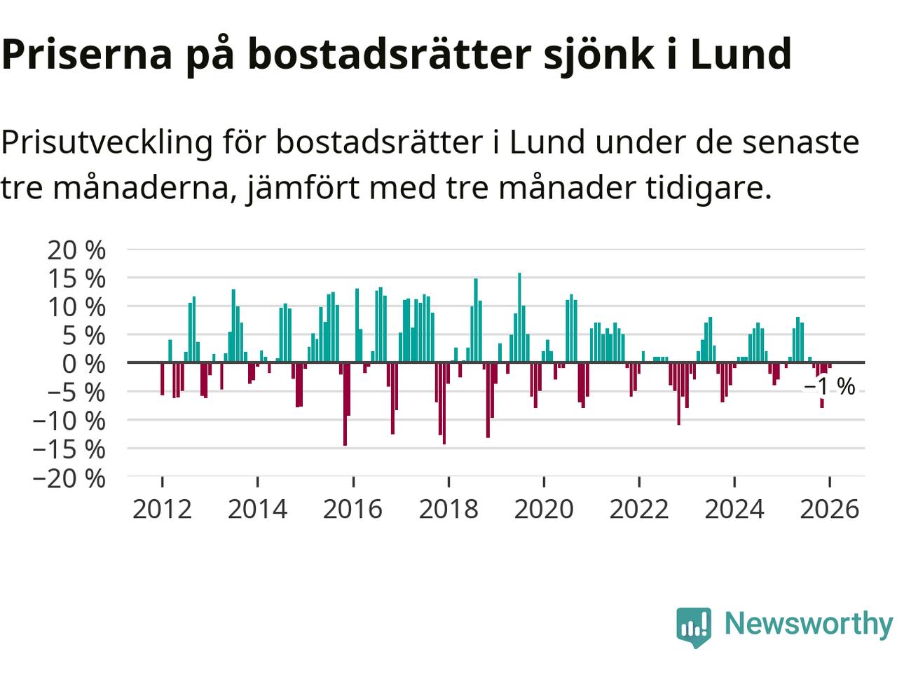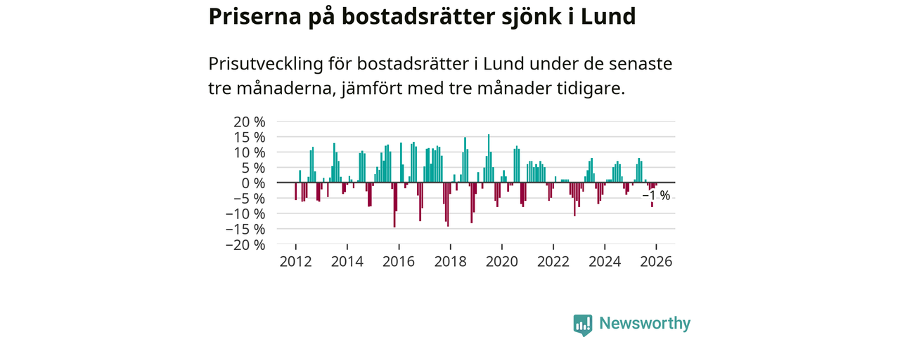 Priserna på bostadsrätter har gått ner i Lunds kommun. Medelpriset på försäljningarna under de senaste tre månaderna visar på en nedgång med 1 procent.
