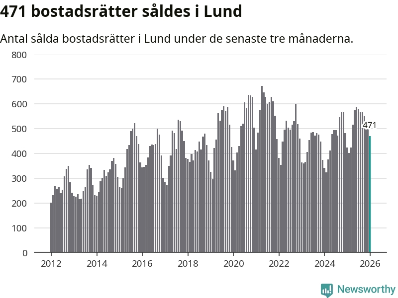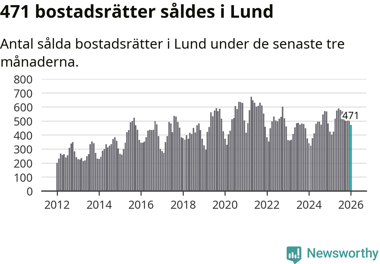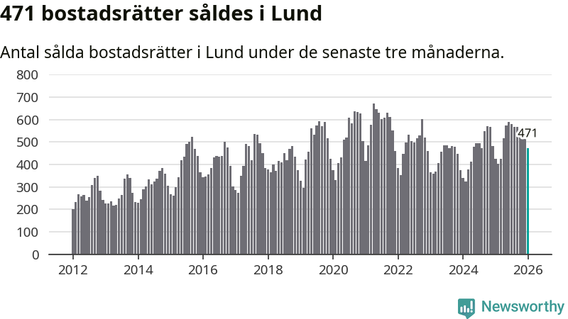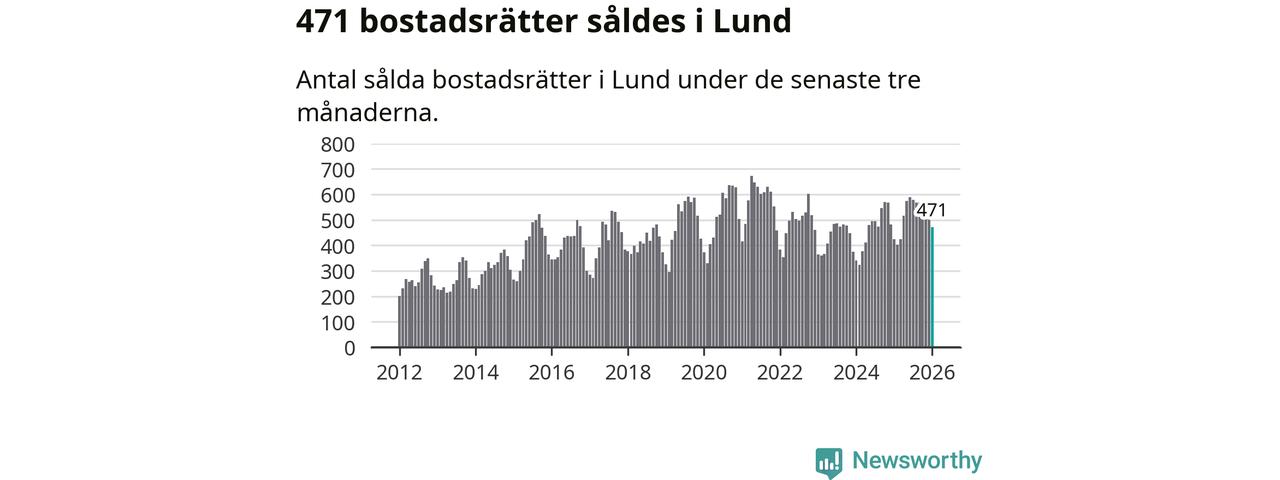 Sammanlagt såldes 471 bostadsrätter i Lunds kommun mellan november och januari till ett genomsnittligt pris på 2,8 miljoner kronor. I fjol gjordes 425 affärer vid den här tiden på året.