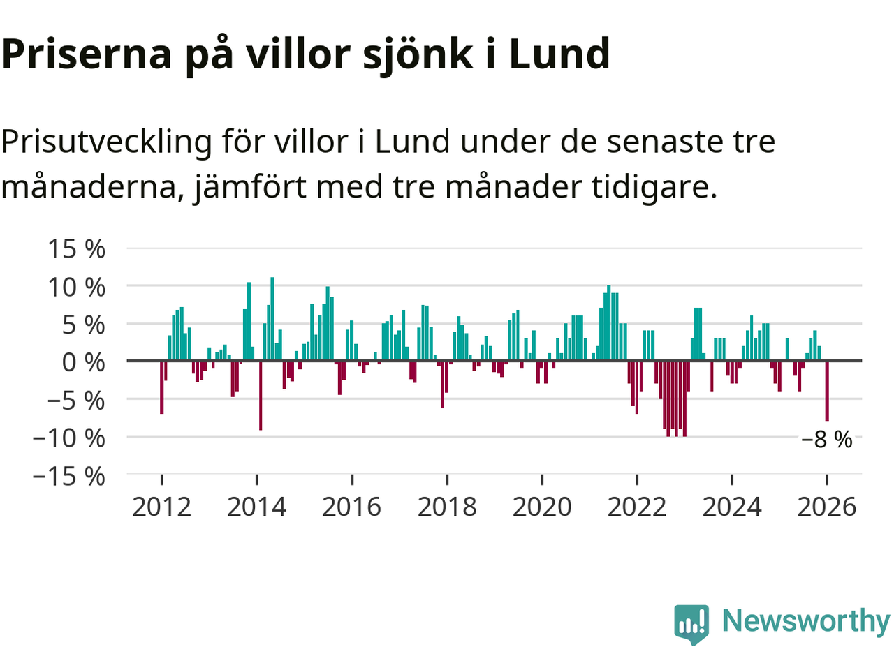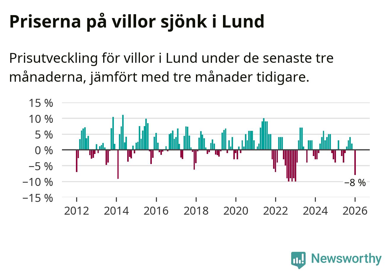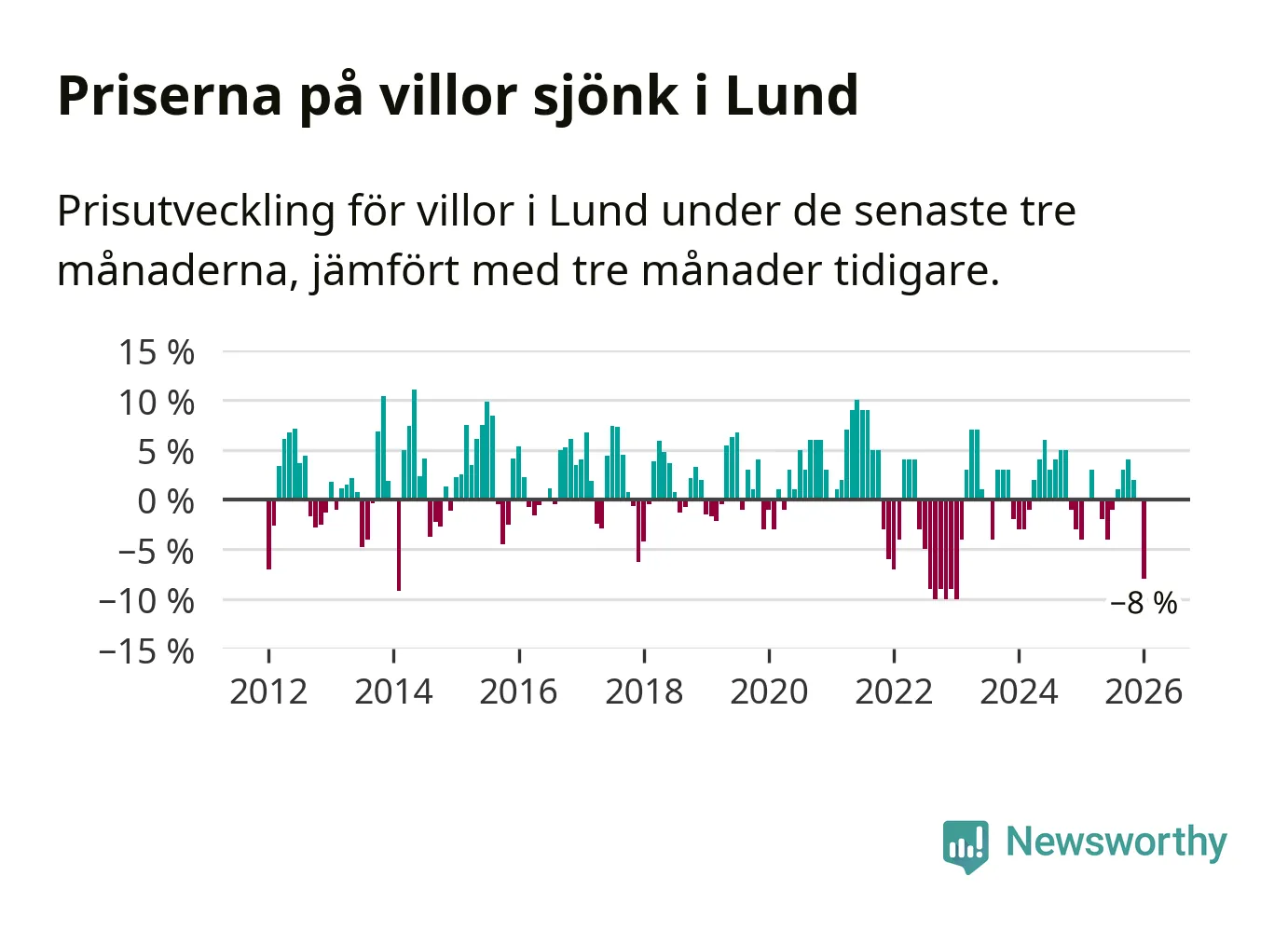 Statistiken visar även på en stor prisnedgång i Lunds kommun. Medelpriset på försäljningarna av villor i kommunen var 8 procent lägre än för tre månader sedan. Även i hela Skåne sjunker villapriserna. I hela länet noterades en prisnedgång på 3 procent.