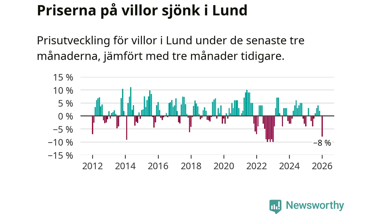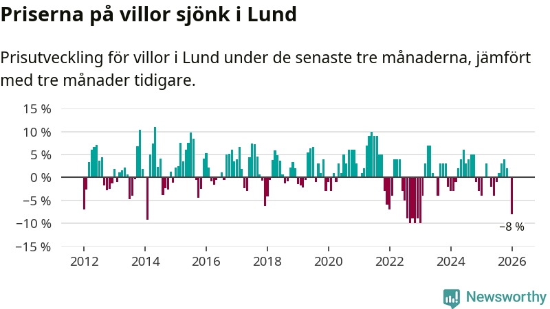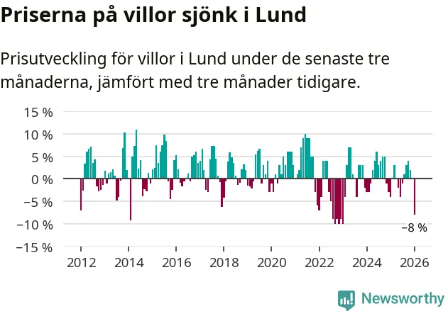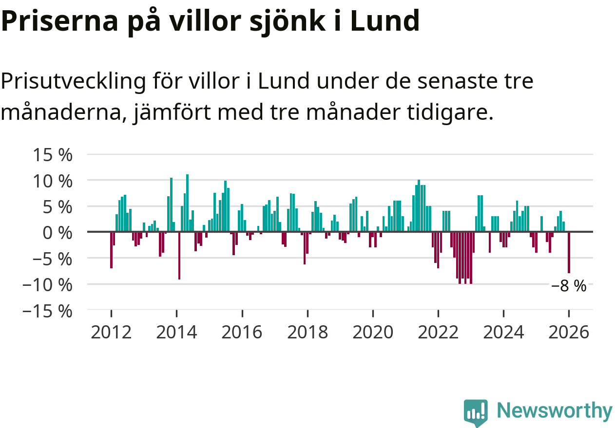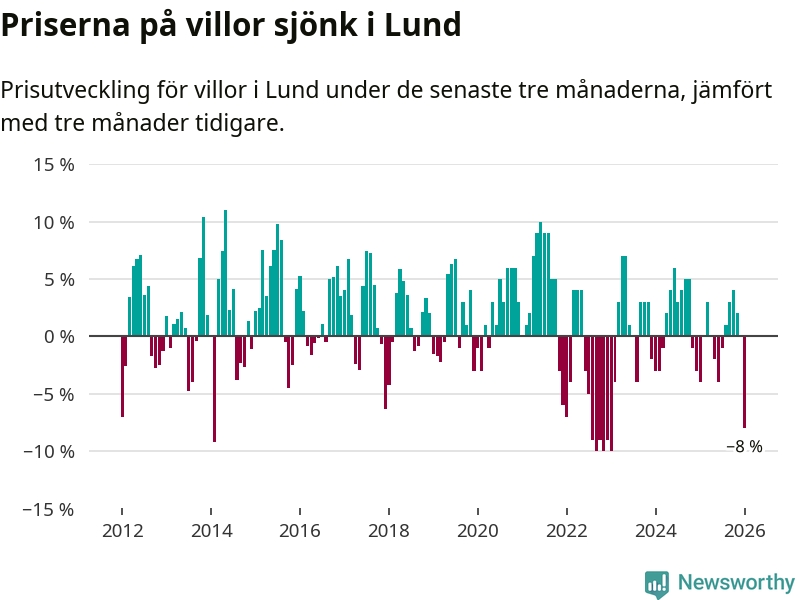 Statistiken visar även på en stor prisnedgång i Lunds kommun. Medelpriset på försäljningarna av villor i kommunen var 8 procent lägre än för tre månader sedan. Även i hela Skåne sjunker villapriserna. I hela länet noterades en prisnedgång på 3 procent.