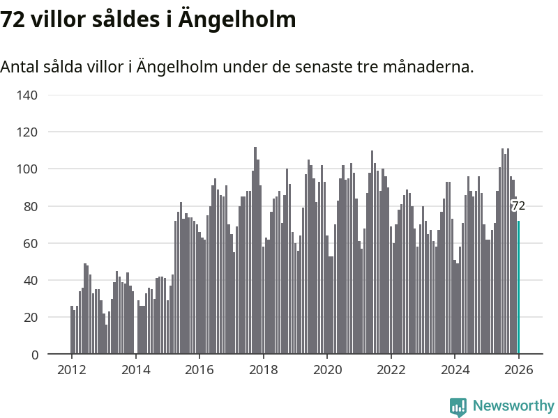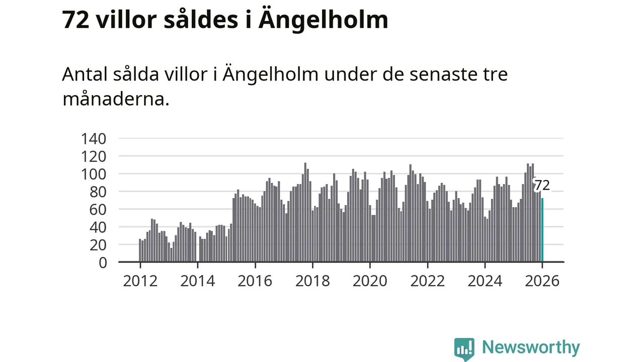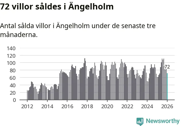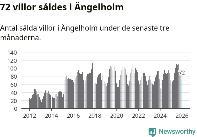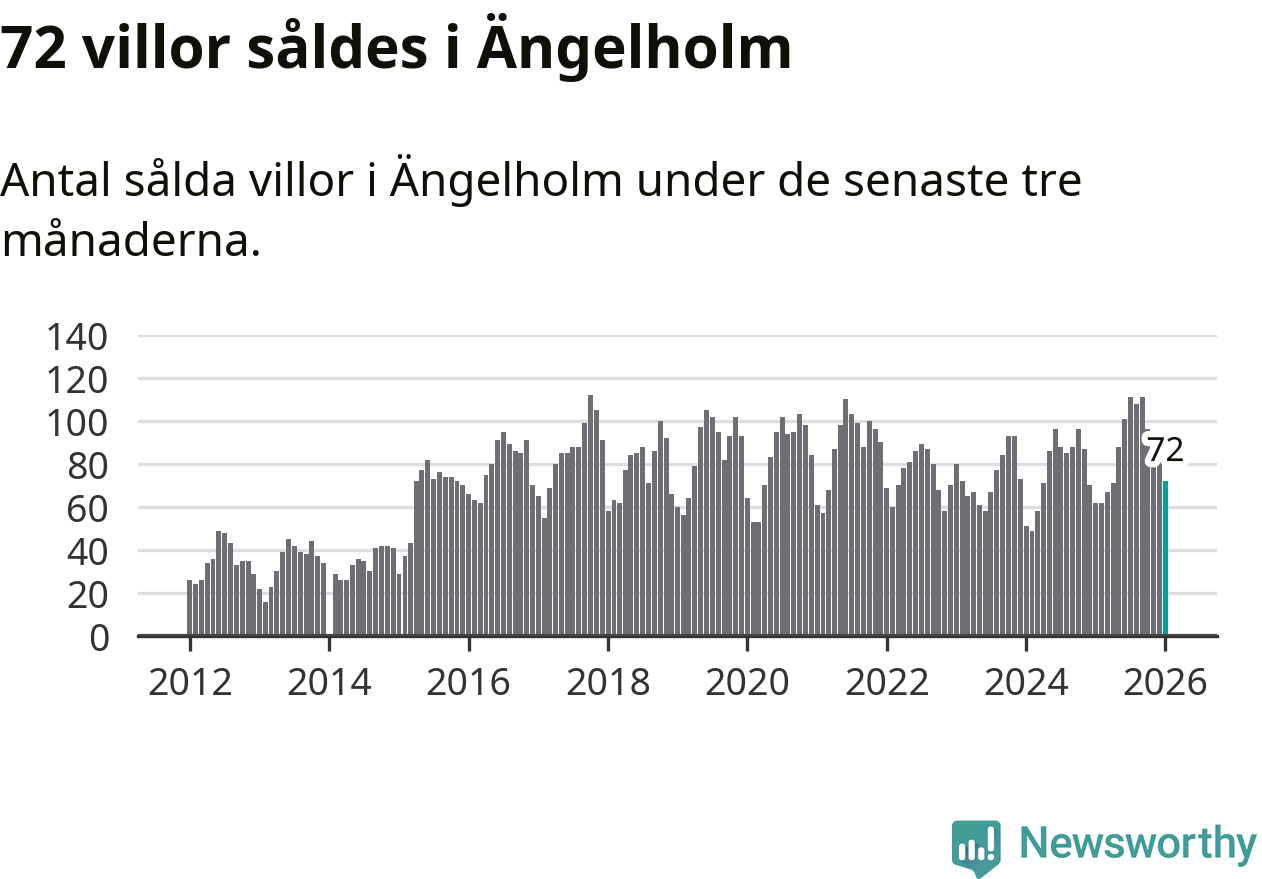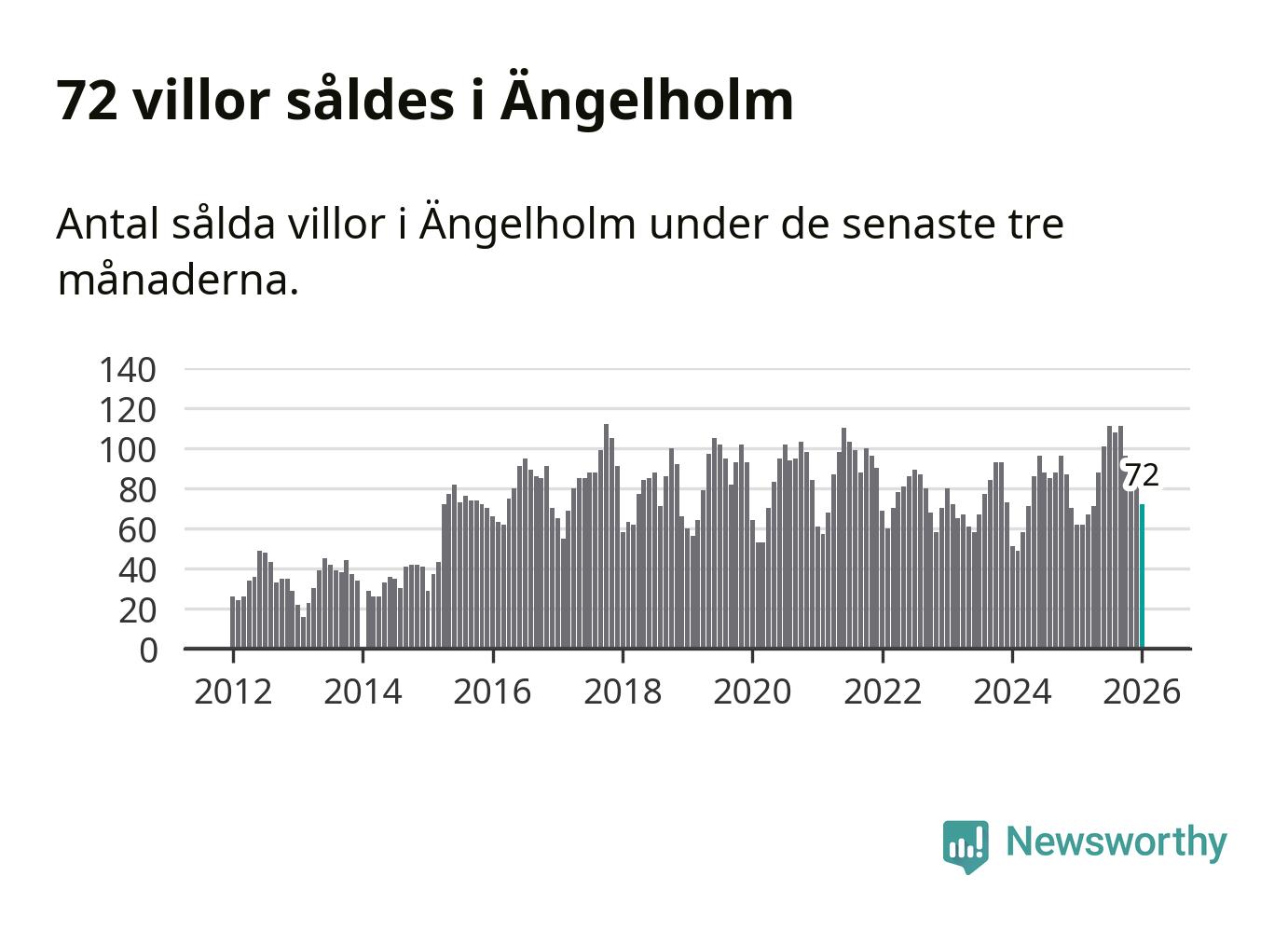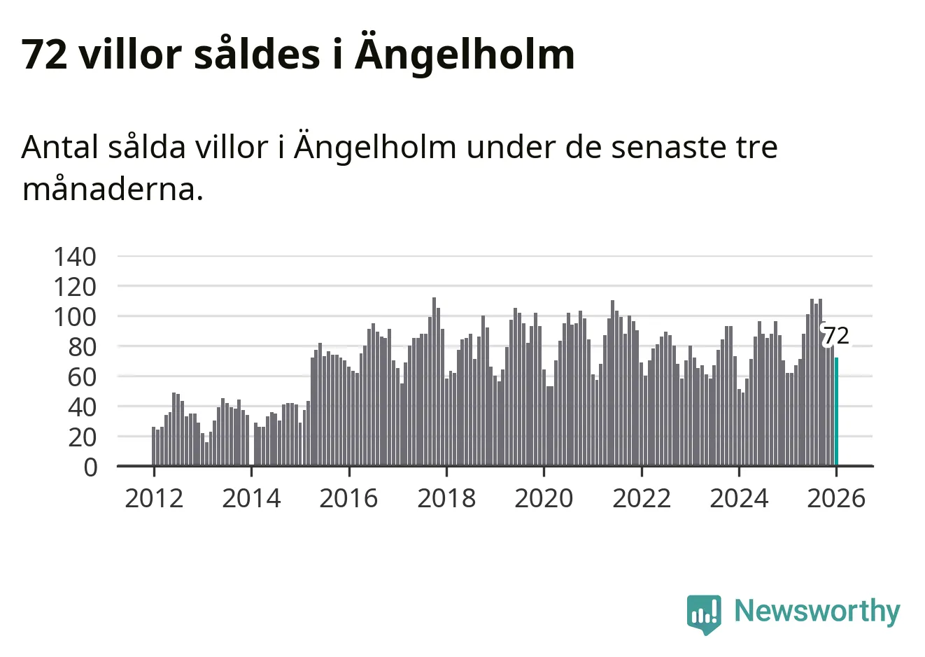 Sammanlagt såldes 72 villor i Ängelholms kommun mellan november och januari till ett genomsnittligt pris på 3,8 miljoner kronor. I fjol gjordes 62 affärer vid den här tiden på året.