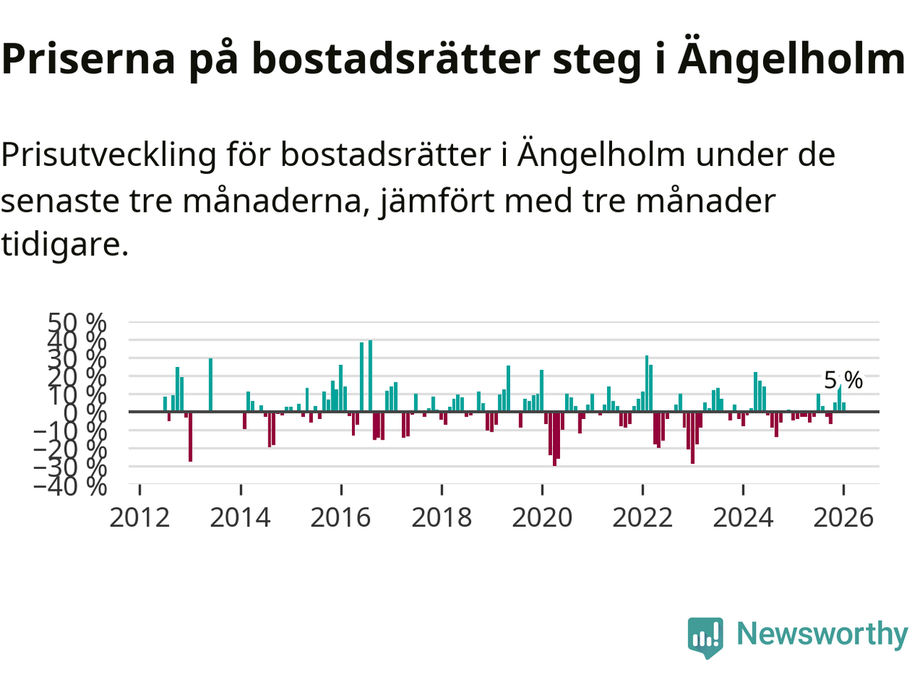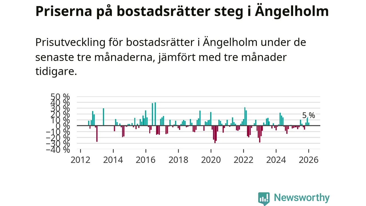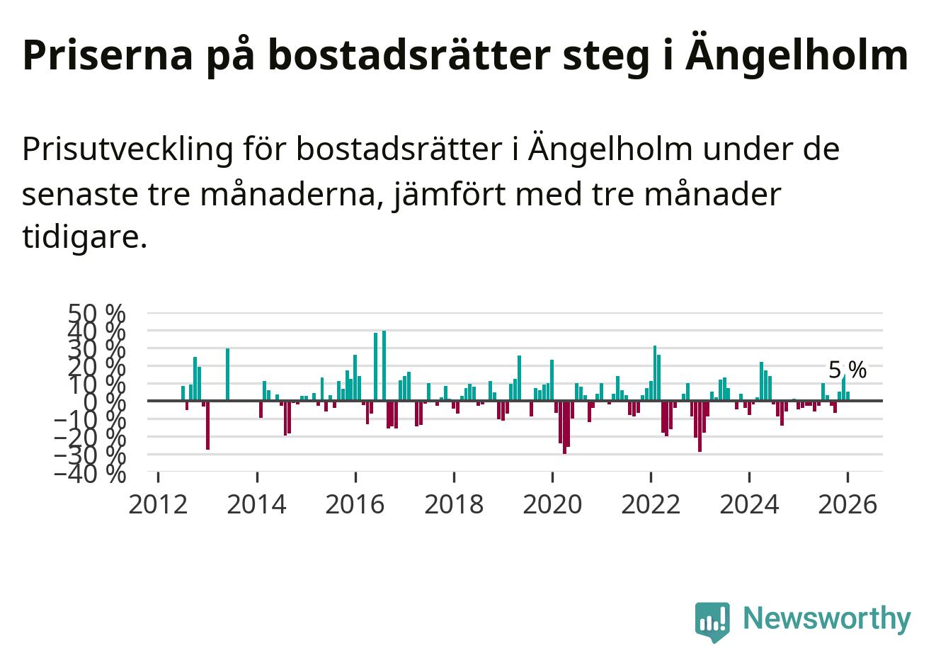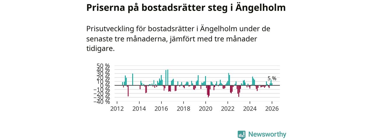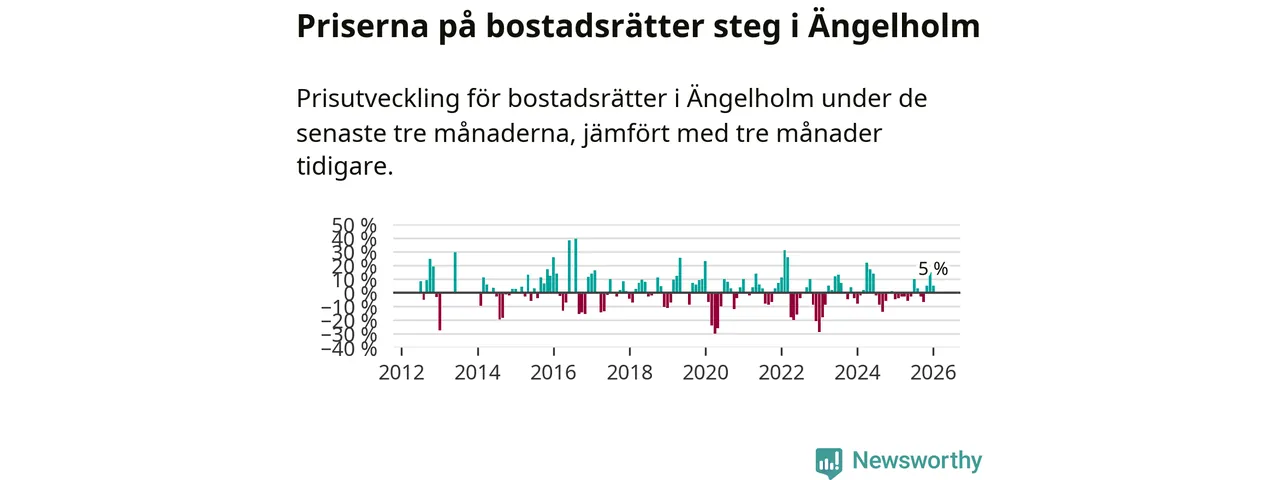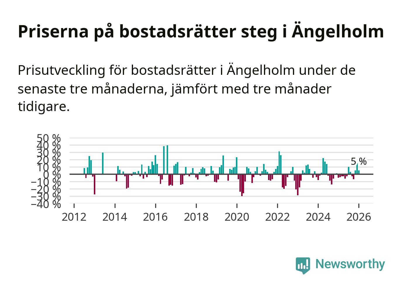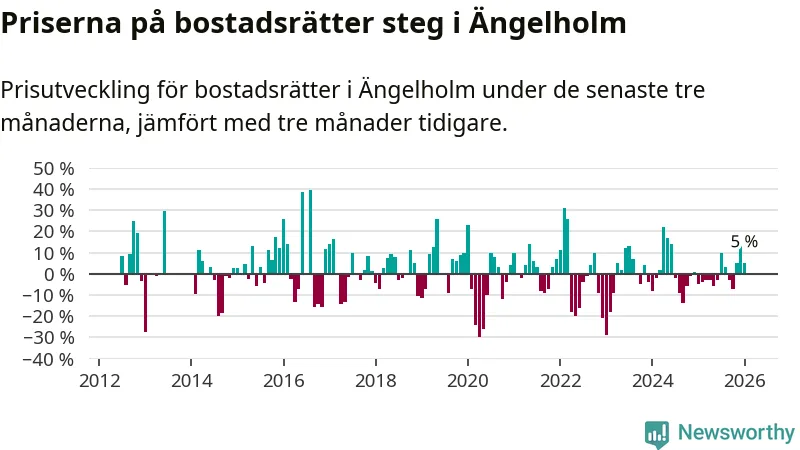 Priserna på bostadsrätter har gått upp i Ängelholms kommun. Medelpriset på försäljningarna under de senaste tre månaderna visar på en uppgång med 5 procent.