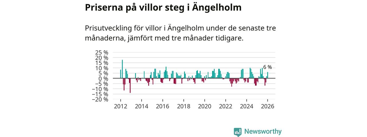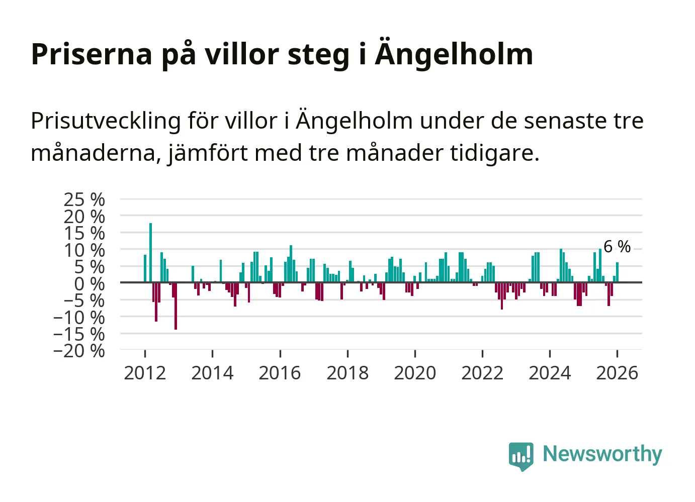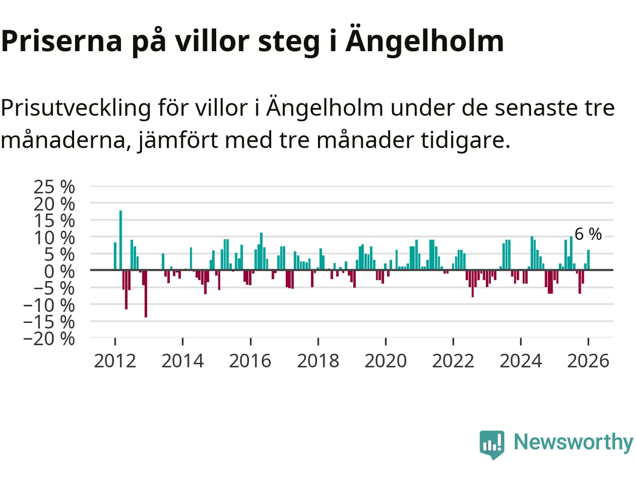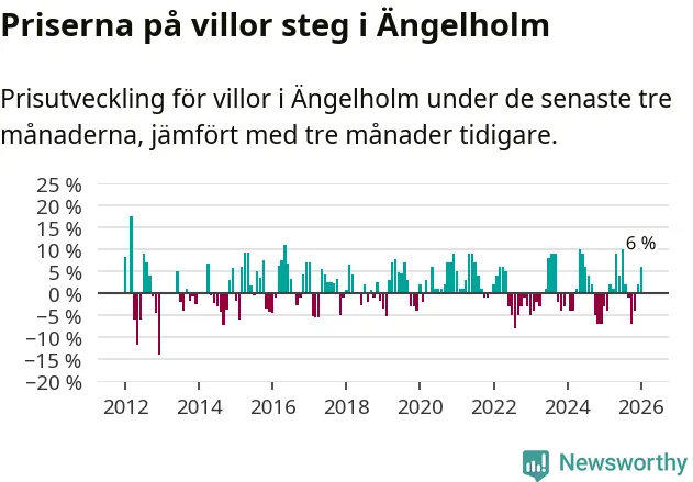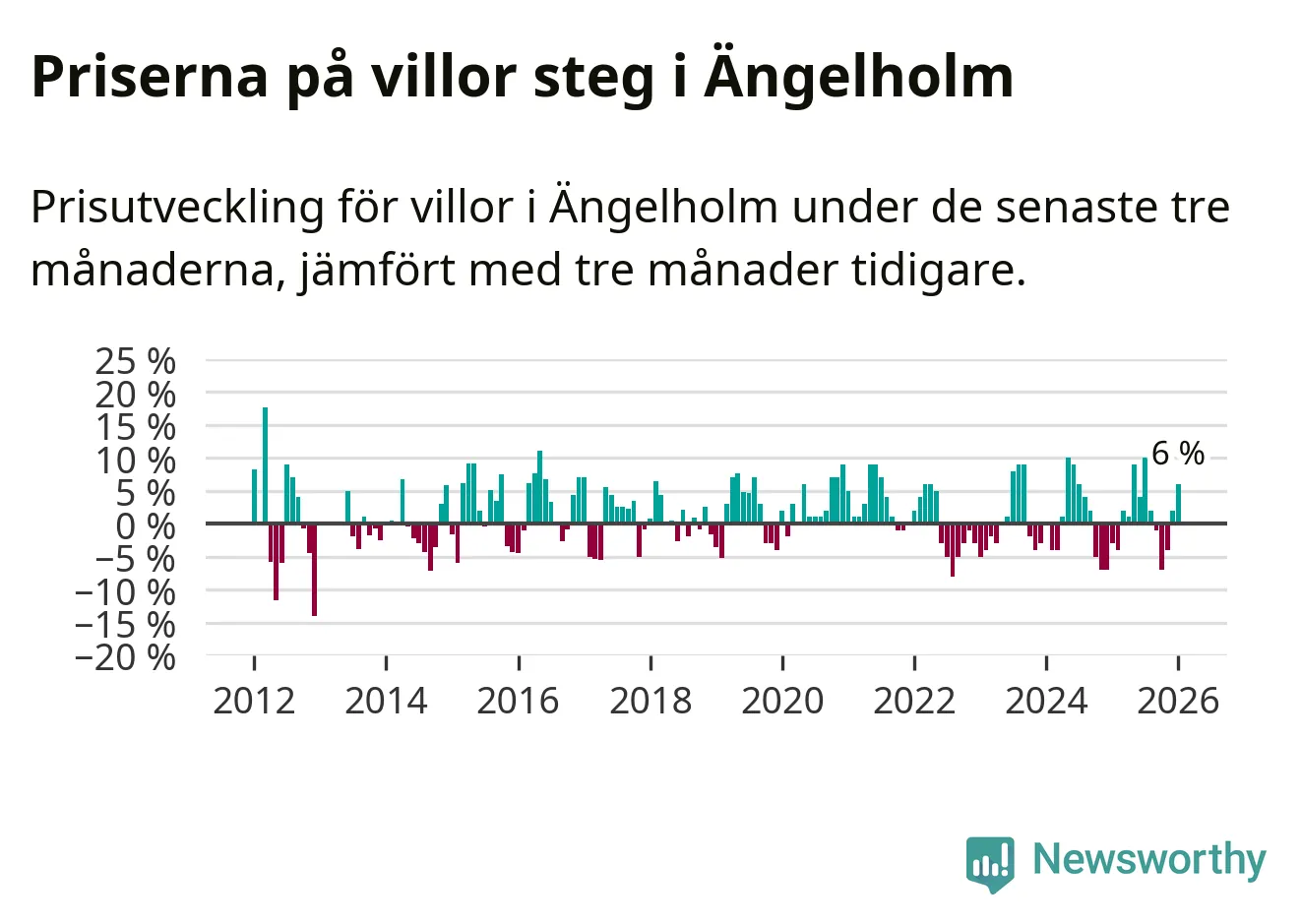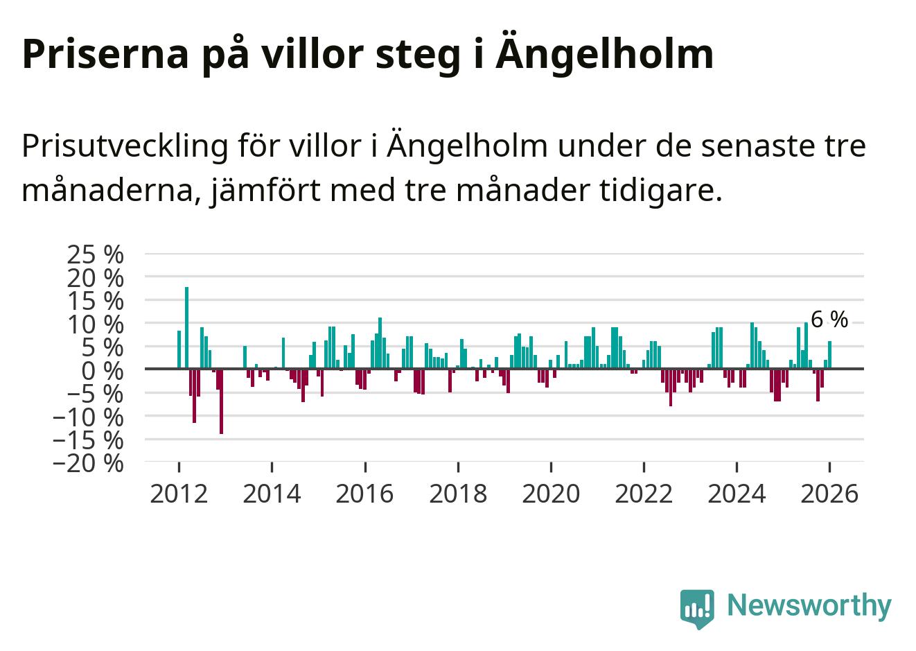 Villapriserna har gått upp i Ängelholms kommun. Medelpriset på försäljningarna under de senaste tre månaderna visar på en uppgång med 6 procent.