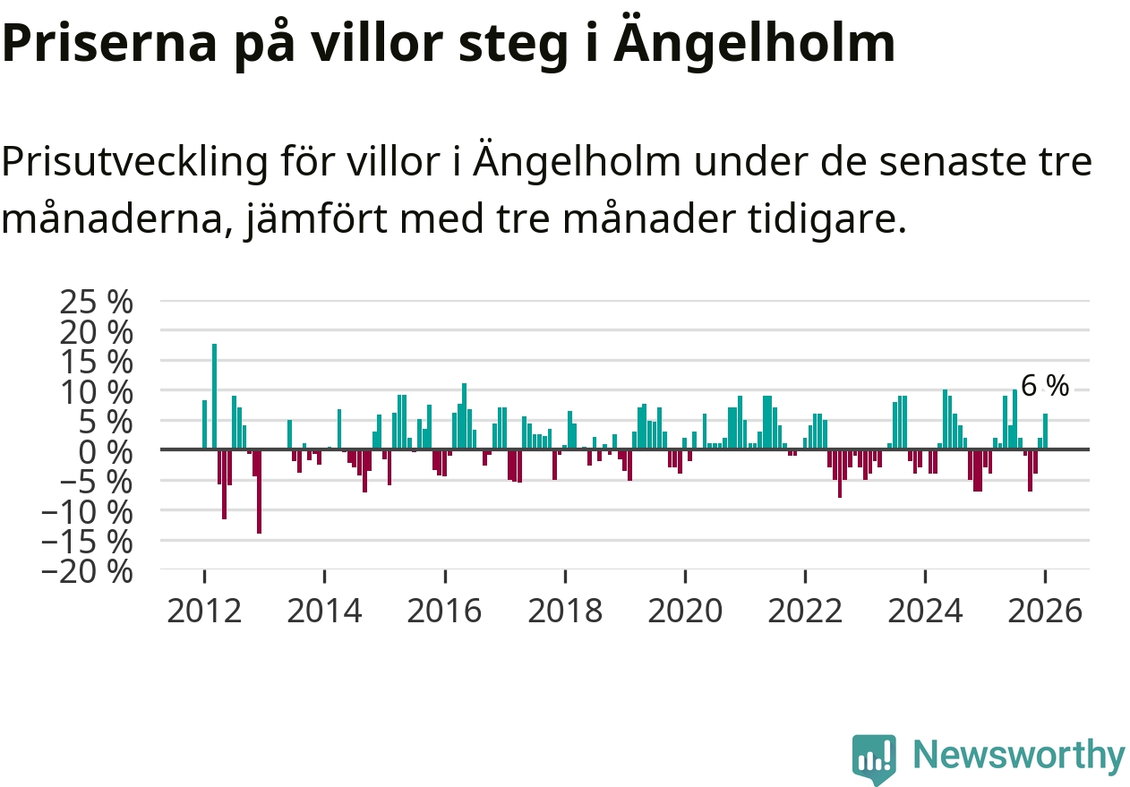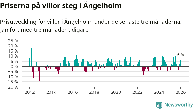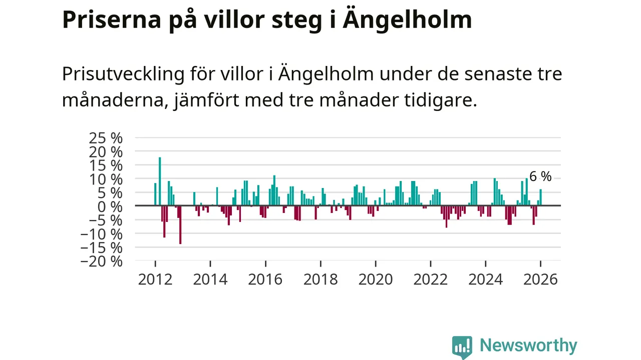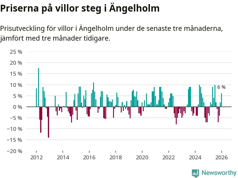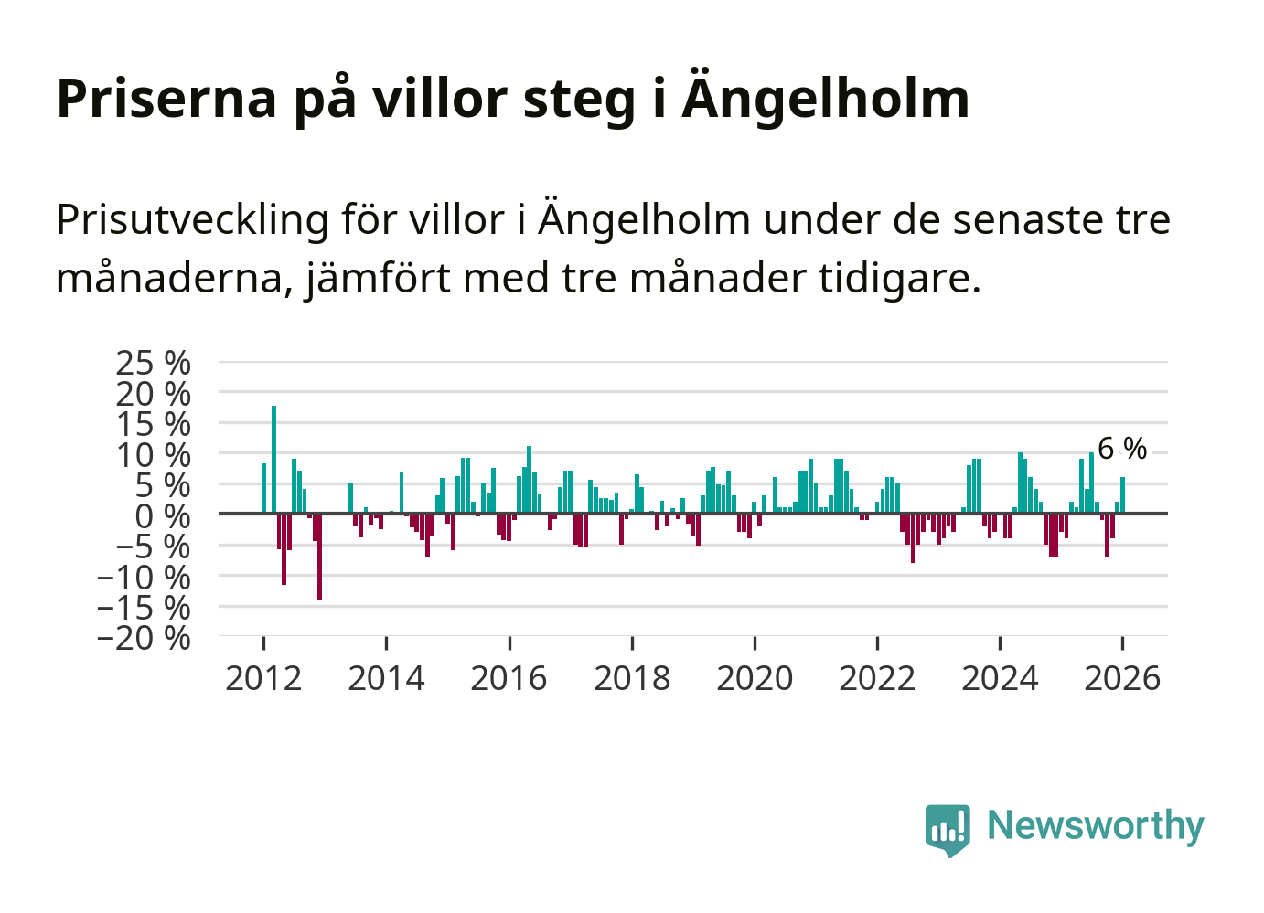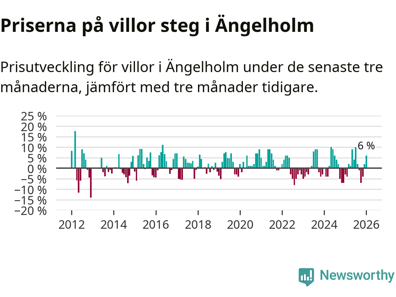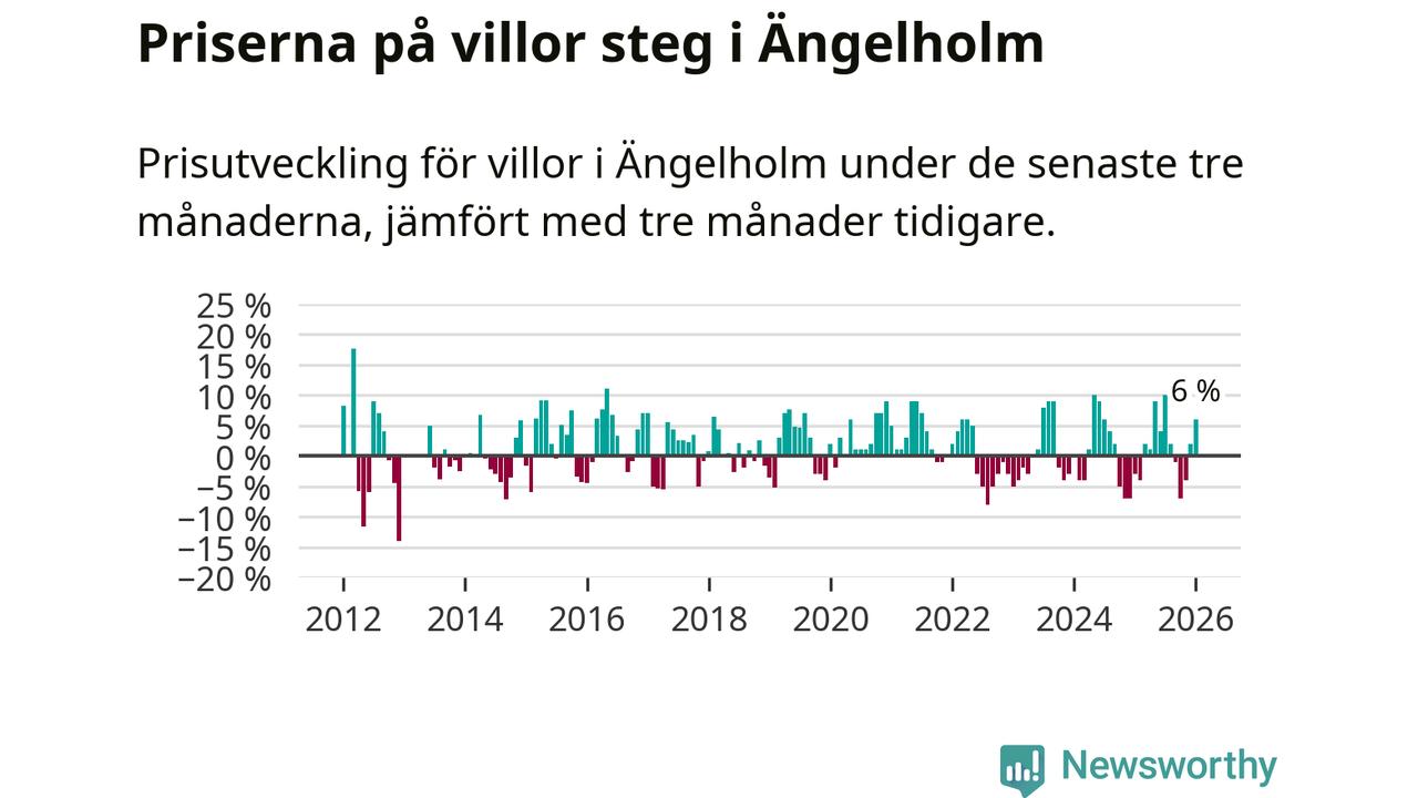 Villapriserna har gått upp i Ängelholms kommun. Medelpriset på försäljningarna under de senaste tre månaderna visar på en uppgång med 6 procent.