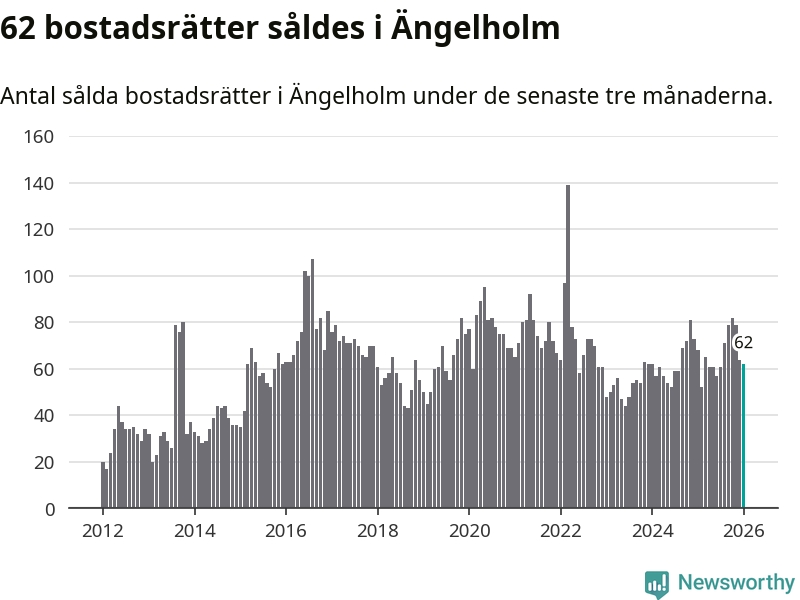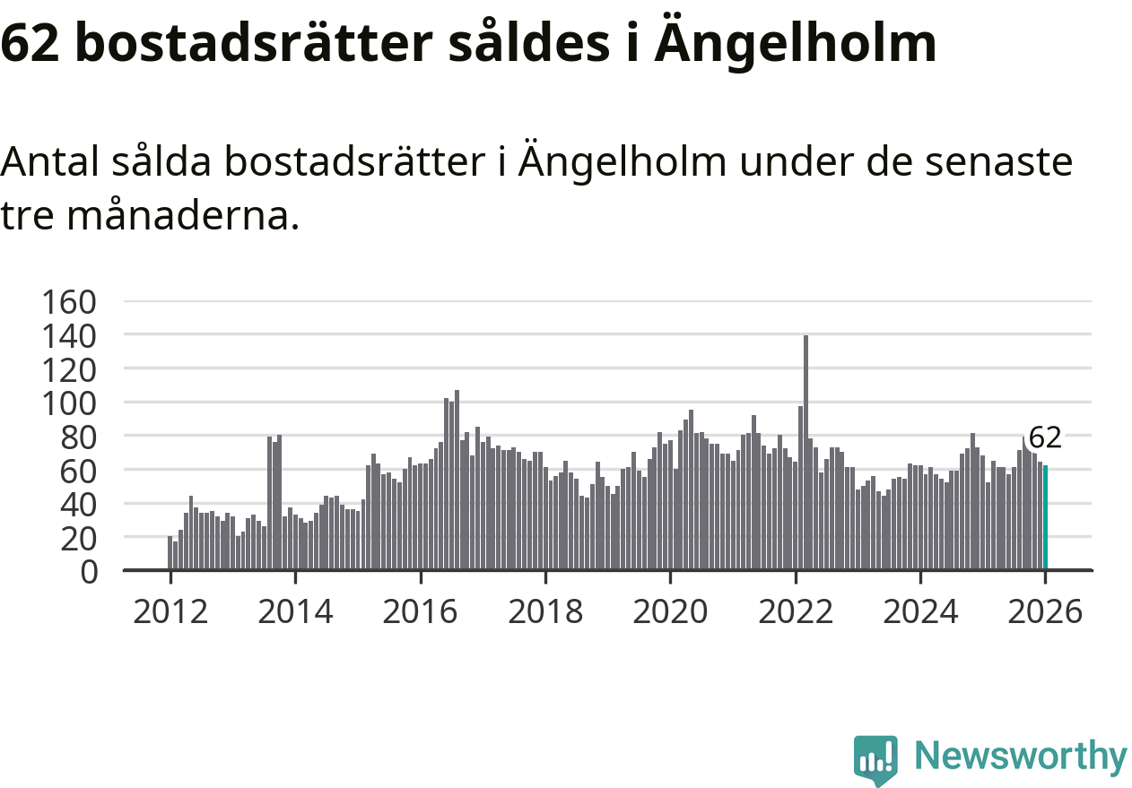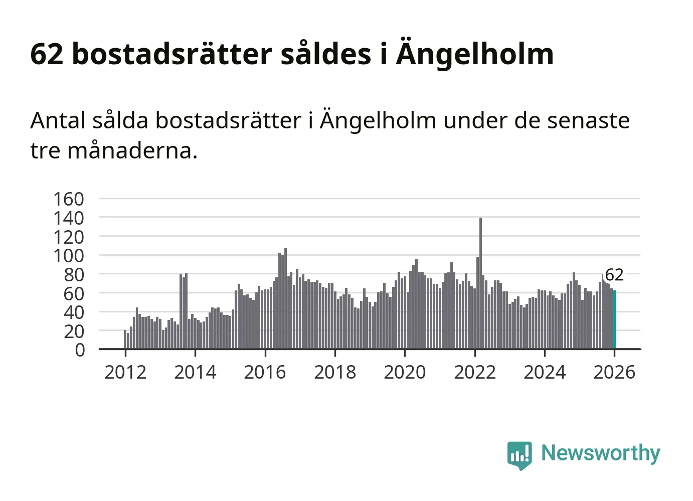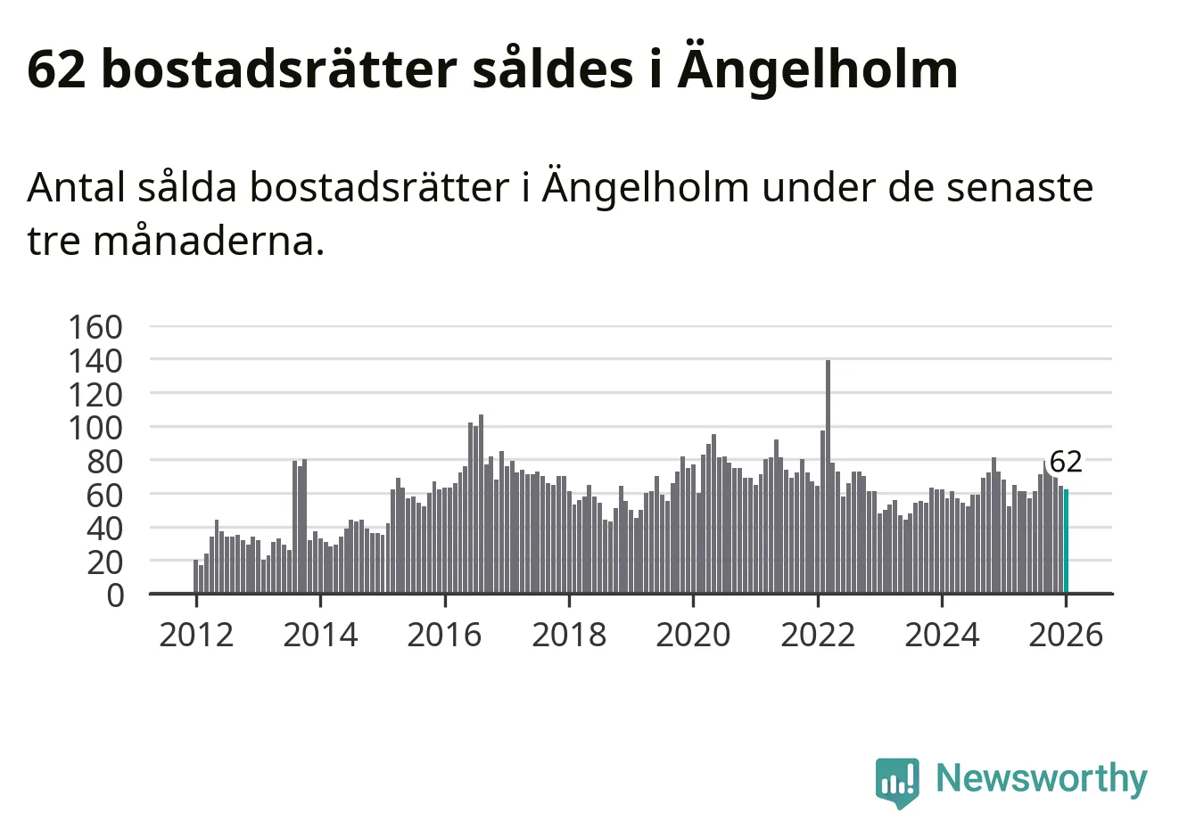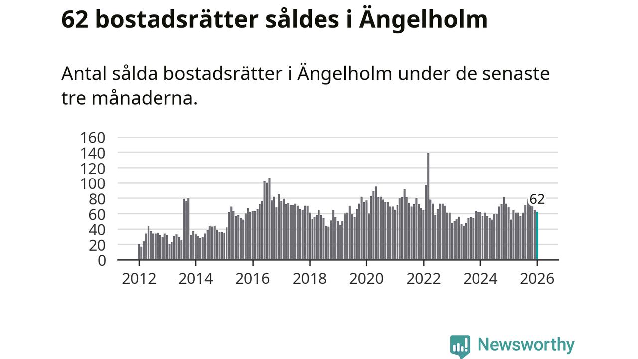 Sammanlagt såldes 62 bostadsrätter i Ängelholms kommun mellan november och januari till ett genomsnittligt pris på 2,3 miljoner kronor. I fjol gjordes 68 affärer vid den här tiden på året.