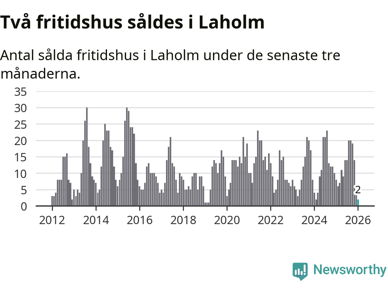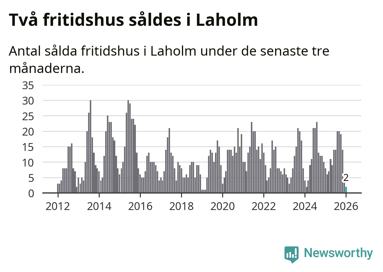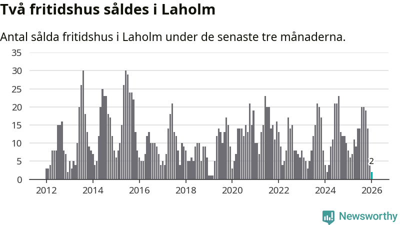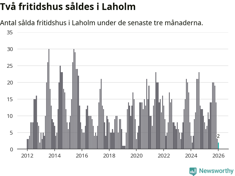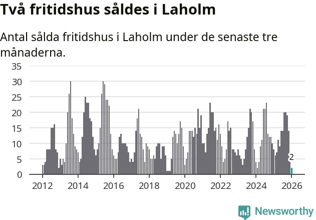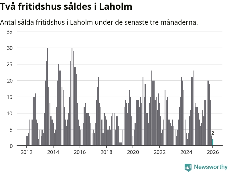 Sammanlagt såldes två fritidshus i Laholms kommun mellan november 2025 och januari till ett genomsnittligt pris på 1,8 miljoner kronor. I fjol gjordes åtta affärer vid den här tiden på året.