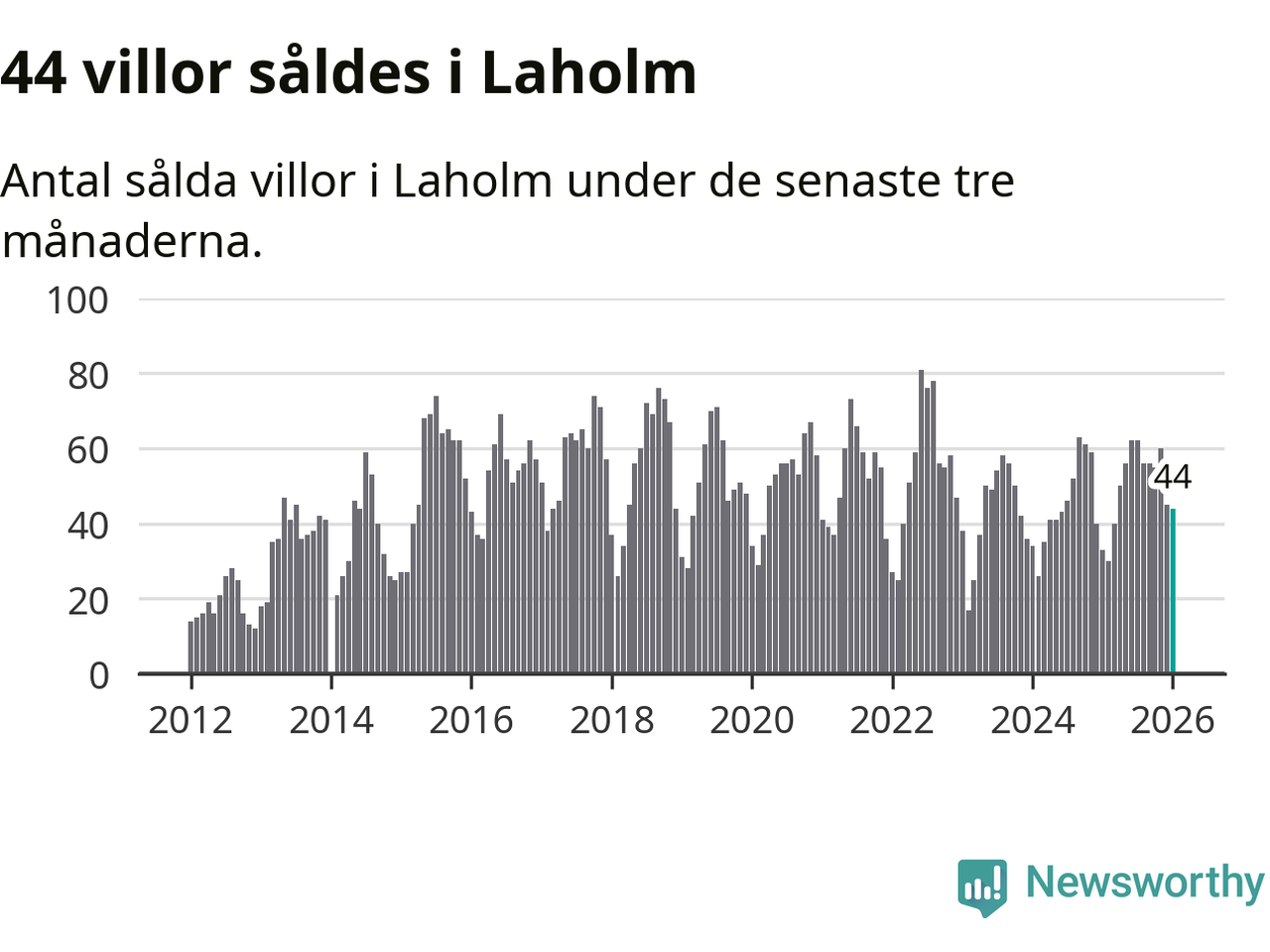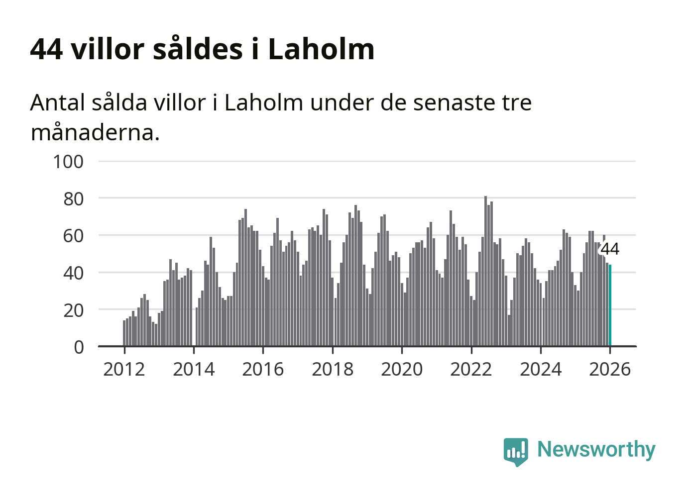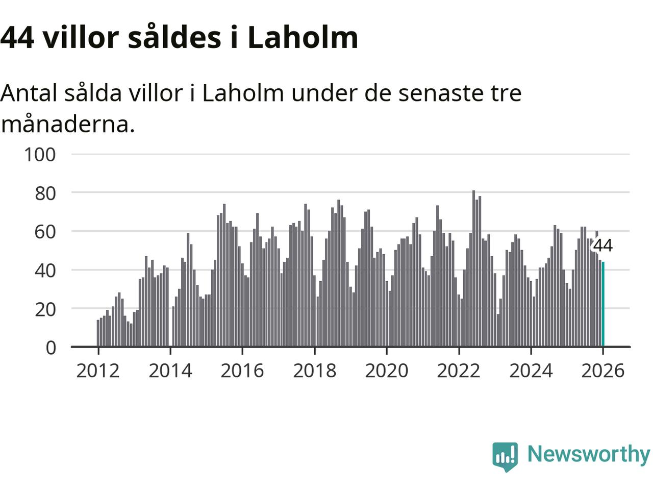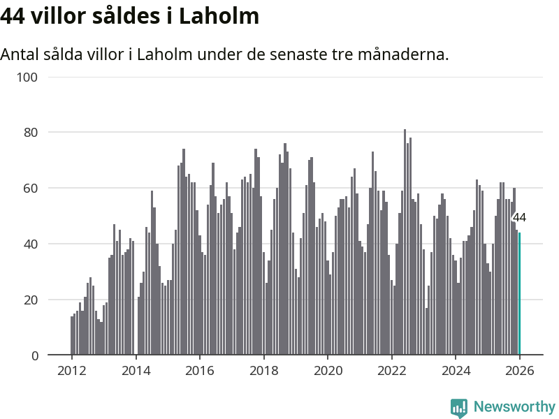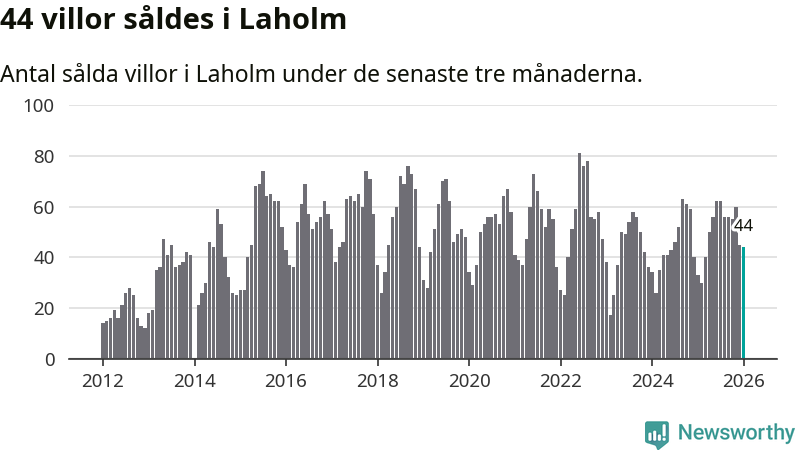 Sammanlagt såldes 44 villor i Laholms kommun mellan november och januari till ett genomsnittligt pris på 3,2 miljoner kronor. I fjol gjordes 33 affärer vid den här tiden på året.