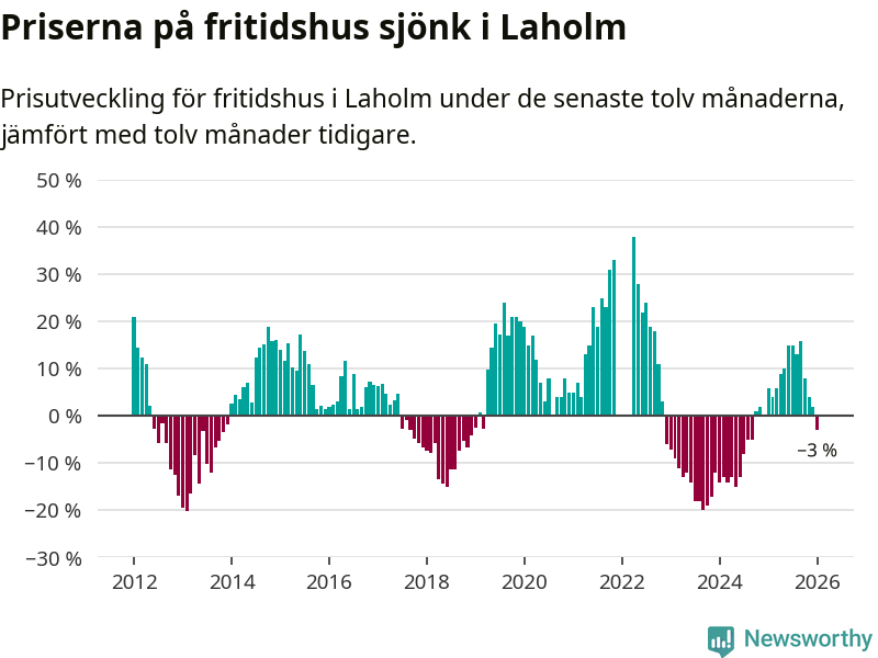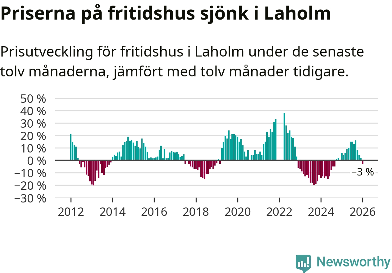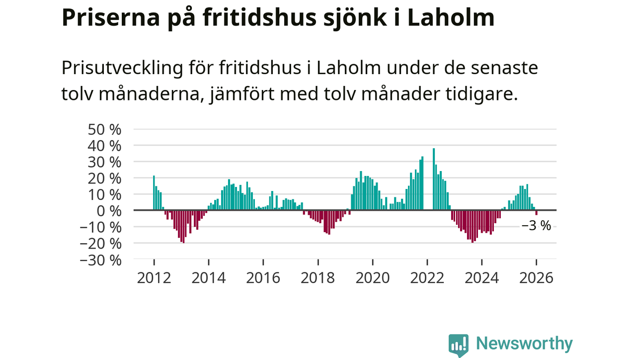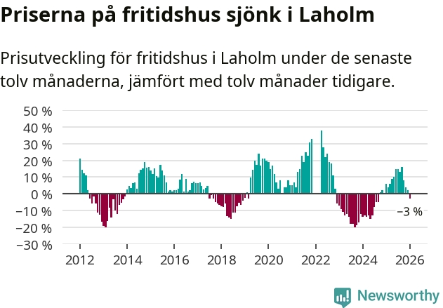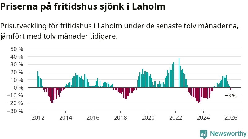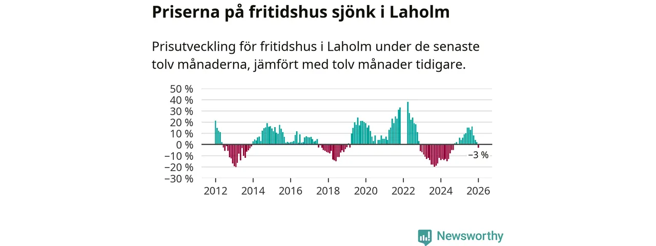 Priserna på fritidshus har gått ner i Laholms kommun. Medelpriset på försäljningarna under de senaste tolv månaderna visar på en nedgång med 3 procent.