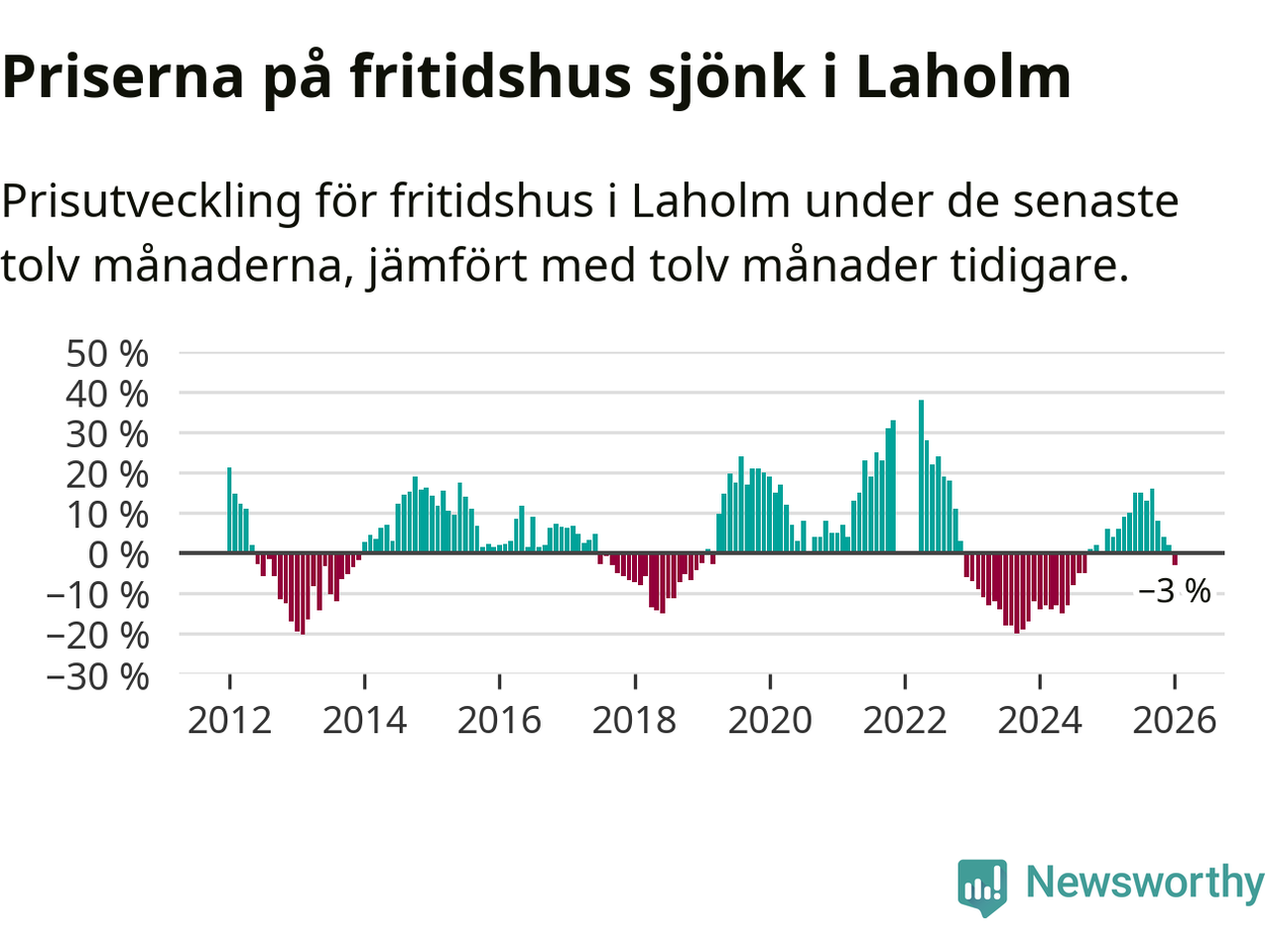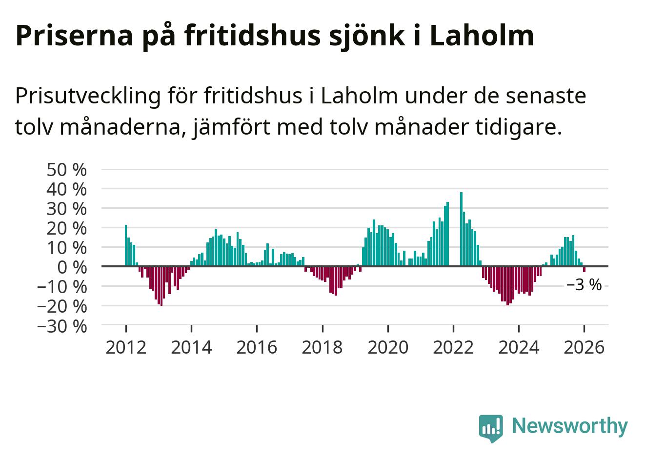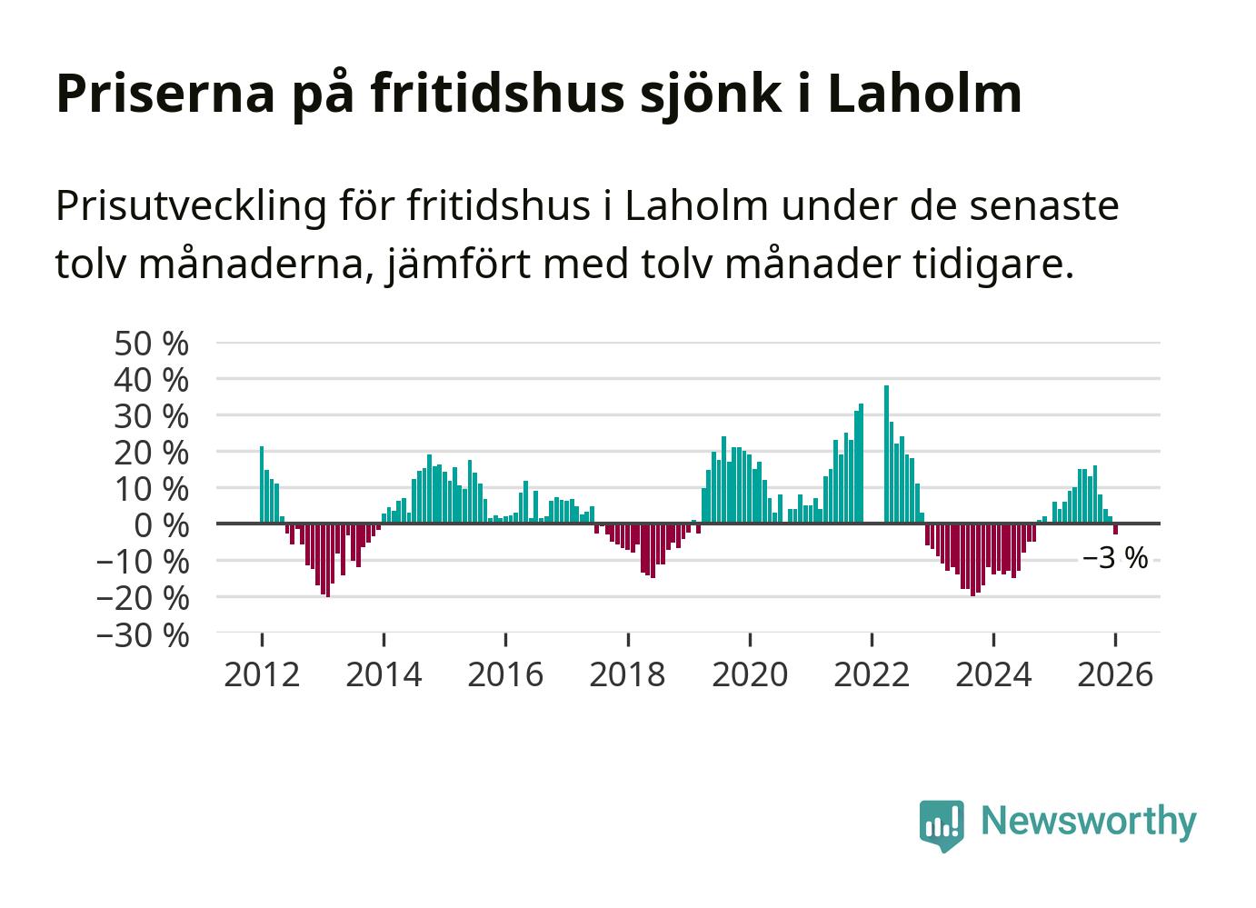 Priserna på fritidshus har gått ner i Laholms kommun. Medelpriset på försäljningarna under de senaste tolv månaderna visar på en nedgång med 3 procent.