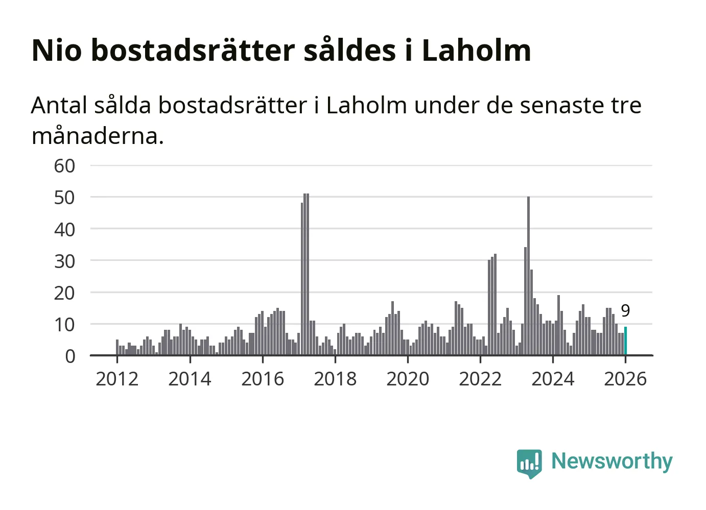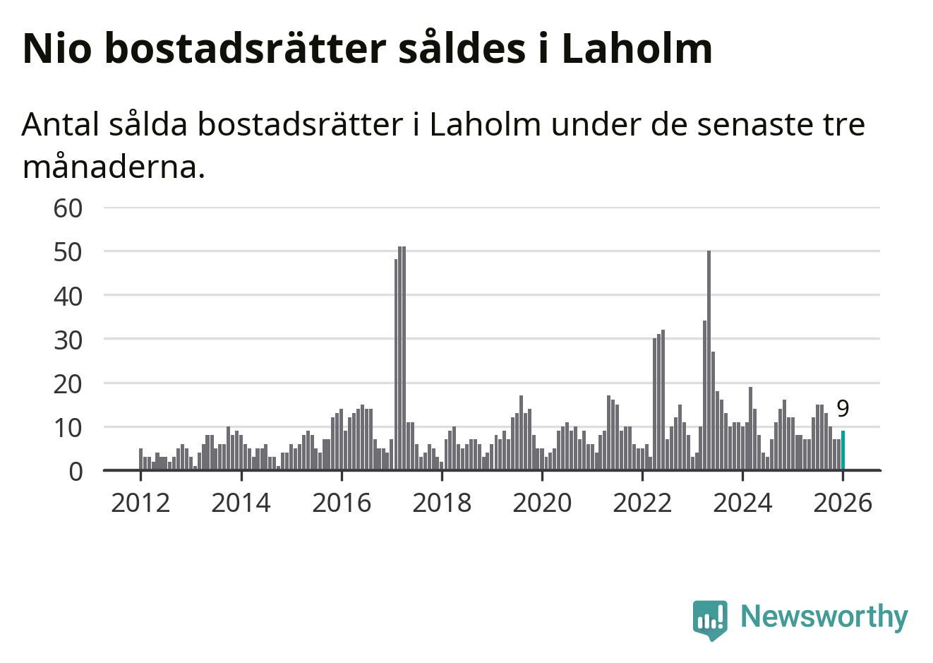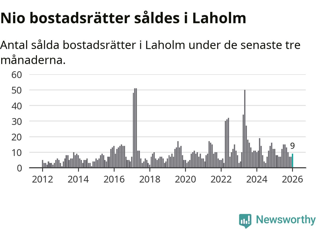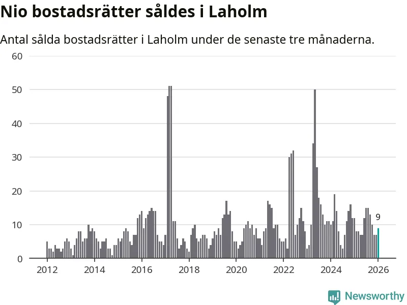 Mellan november och januari gjordes sammanlagt nio affärer med bostadsrätter i Laholms kommun. Det kan jämföras med tolv vid motsvarande tid i fjol.