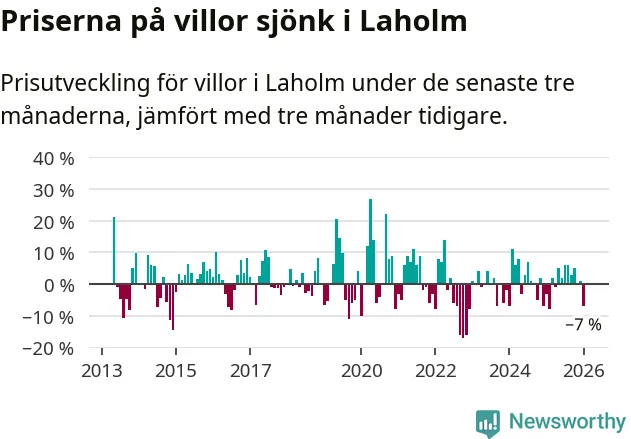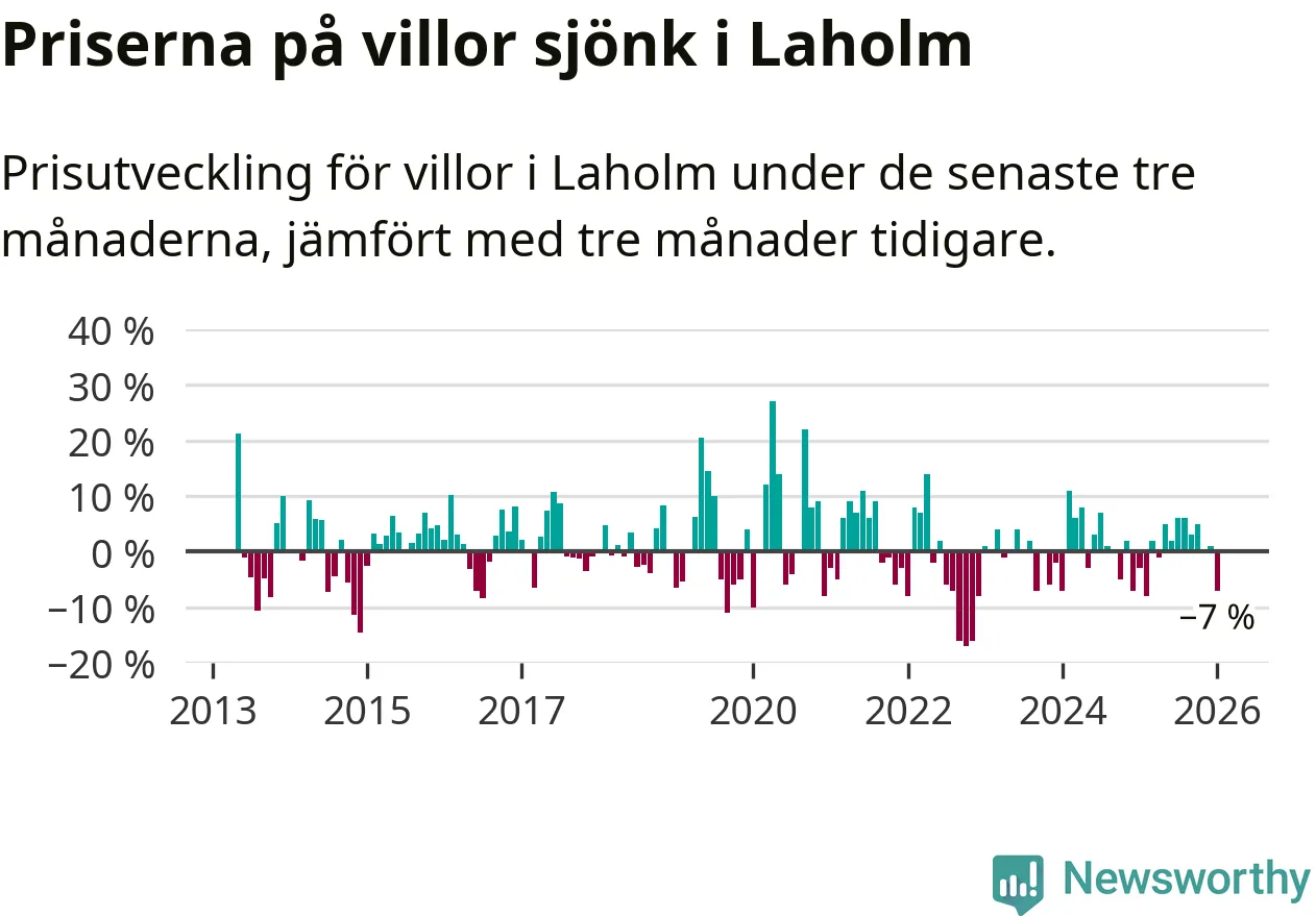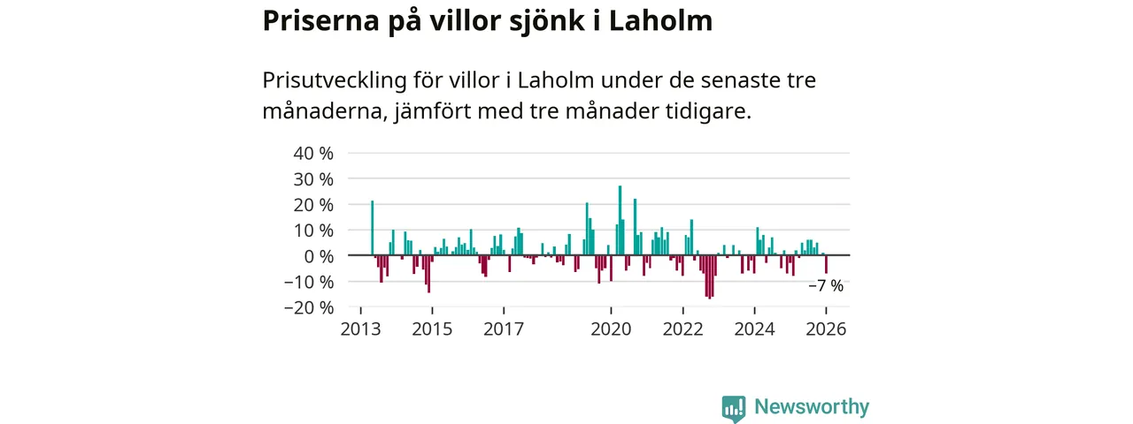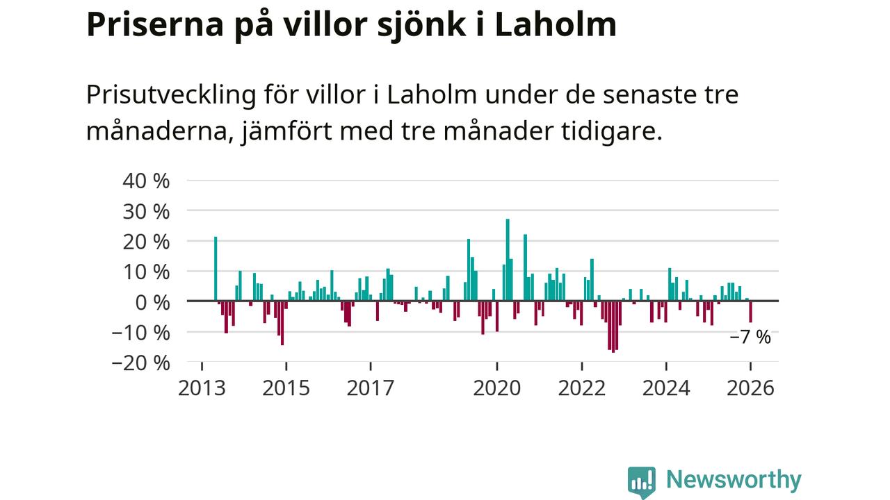 Villapriserna har gått ner i Laholms kommun. Medelpriset på försäljningarna under de senaste tre månaderna visar på en nedgång med 7 procent.