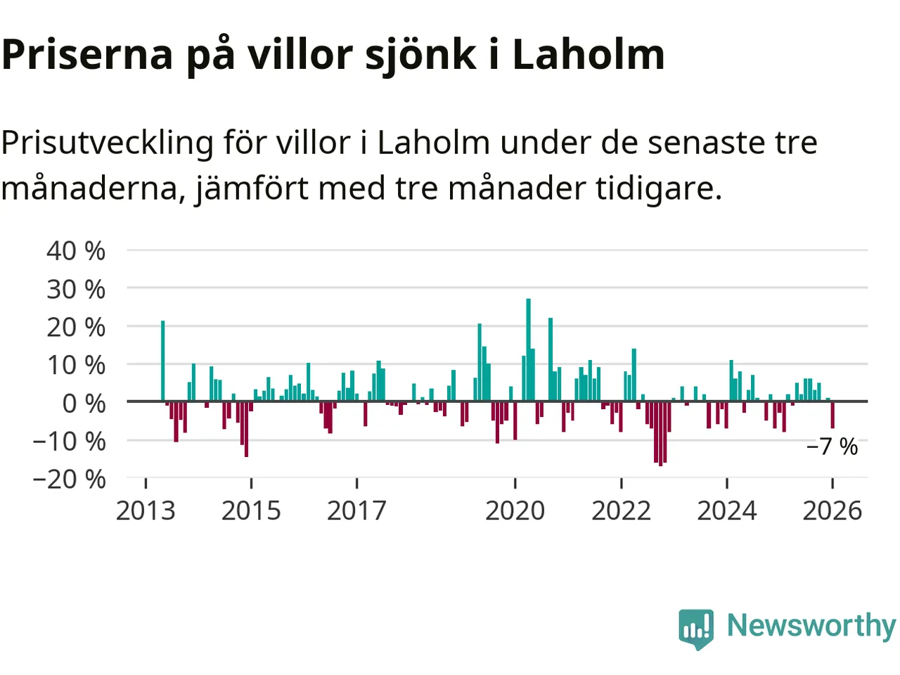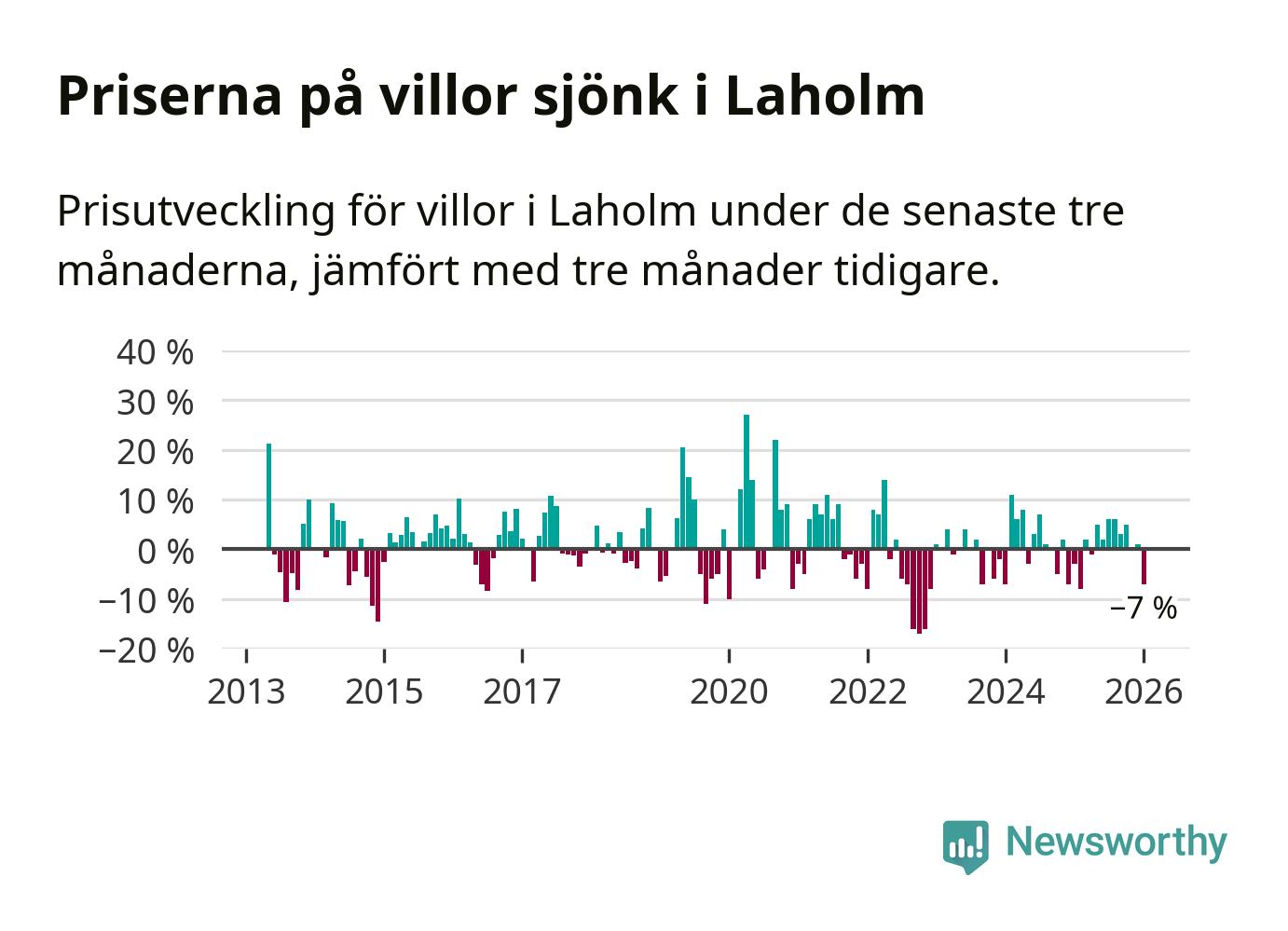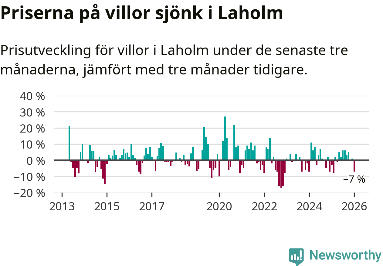 Villapriserna har gått ner i Laholms kommun. Medelpriset på försäljningarna under de senaste tre månaderna visar på en nedgång med 7 procent.