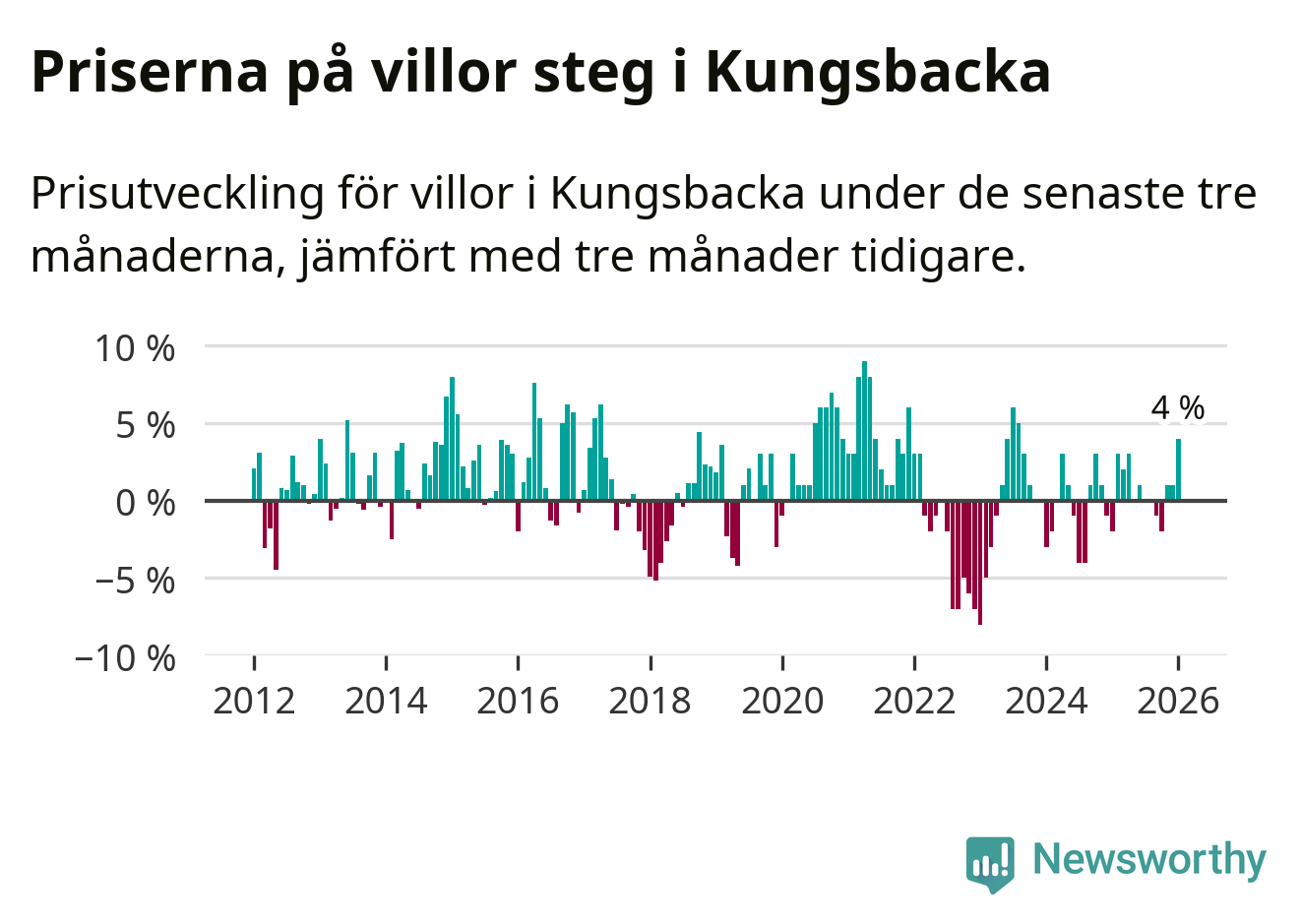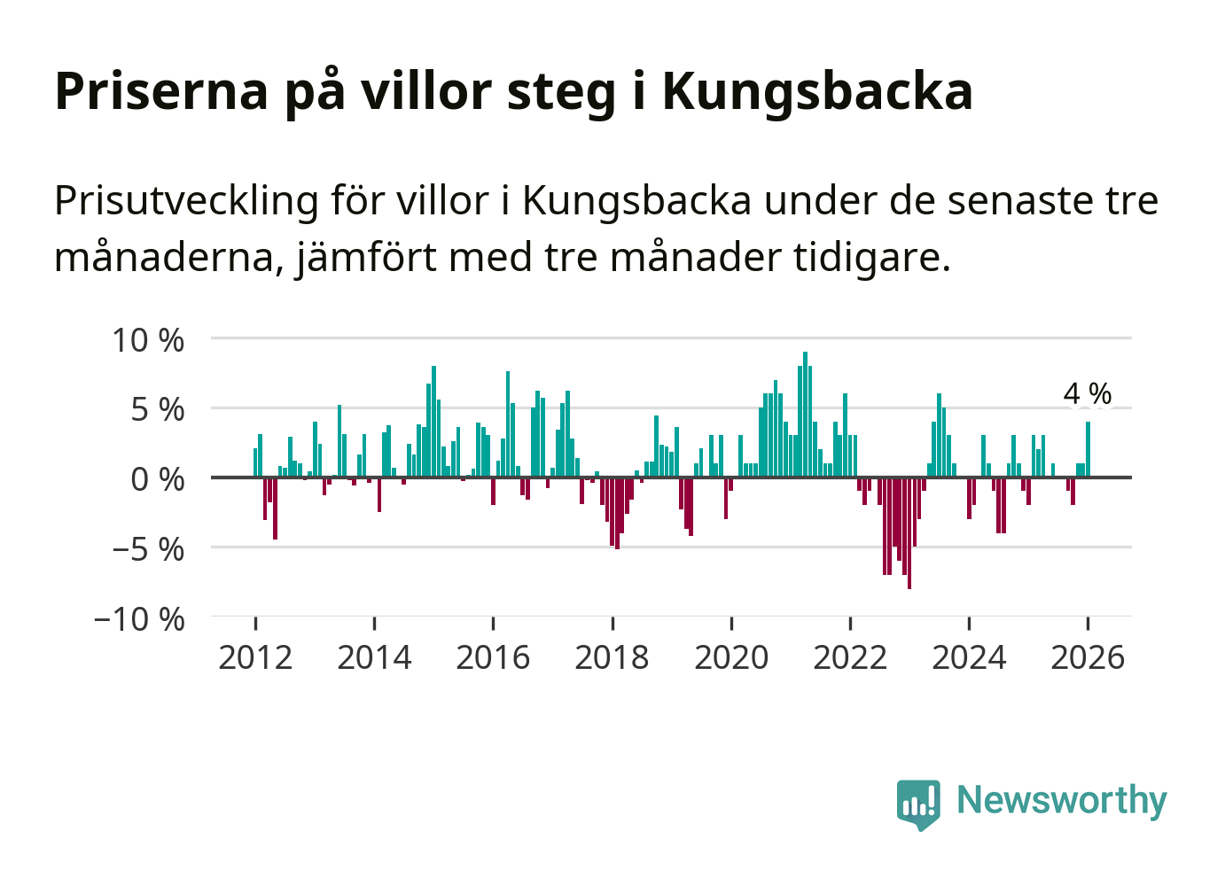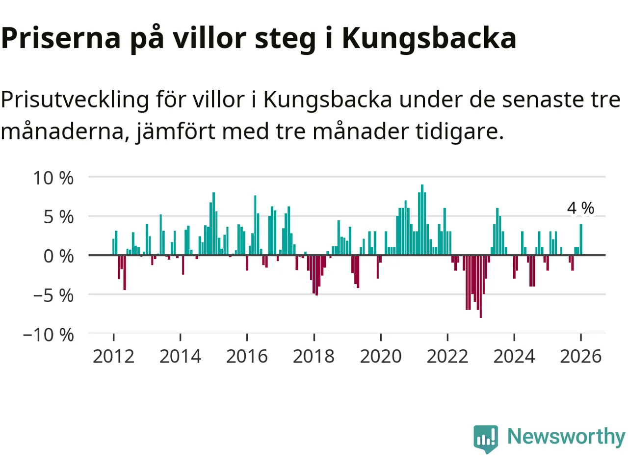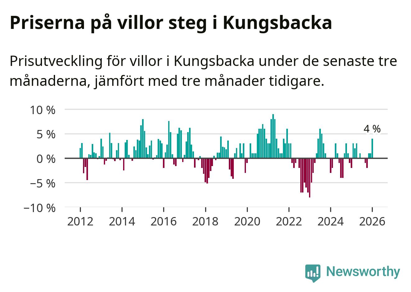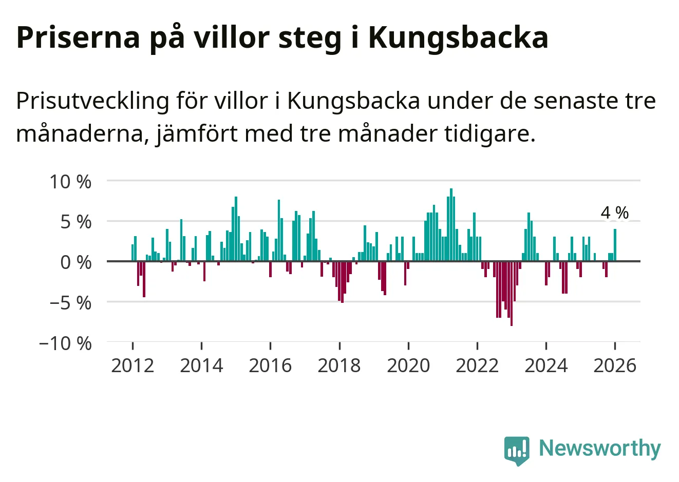 Villapriserna har gått upp i Kungsbacka kommun. Medelpriset på försäljningarna under de senaste tre månaderna visar på en uppgång med 4 procent.