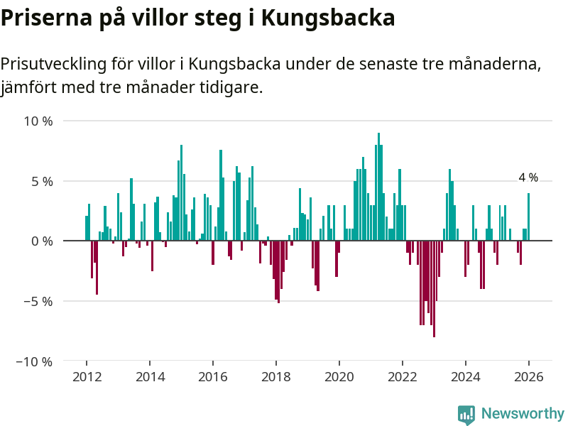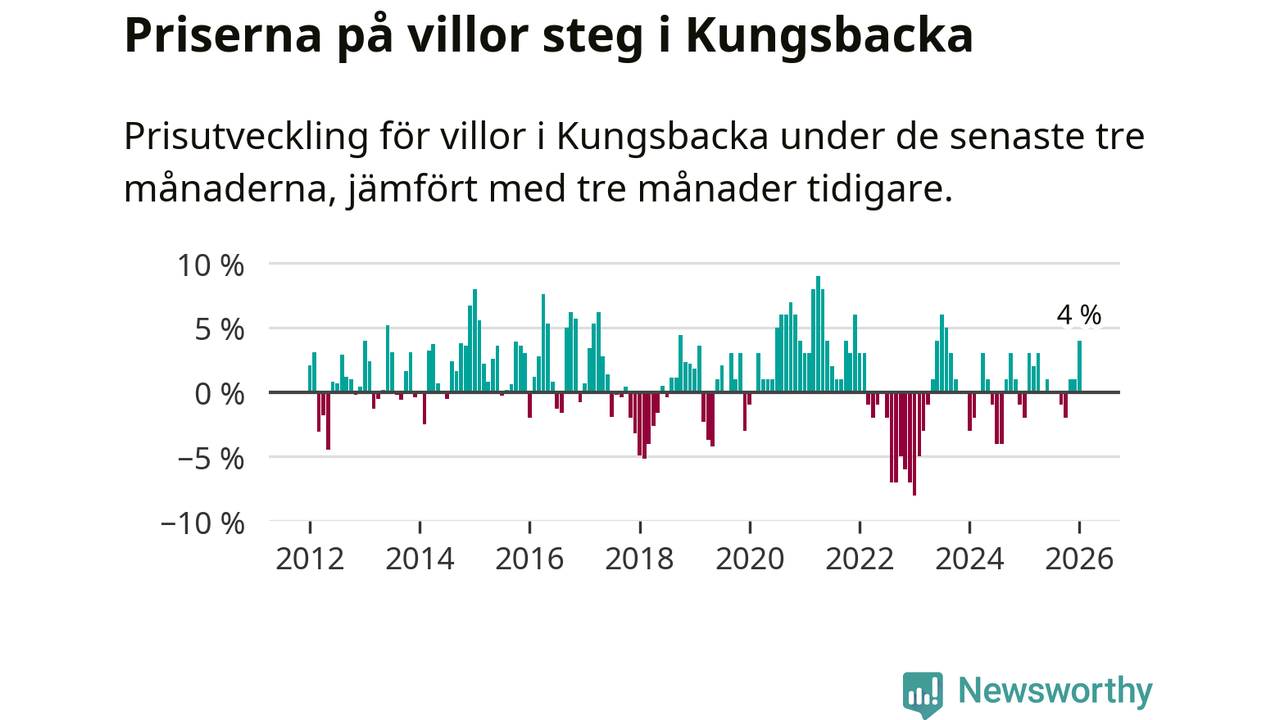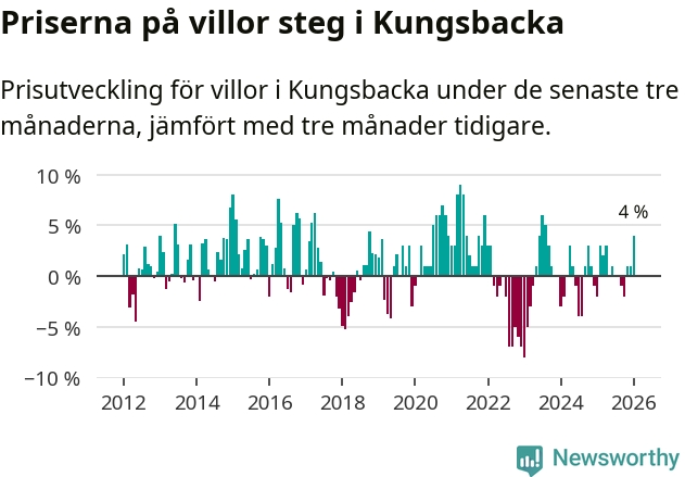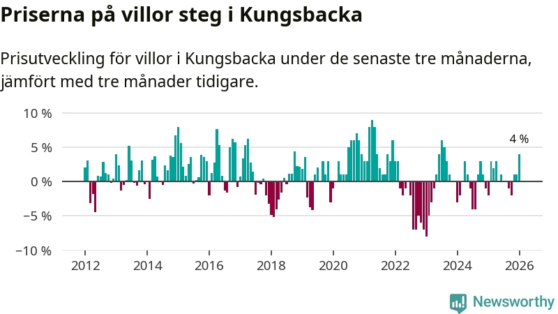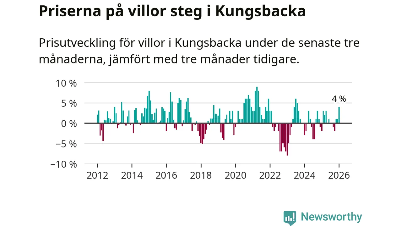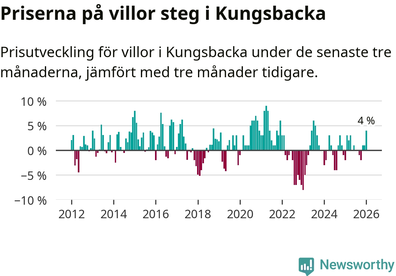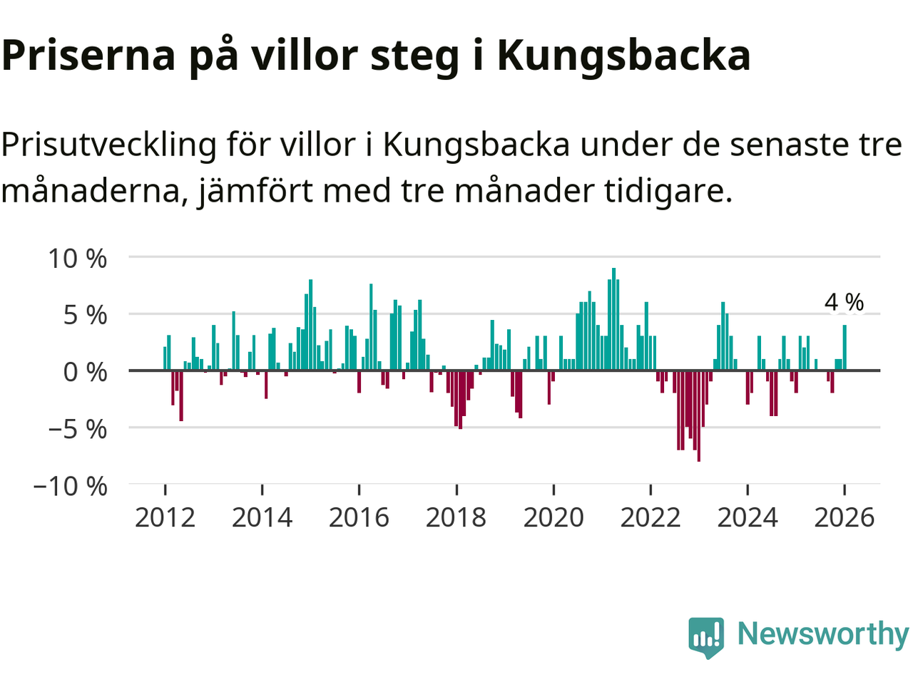Villapriserna har gått upp i Kungsbacka kommun. Medelpriset på försäljningarna under de senaste tre månaderna visar på en uppgång med 4 procent.