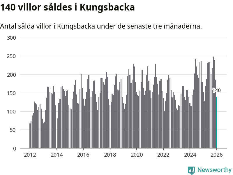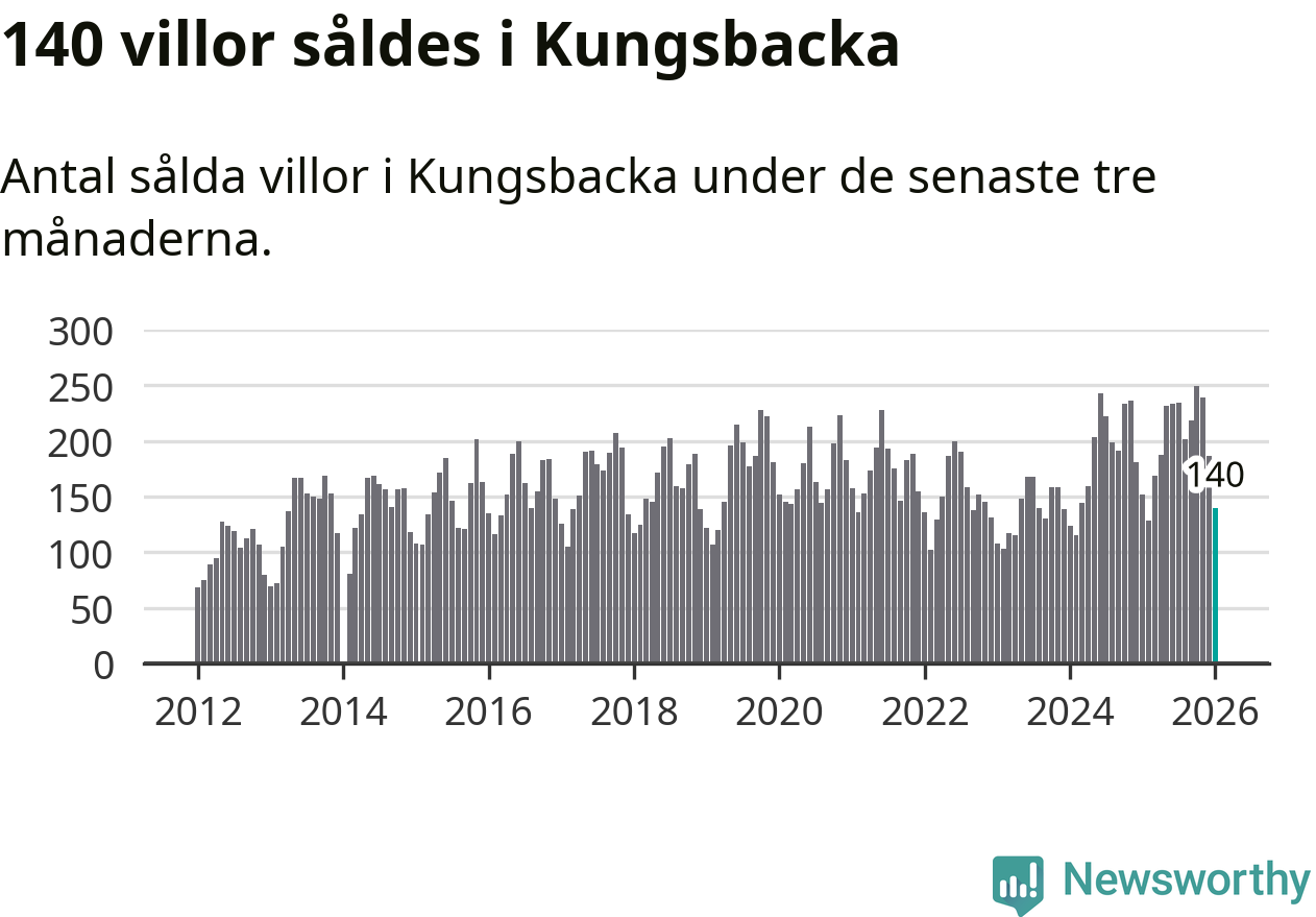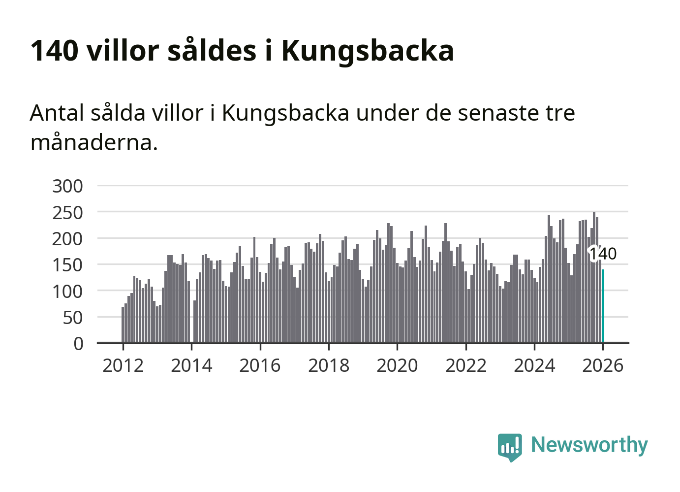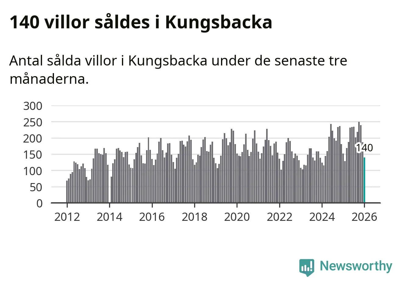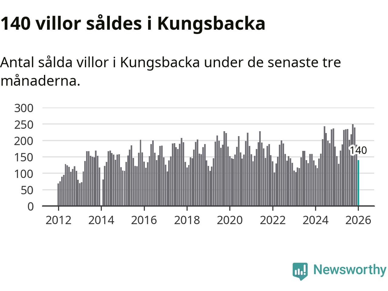 Sammanlagt såldes 140 villor i Kungsbacka kommun mellan november och januari till ett genomsnittligt pris på 6,0 miljoner kronor. I fjol gjordes 152 affärer vid den här tiden på året.