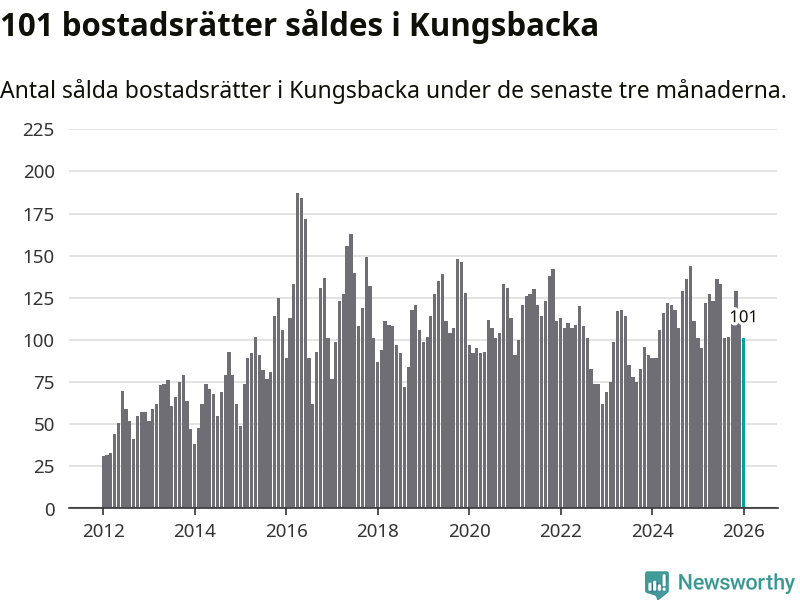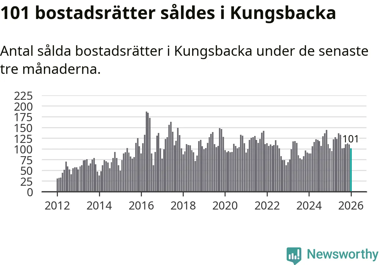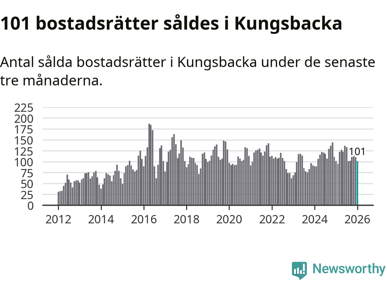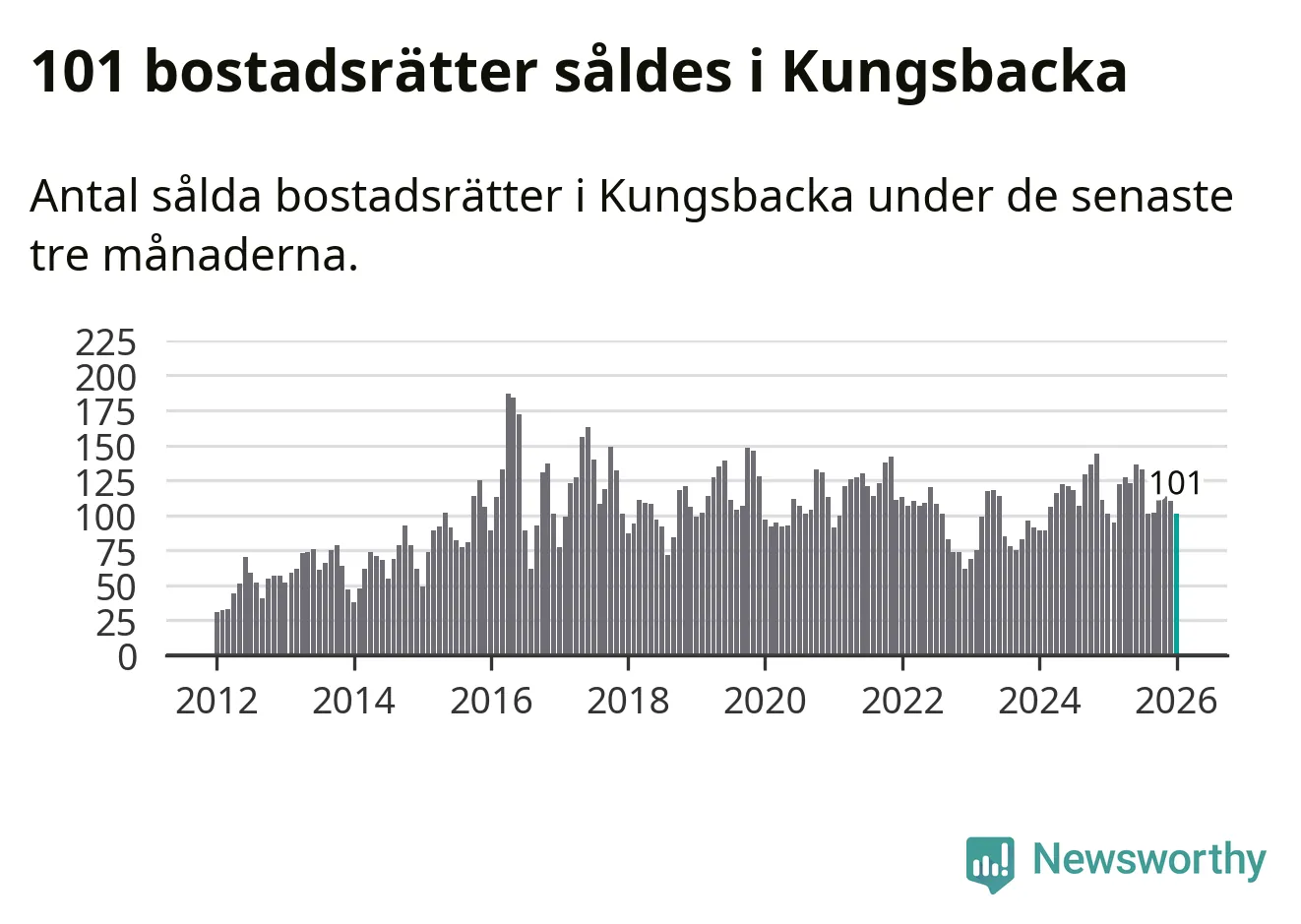Sammanlagt såldes 101 bostadsrätter i Kungsbacka kommun mellan november och januari till ett genomsnittligt pris på 3,6 miljoner kronor. I fjol gjordes 101 affärer vid den här tiden på året.
