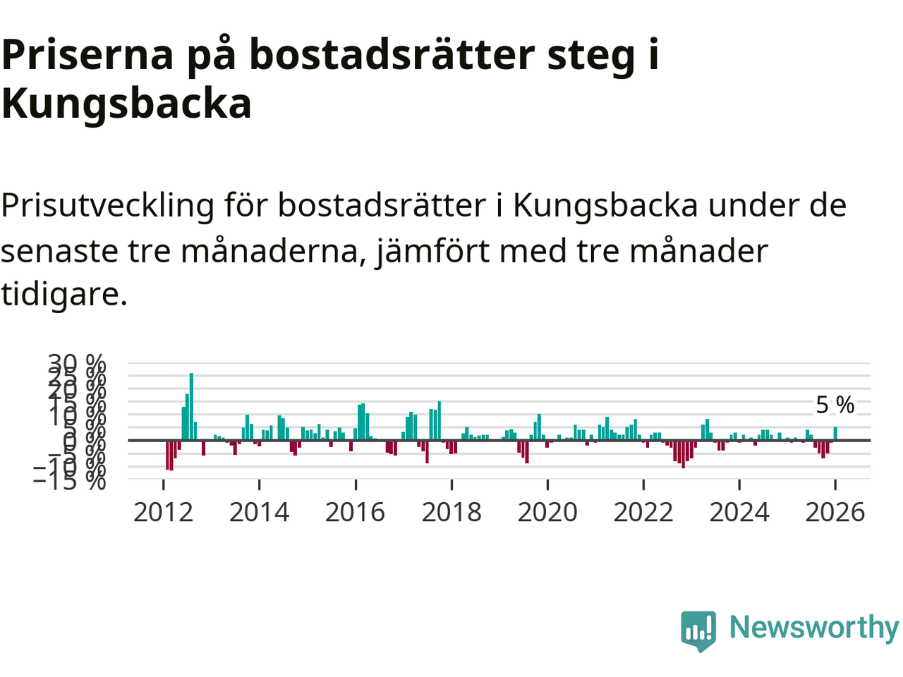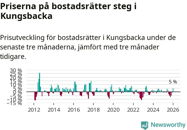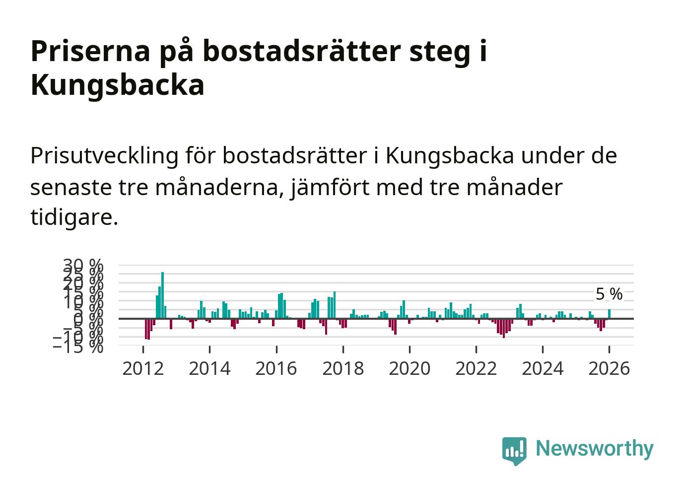 Priserna på bostadsrätter har gått upp i Kungsbacka kommun. Medelpriset på försäljningarna under de senaste tre månaderna visar på en uppgång med 5 procent.