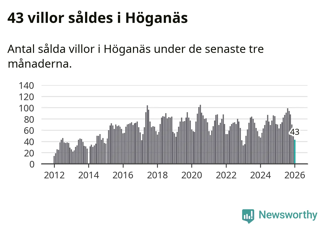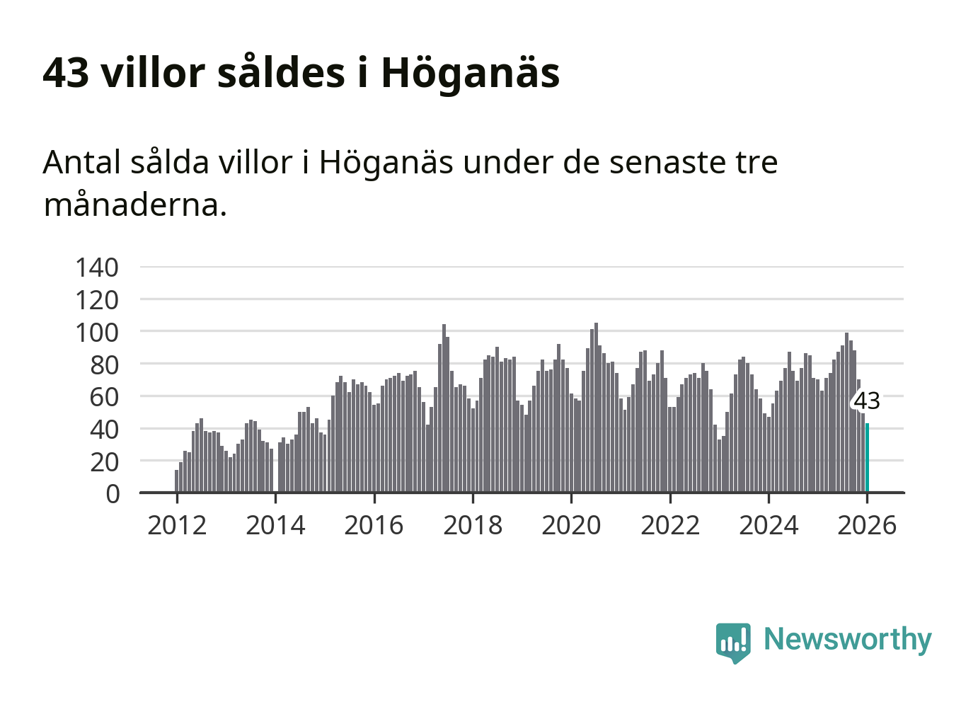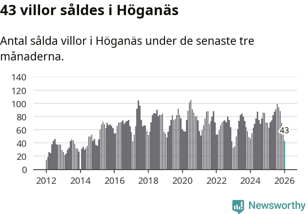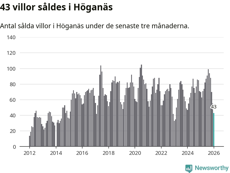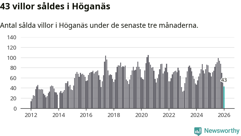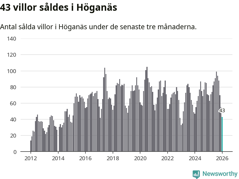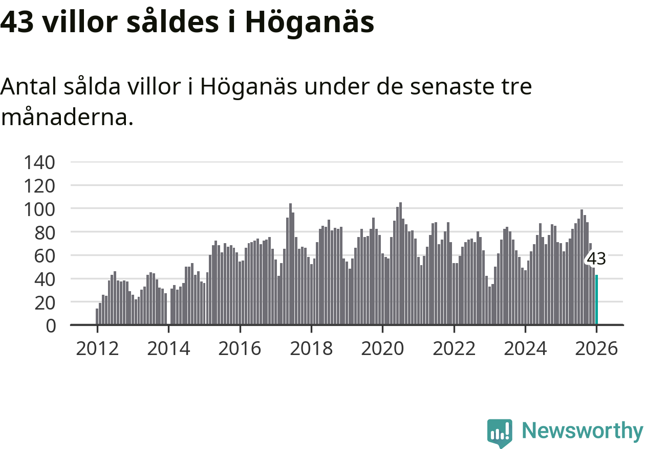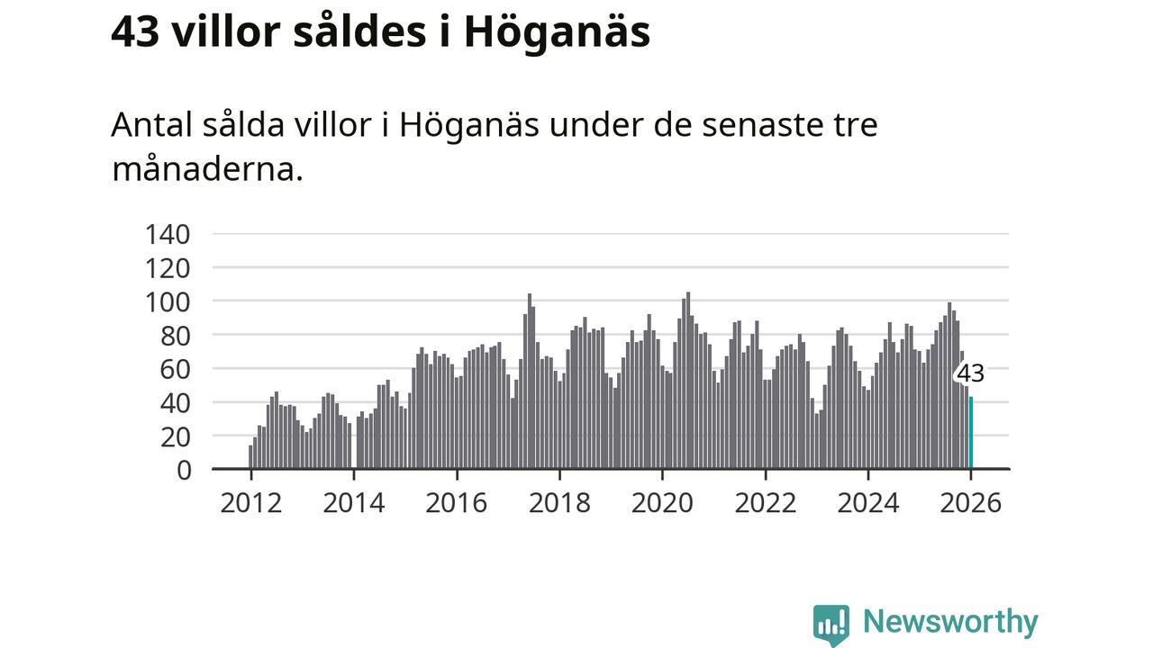 Mellan november och januari såldes 43 villor i Höganäs kommun. Det är relativt få sett till aktiviteten på bostadsmarknaden i kommunen under de senaste tolv månaderna, samt det historiska snittet för den här tiden på året.