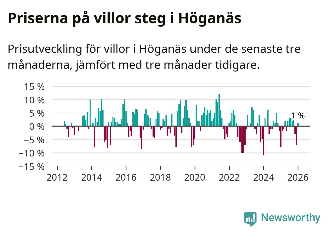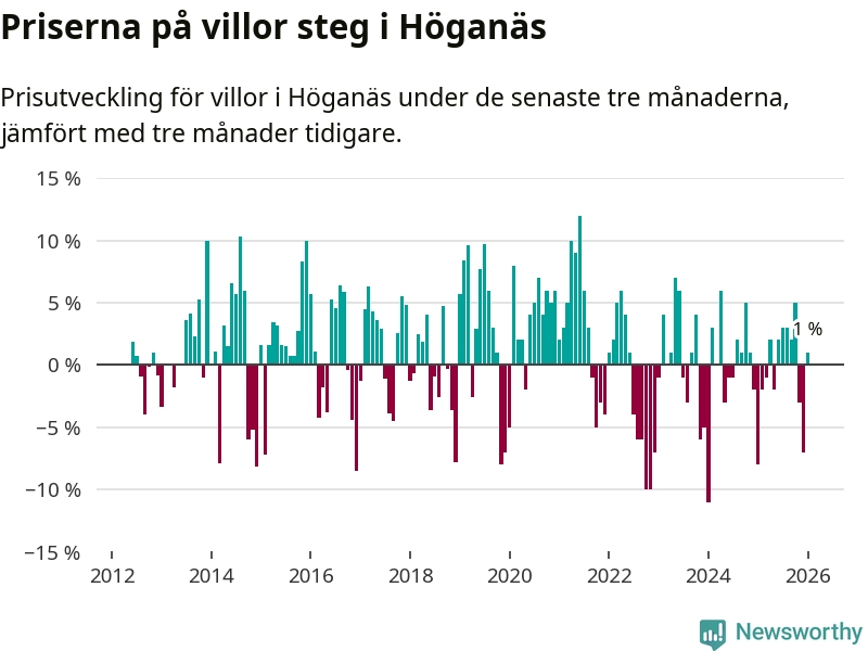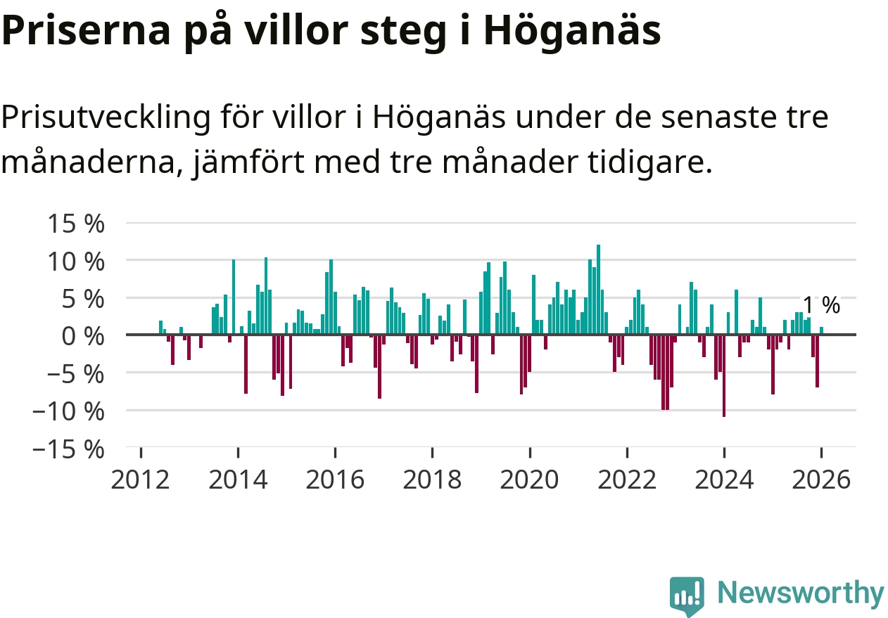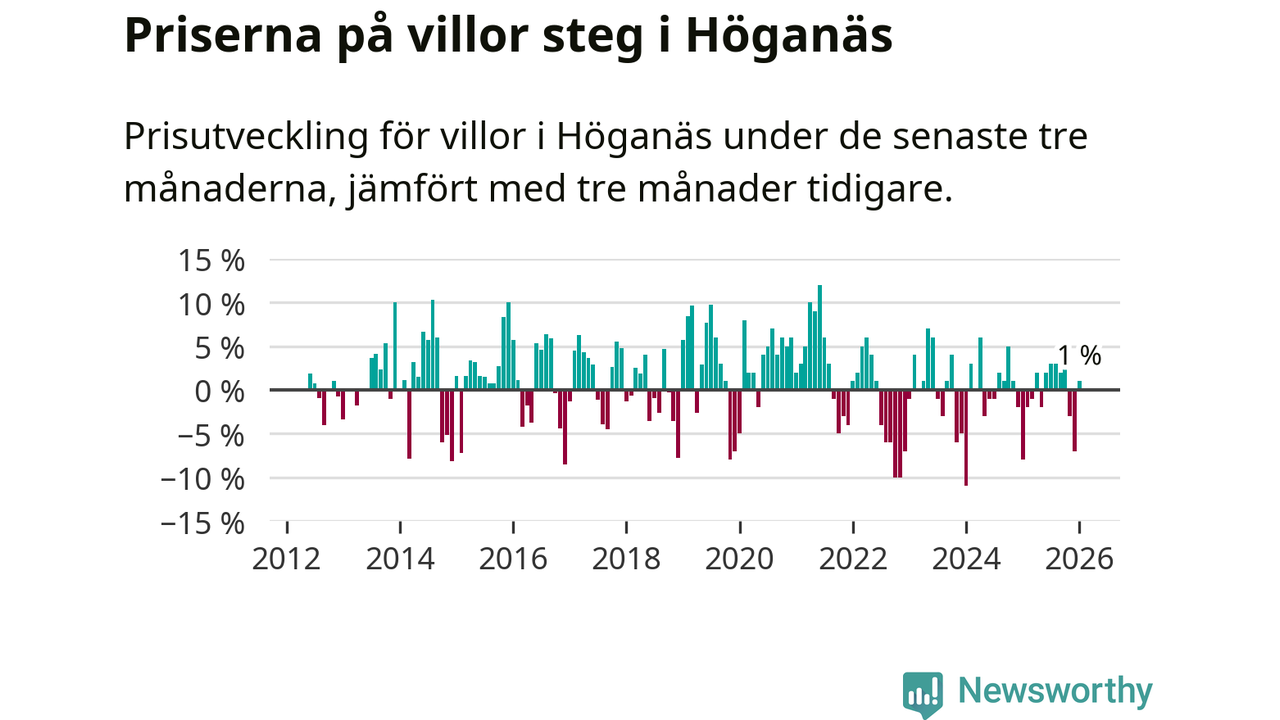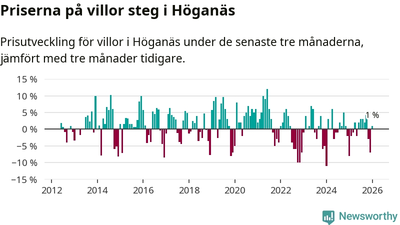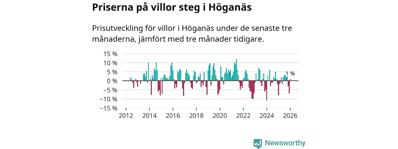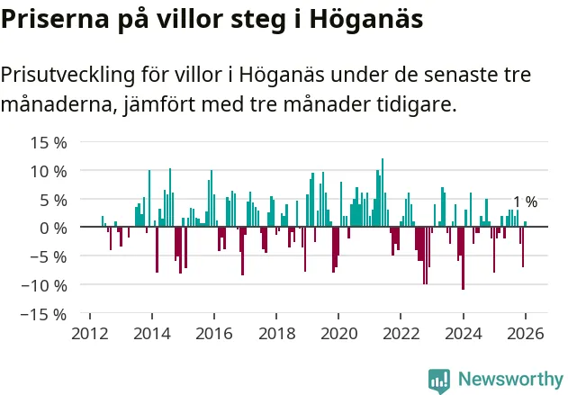 Statistiken visar även på en prisuppgång i Höganäs kommun. Medelpriset på försäljningarna av villor i kommunen var 1 procent högre än för tre månader sedan. I hela Skåne däremot sjunker villapriserna. I hela länet noterades en prisnedgång på 3 procent.