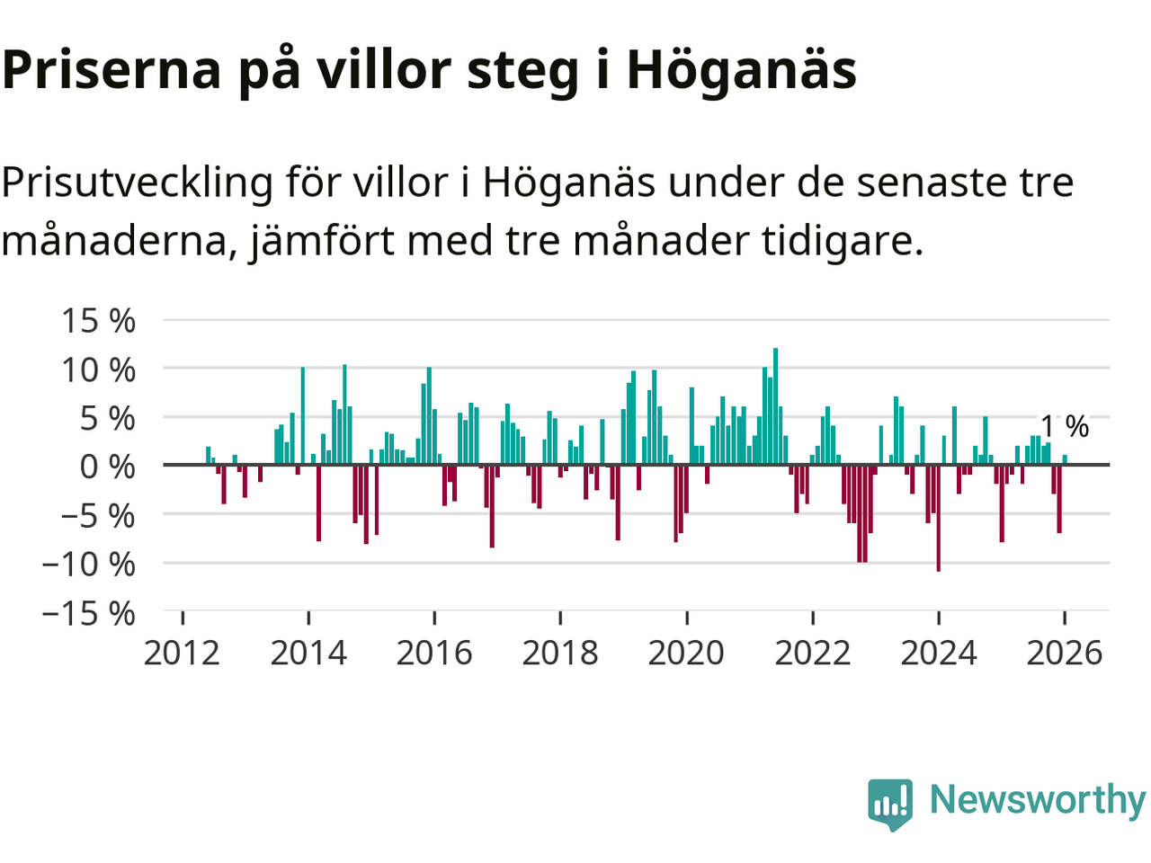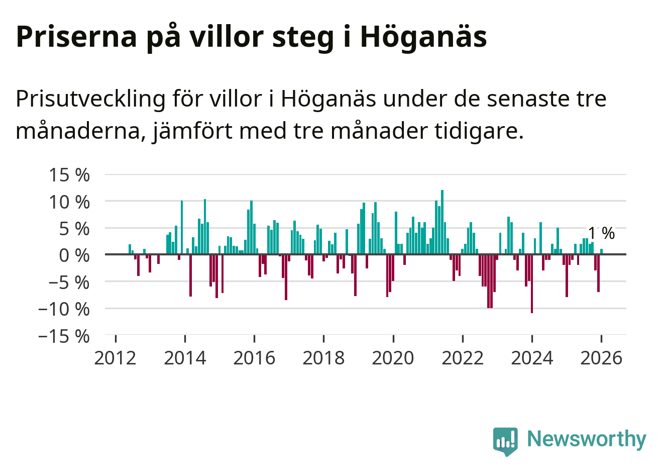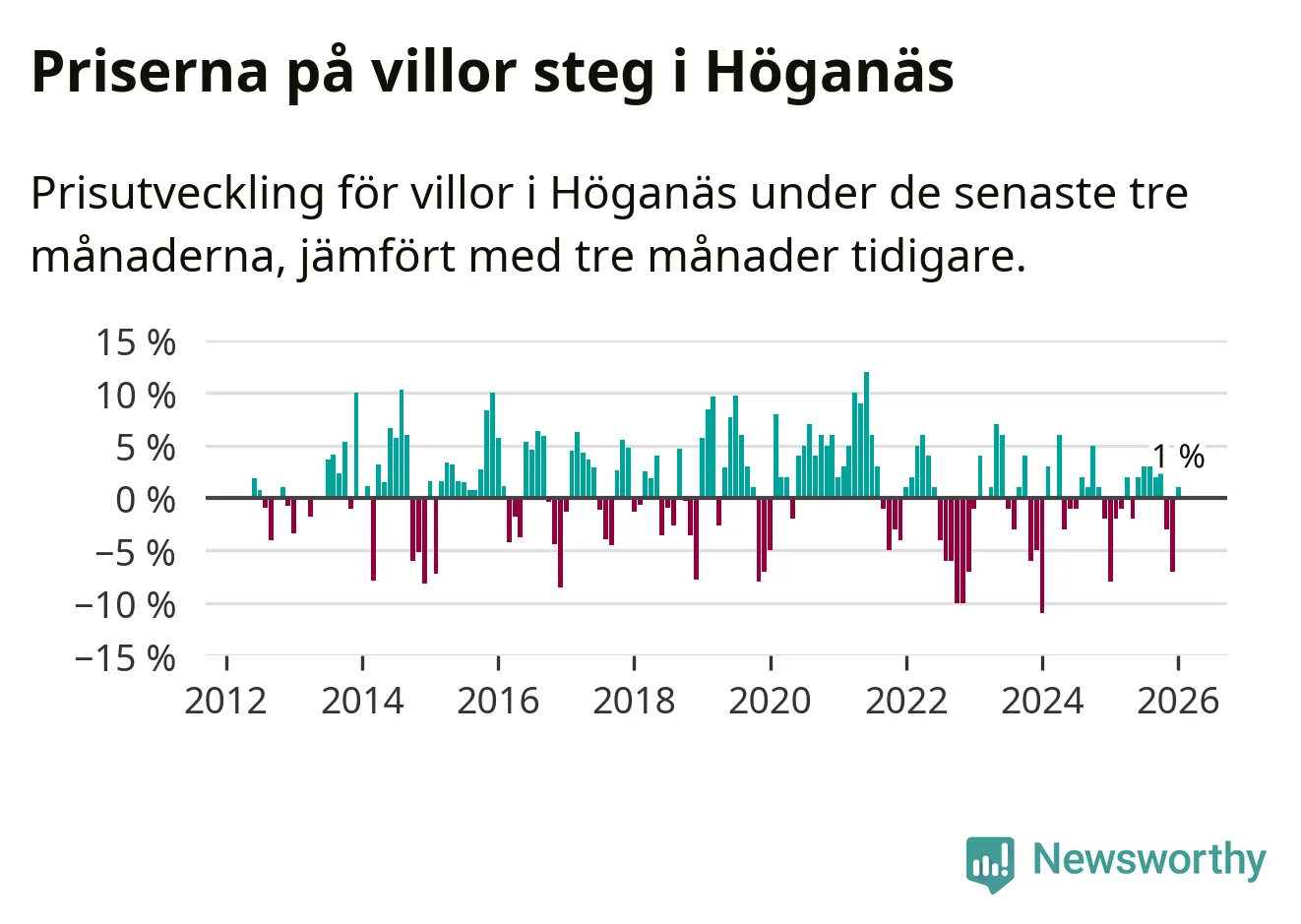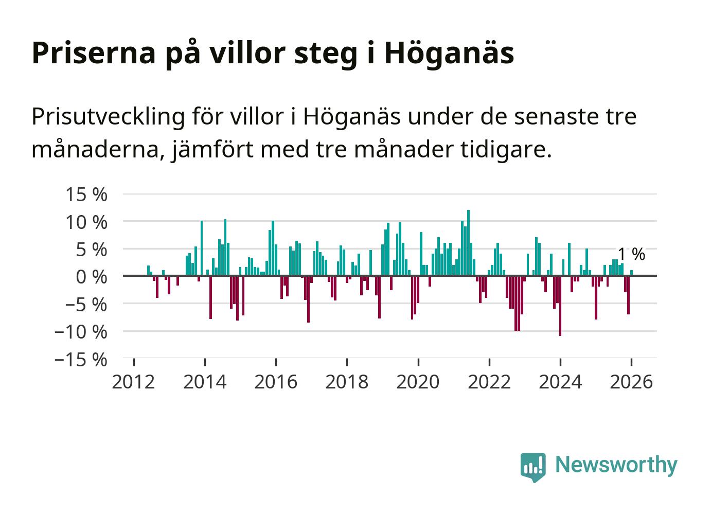 Statistiken visar även på en prisuppgång i Höganäs kommun. Medelpriset på försäljningarna av villor i kommunen var 1 procent högre än för tre månader sedan. I hela Skåne däremot sjunker villapriserna. I hela länet noterades en prisnedgång på 3 procent.