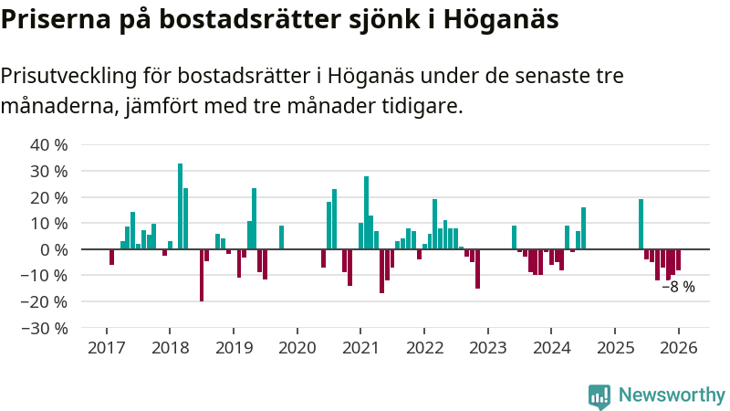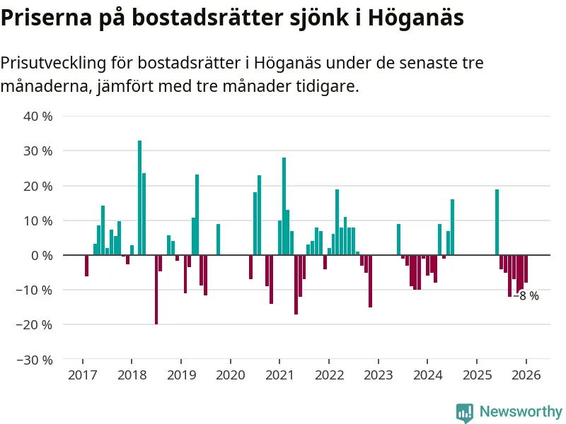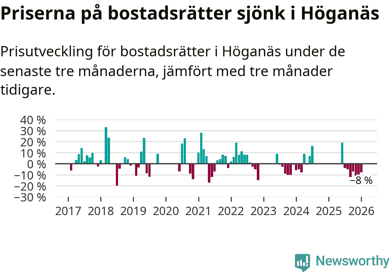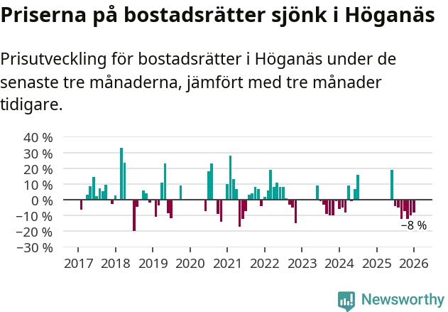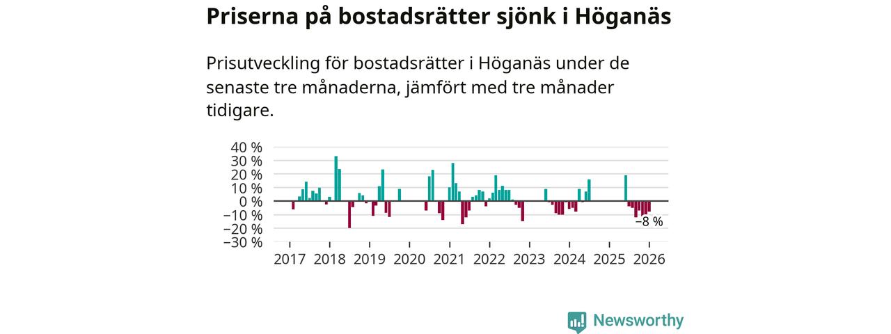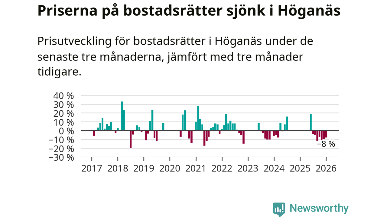 Priserna på bostadsrätter har gått ner i Höganäs kommun. Medelpriset på försäljningarna under de senaste tre månaderna visar på en nedgång med 8 procent.