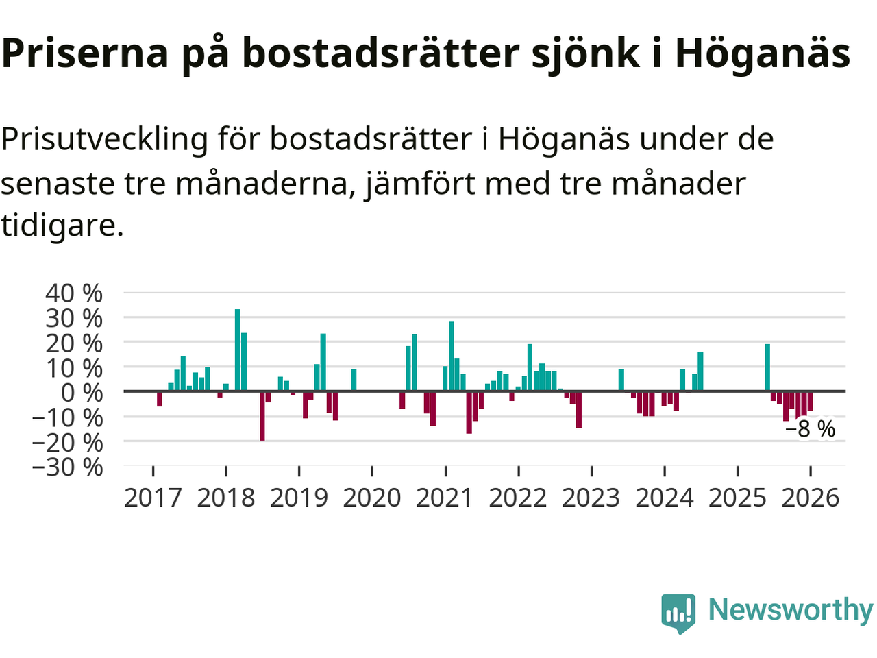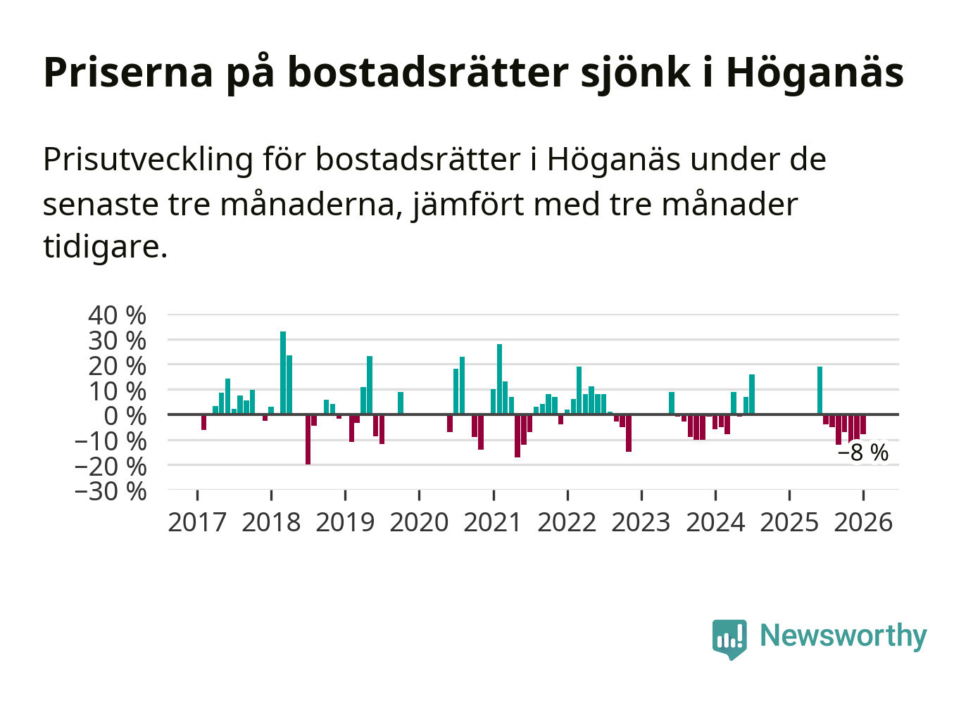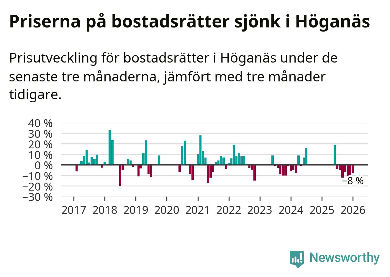 Priserna på bostadsrätter har gått ner i Höganäs kommun. Medelpriset på försäljningarna under de senaste tre månaderna visar på en nedgång med 8 procent.